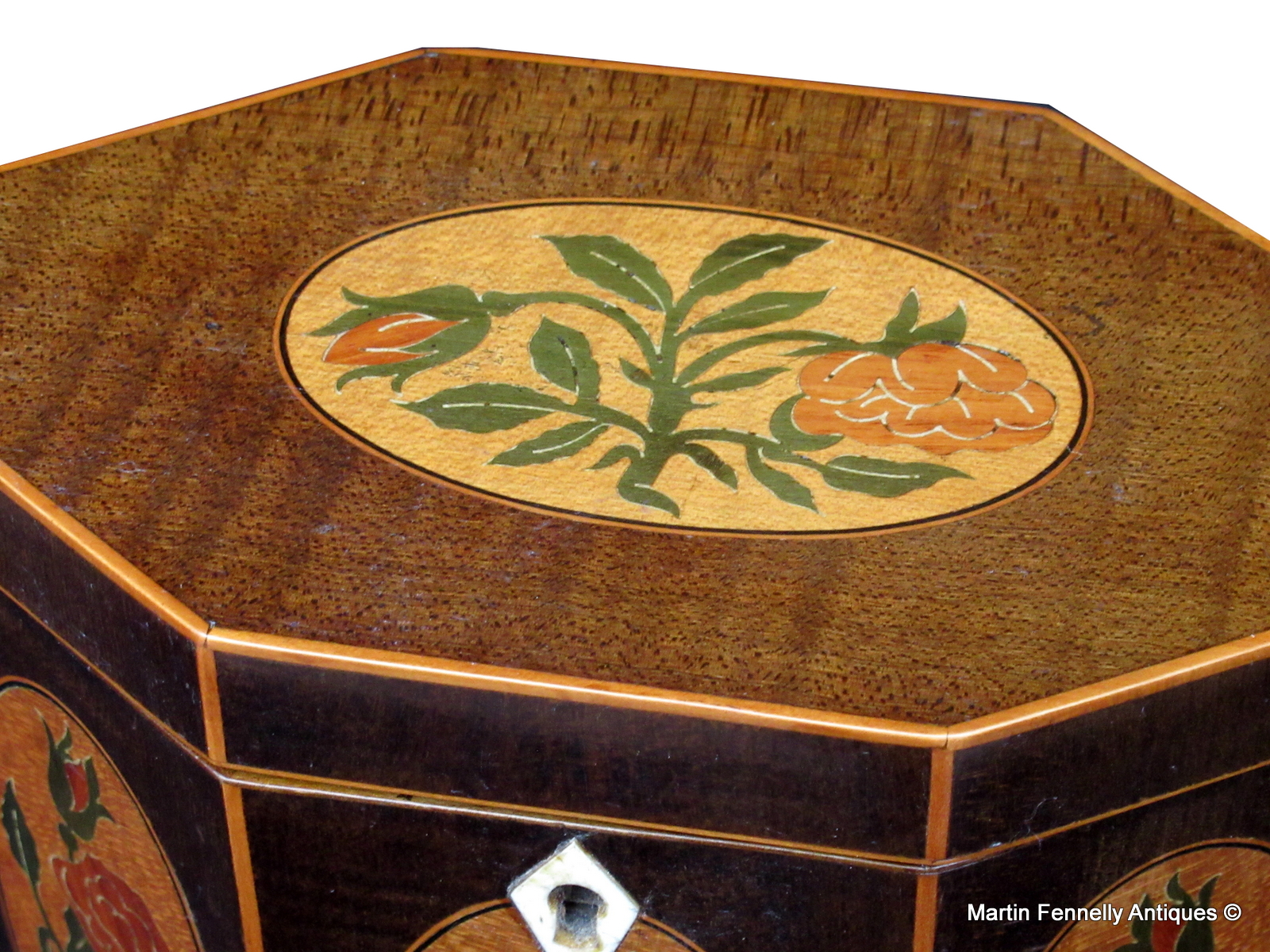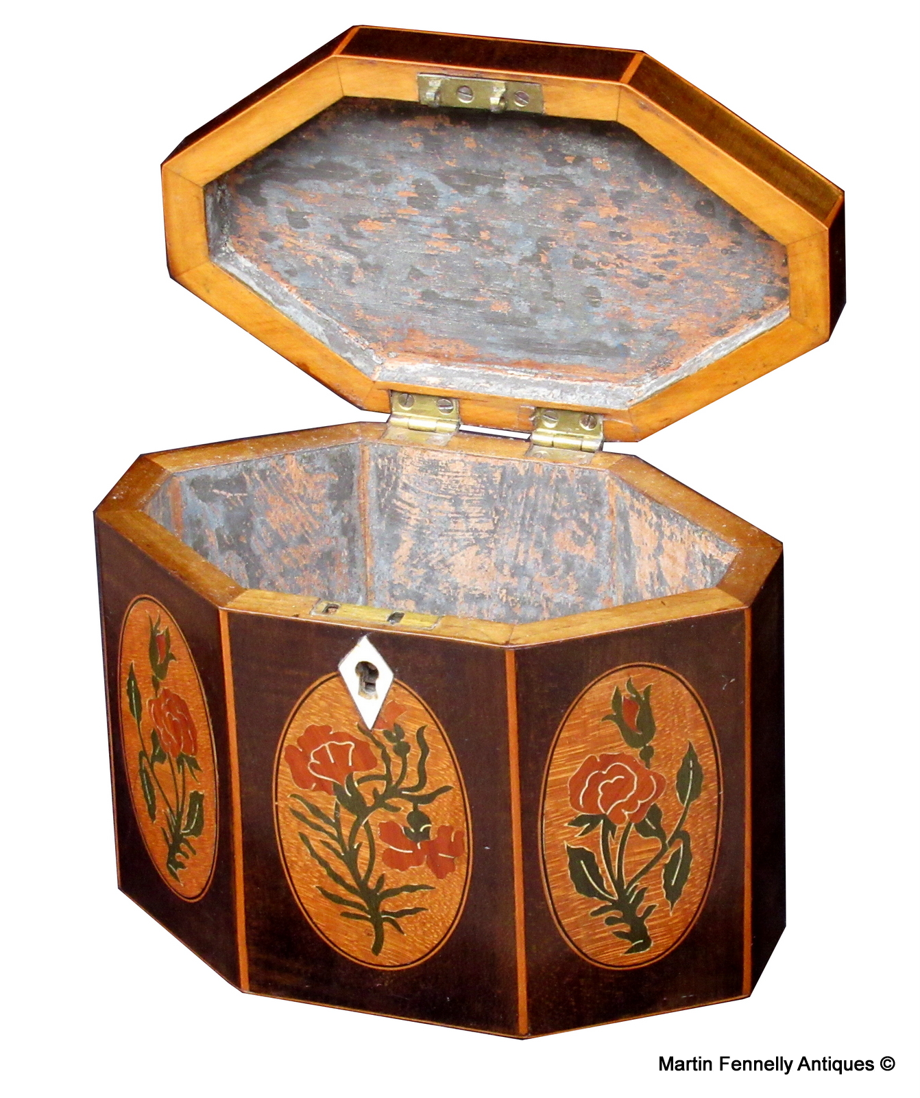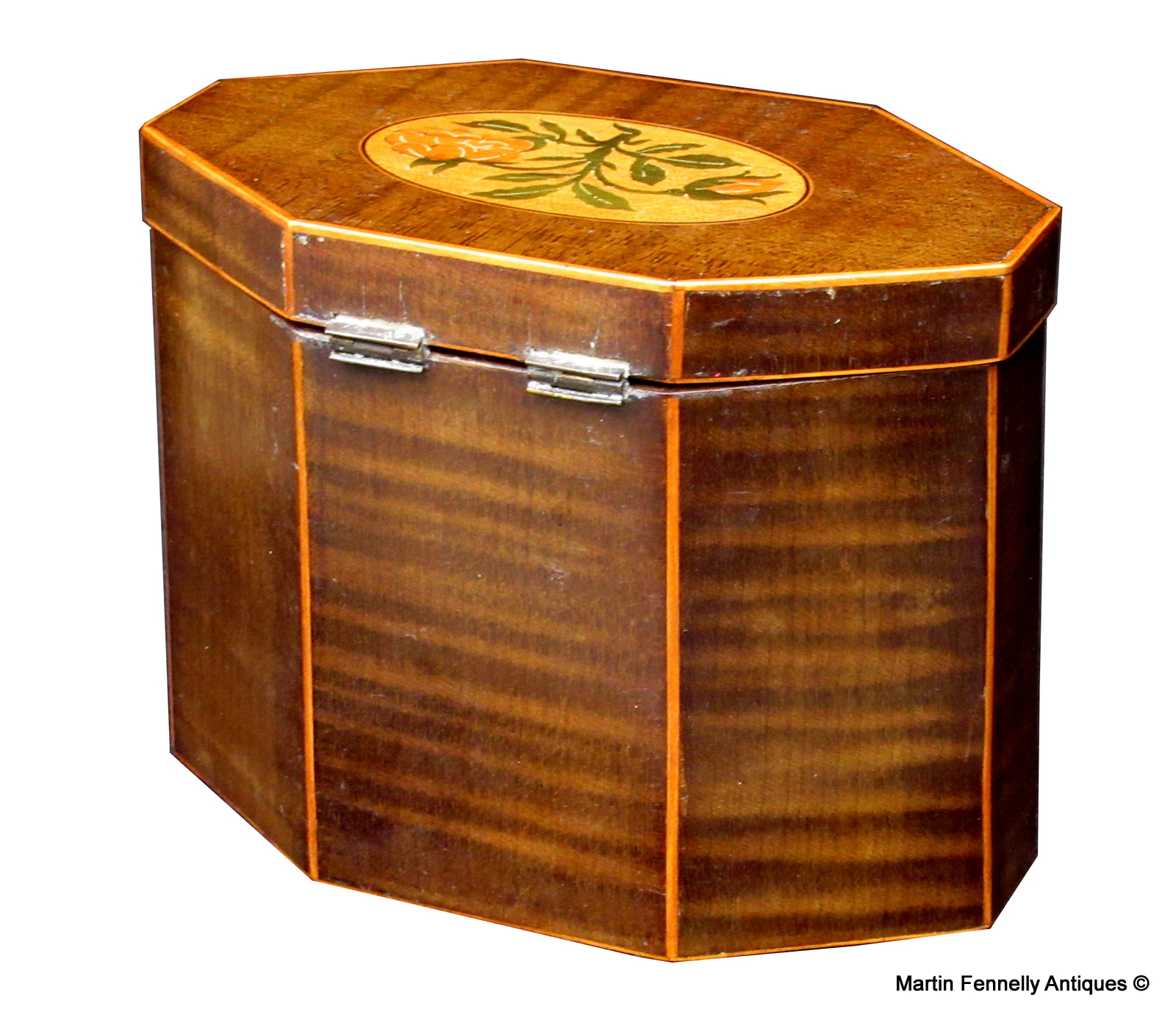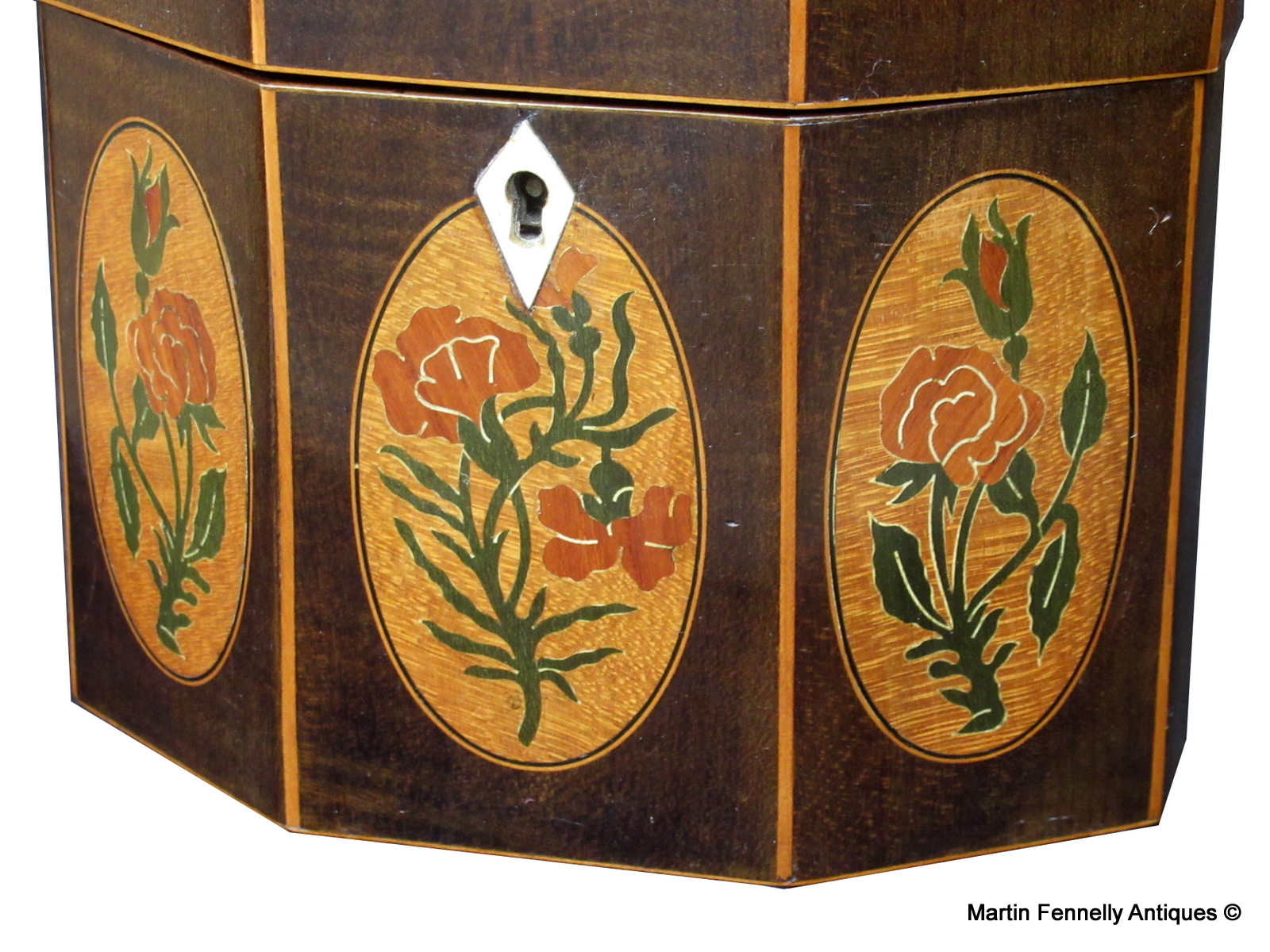 This English Tea Caddy dates to The Georgian Period and was made Circa 1780. It is a superb and rather rare hexangonal shaped Caddy. It is constructed from fiddle back Mahogany, Boxwood Stringing, and the top and front panels are inlaid. The oval panels are in Satinwood and the floral displays are in Rosewood, Ebony and a dark Ebony stringing framing the ovals.The escutcheon is in ivory. This is a wonderful Tea Caddy with a very early date.