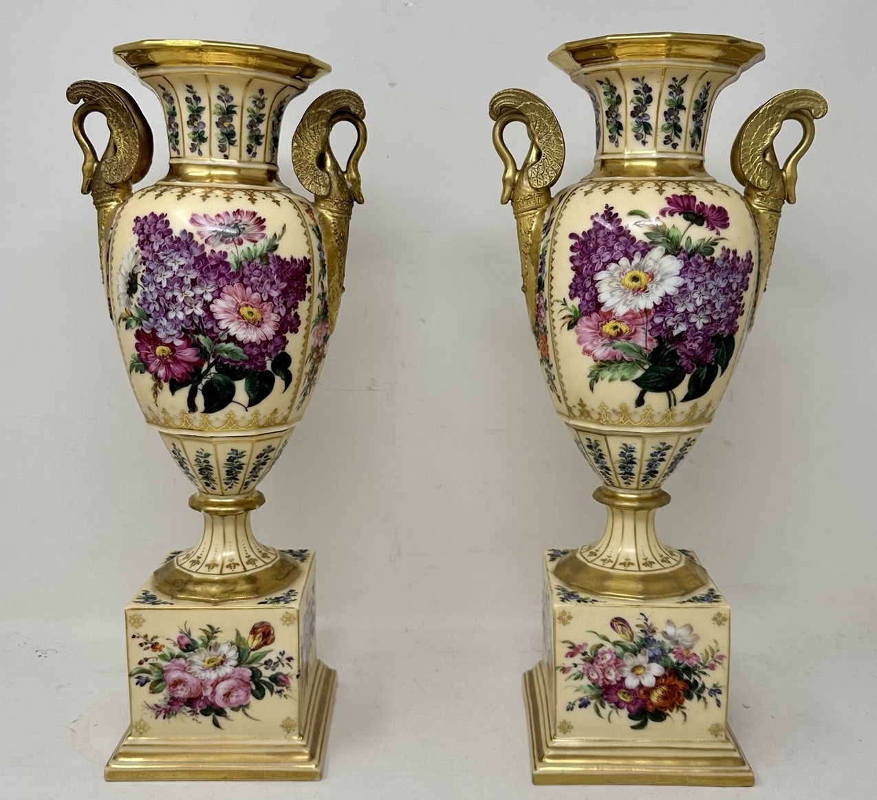Superb Pair French Sevres style Soft Paste Hand Decorated pale yellow ground Porcelain and gilt mounted twin swan neck scroll handle Table or Mantle Urns of traditional form, of outstanding quality and quite generous proportions, made during the first half of the Nineteenth Century.