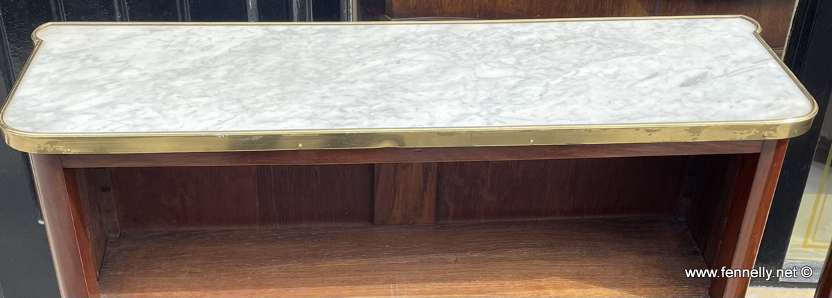 These are a lovely and useful Pair of French open Bookcase dating to Circa 1910. They are Mahogany with Oak backing and superb shaped marble tops which are finished with a brass band. The shelves which are adjustable are supported on 4 Brass decorated legs. The condition is very good with a deep rich patina and no losses to the marble.