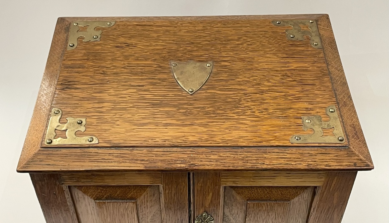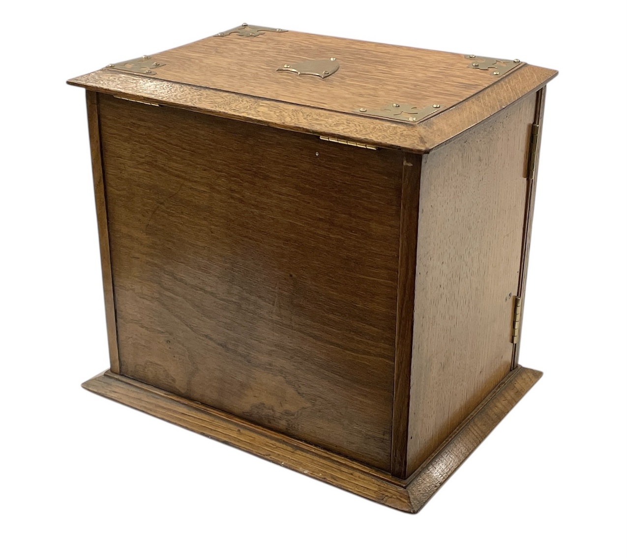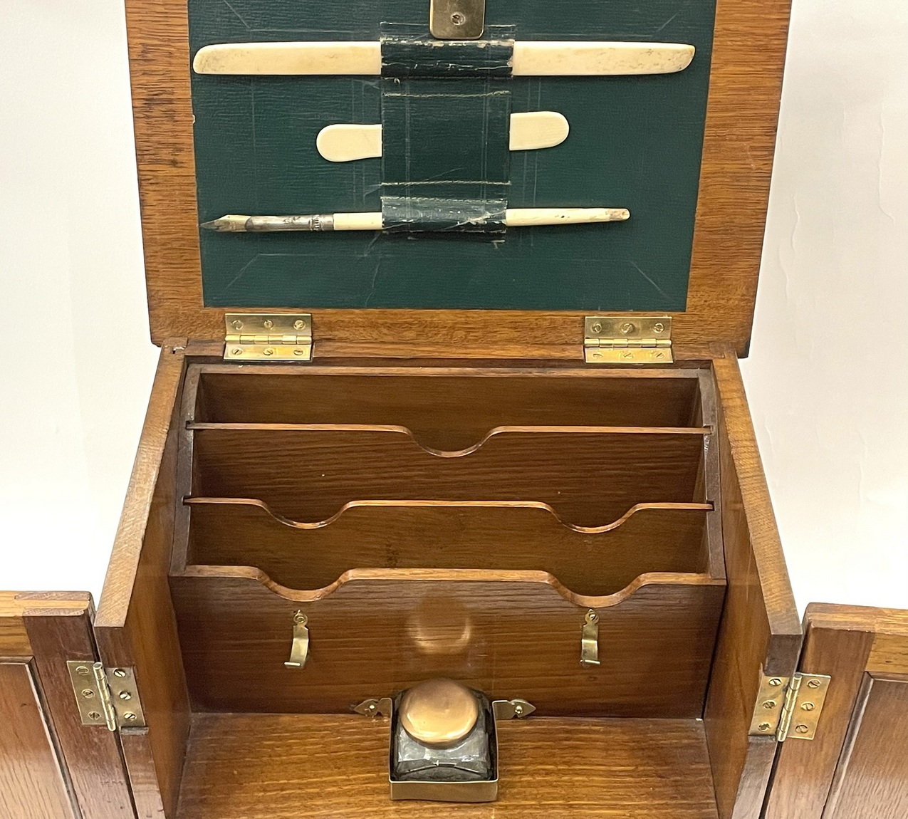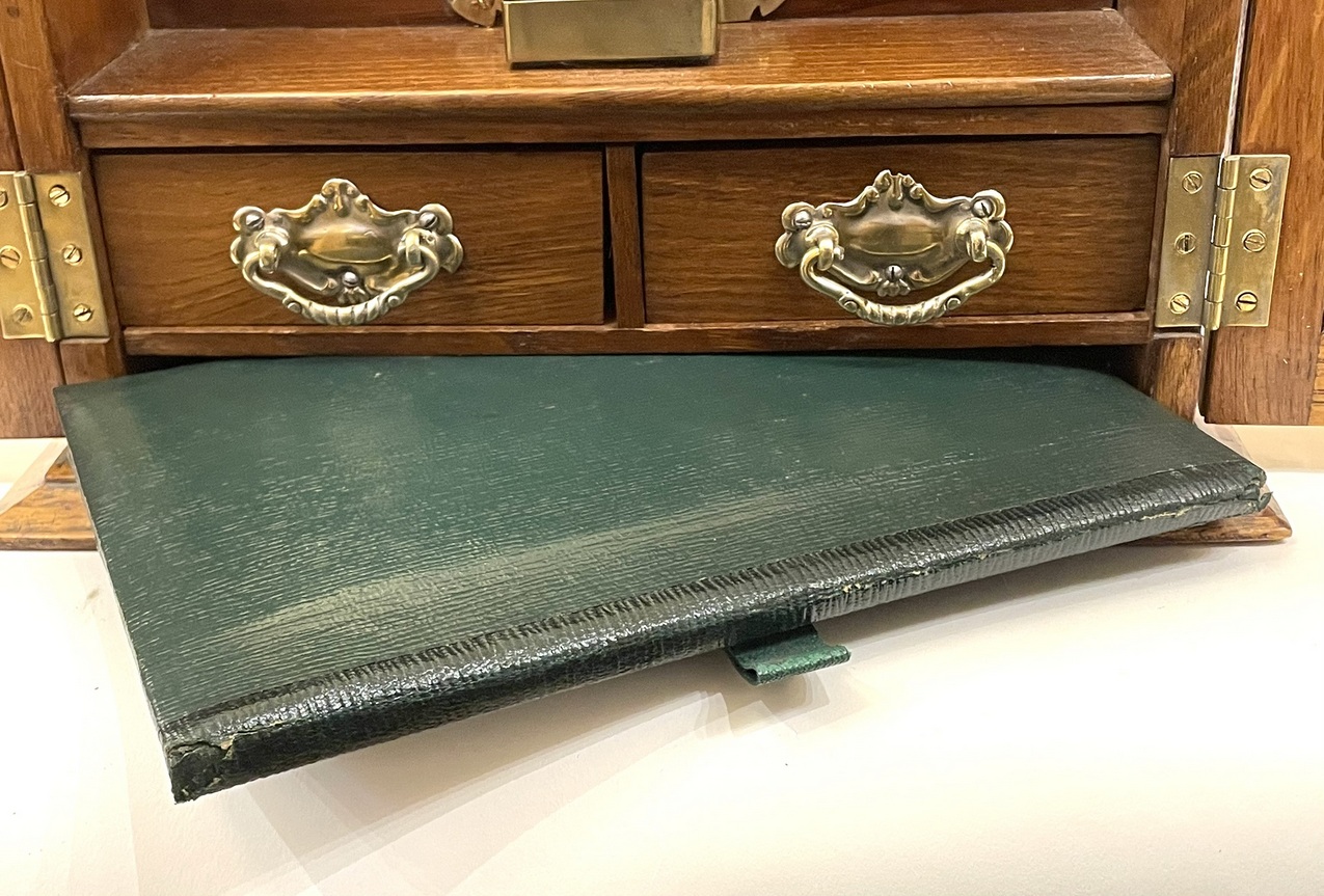 This is a rare and wonderful Edwardian Desk Cabinet. It is made from Oak with Brass mounts. It dates to Circa 1900 and is a beautifully constructed piece. The front top and front doors open to reveal a sectioned interior to include letters storage, pens, inkwell, storage drawers and blotting paper pad. This box was made in the UK Circa 1900. Ideal Gift.