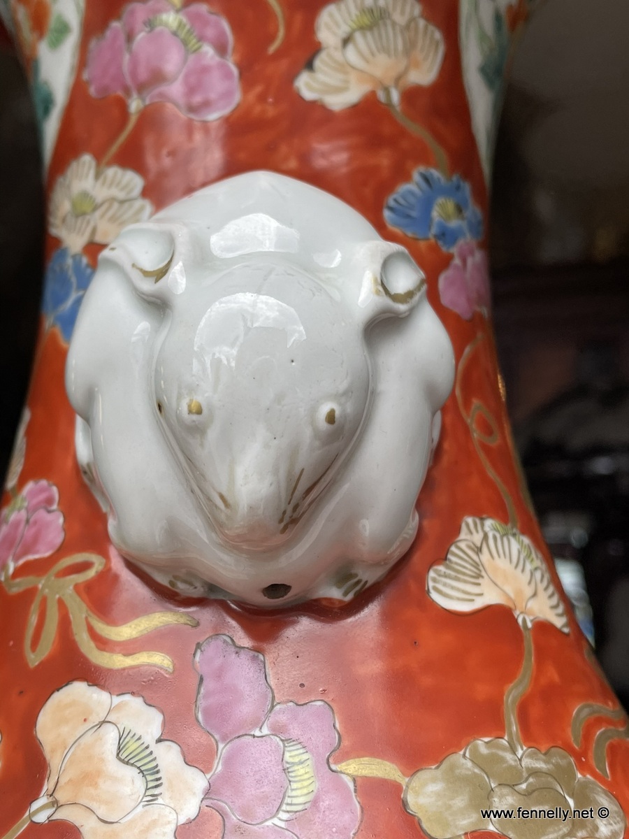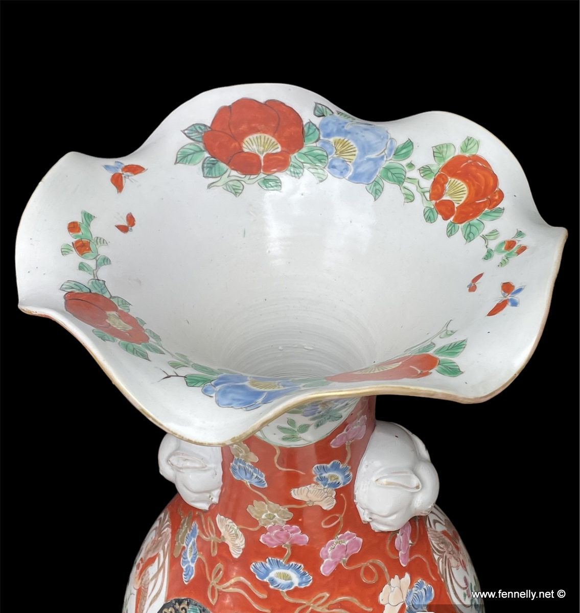 Large Pair of Japanese Flared Rimmed Vases with Rabbit Head Lateral Handles dating to Circa 1880. These are a great pair of Large Japanese vases depicting a Geisha entertaing with floral and Bird of Paradise detail. These are in great condition and vivid colours.