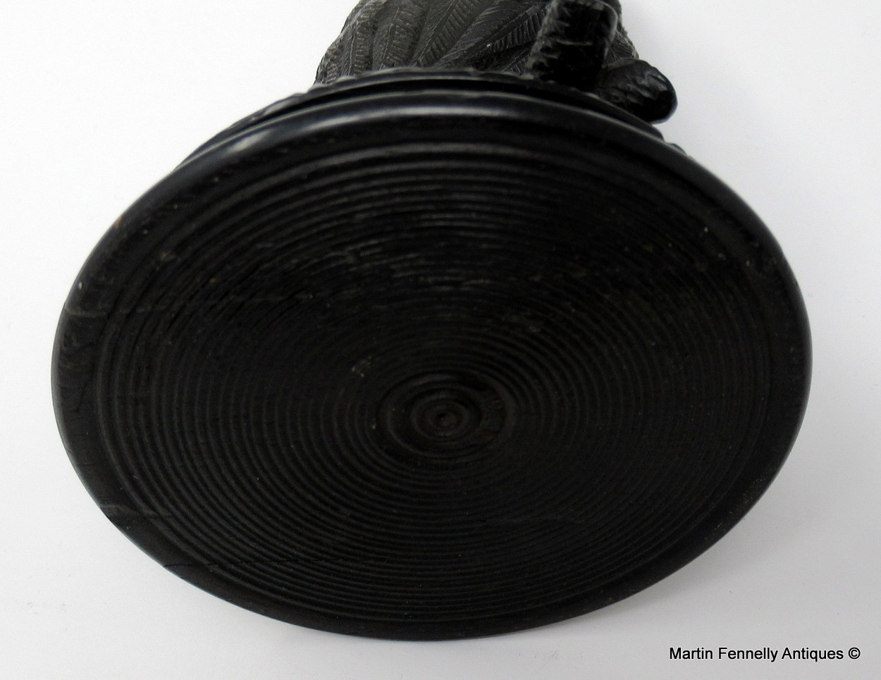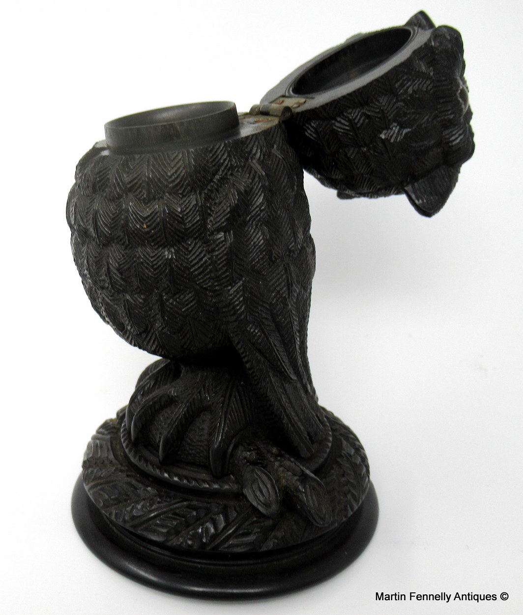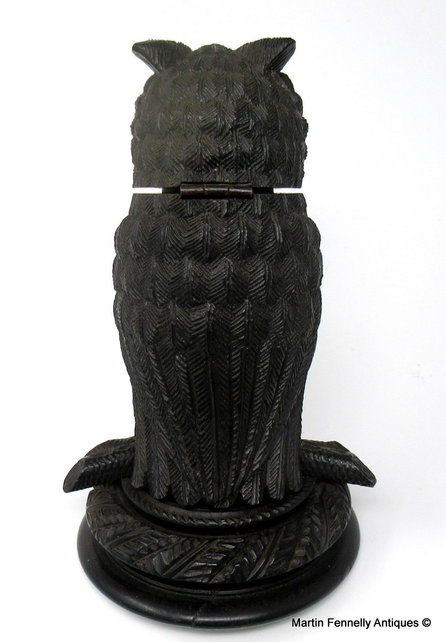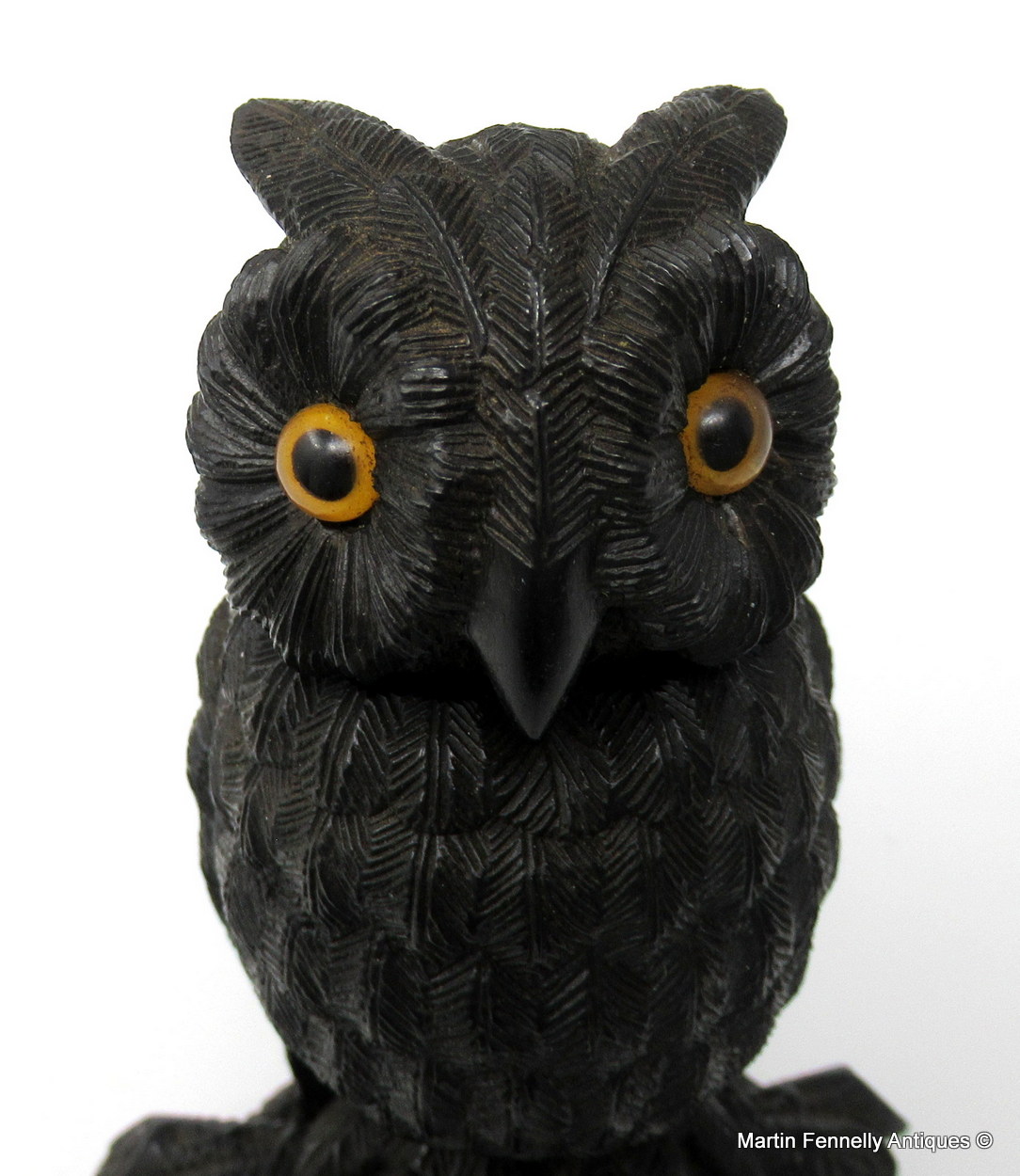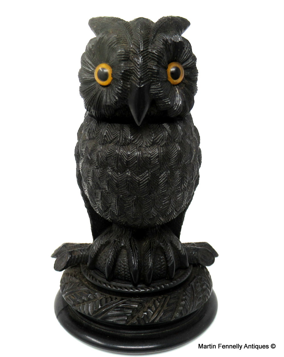 Fine and Rare Hand Carved Irish Bog Oak Figural Owl of Museum Quality and medium proportions, quite possibly by Cornelius Goggin. Made during the Mid Nineteenth Century.