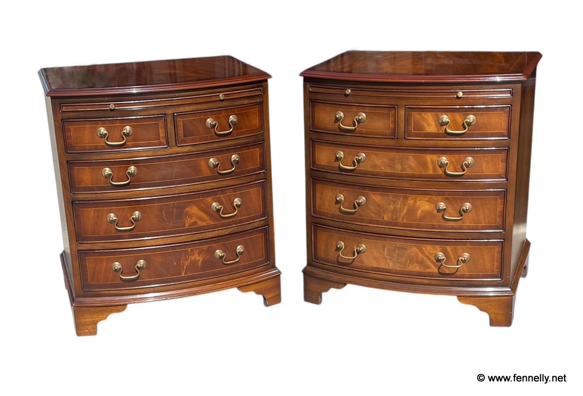This is a beautiful pair of Bow Fronted flame Mahogany Chests with slides in elegant Georgian style dating from the late 20th Century. The chests are masterfully crafted from gorgeous flame mahogany and the tops have superb crossbanded decoration. They each have 5 drawers for convenient storage and the useful addition of a slide in each. There are striking brass handles on each drawer and the drawers are oak lined, a sure sign of quality. These chests are very versatile and would look equally good in the bedroom as bedside chests or in the lounge as end tables at either end of your sofa. They were waxed by our master restorer and the condition is excellent.