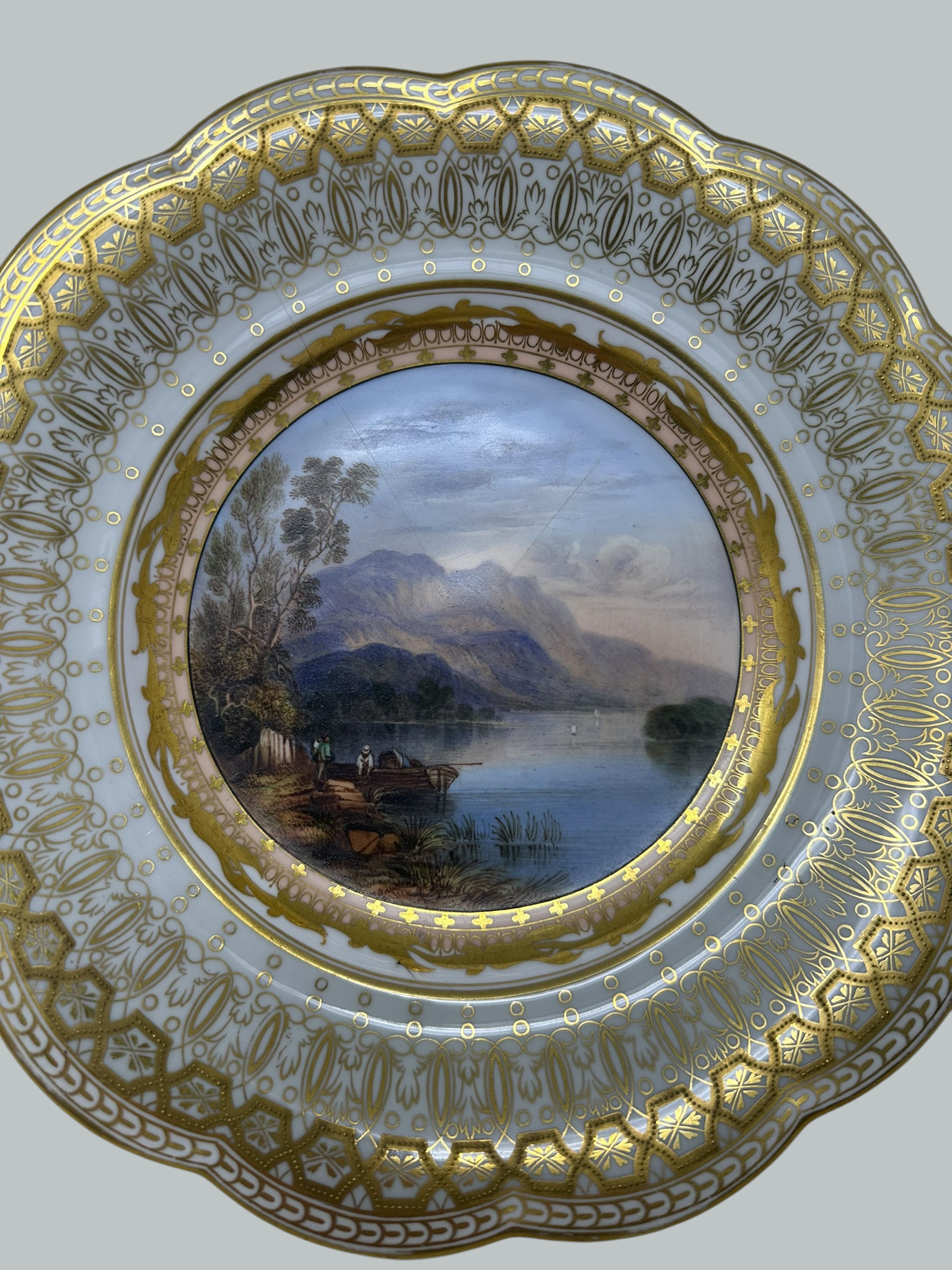 Rare pair of hand painted Davenport Porcelain Coalport Cabinet or Cake Plates of outstanding quality and wonderful Irish interest. Last quarter of the Nineteenth Century. Each central reserve superbly hand painted depicting fisherfolk and fishing boats in the Lakes of Killarney, Kerry, Ireland with mountainous views and cloudy skies in the background. The outer shaped edge borders with exceptional lavish tooled 24ct gilding. Raised on triangular stands with gilding detail. Condition: Perfect with no restoration or imperfections,