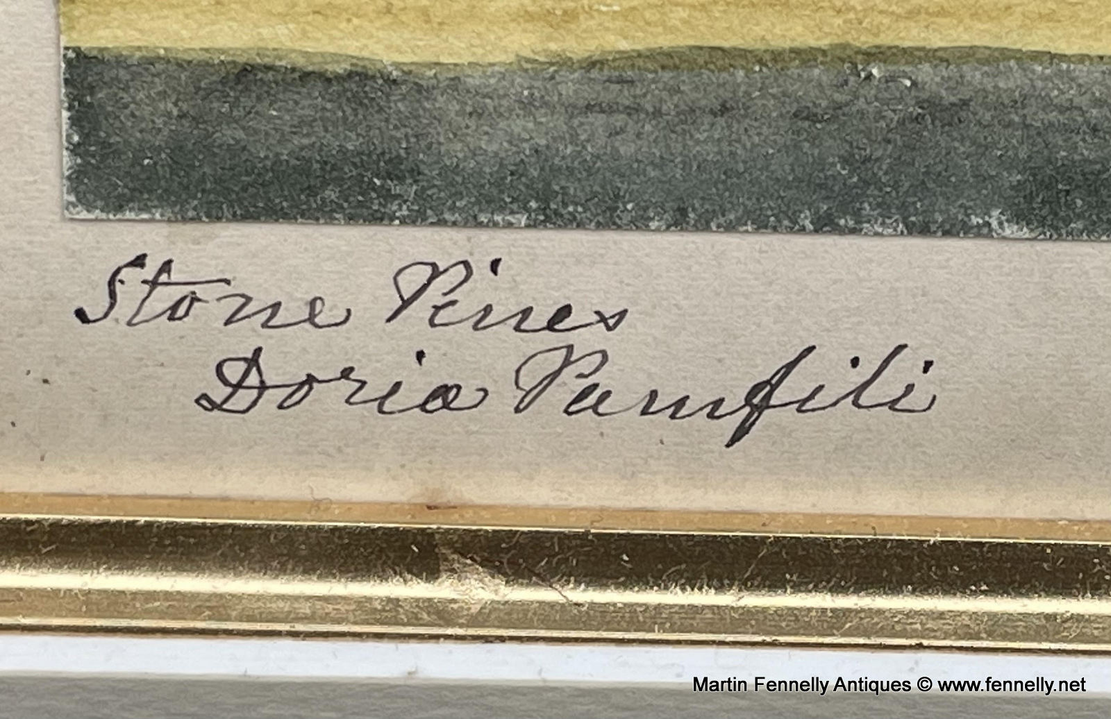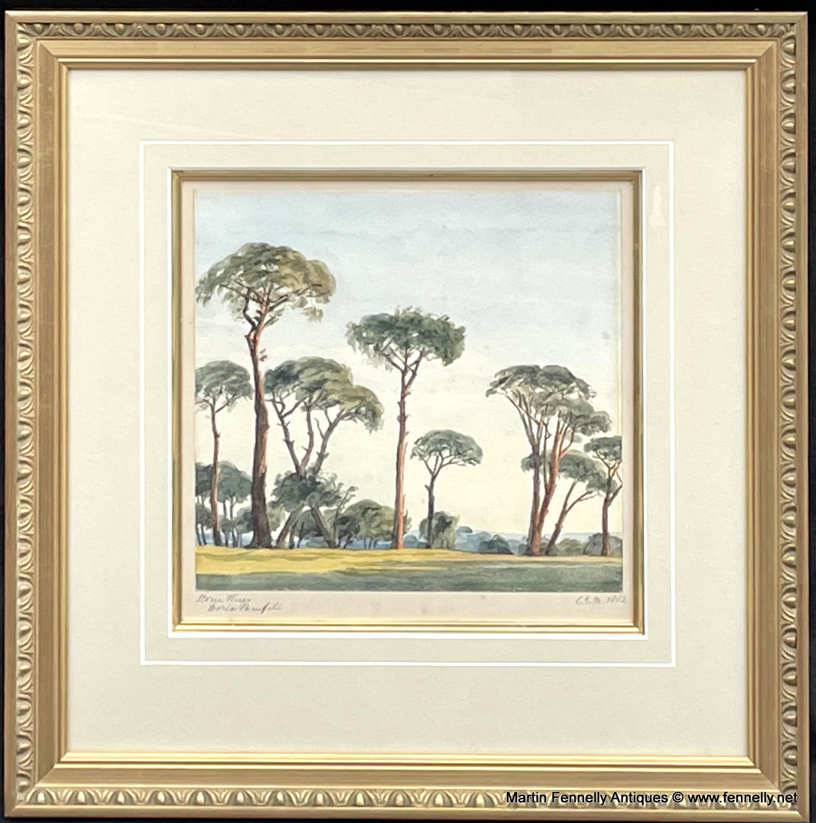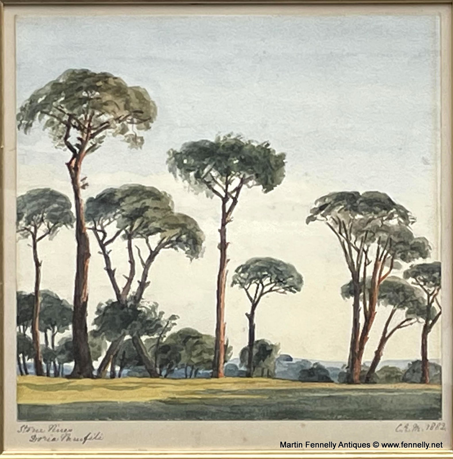 This Watercolour of The famed Gardens around Villa Doria Pamphili in Rome is a very beautiful painting. It is Framed, Signed in monogram CEM lower right and wonderfully executed. The Gardens of Villa Doria Panphile are famed in Europe and today are the largest Public Gardens in Rome. The pines are famed in history and many images of this serene location exist.