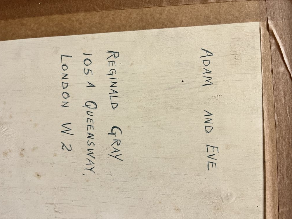 ‘Adam and Eve’ dated 1960 and signed – Tempera on Panel – by Reginald Gray (1930-2013) was an Irish portrait artist. He studied at The National College of Art (1953) and then moved to London, becoming part of the School of London led by Francis Bacon, Lucian Freud and Frank Auerbach. In 1960, he painted a portrait of Bacon which now hangs in the permanent collection of the National Portrait Gallery in London. Reginald Gray’s art is very distinctive, becoming very sought after and his association with Bacon and Freud suggests a possible/probable excellent investment.