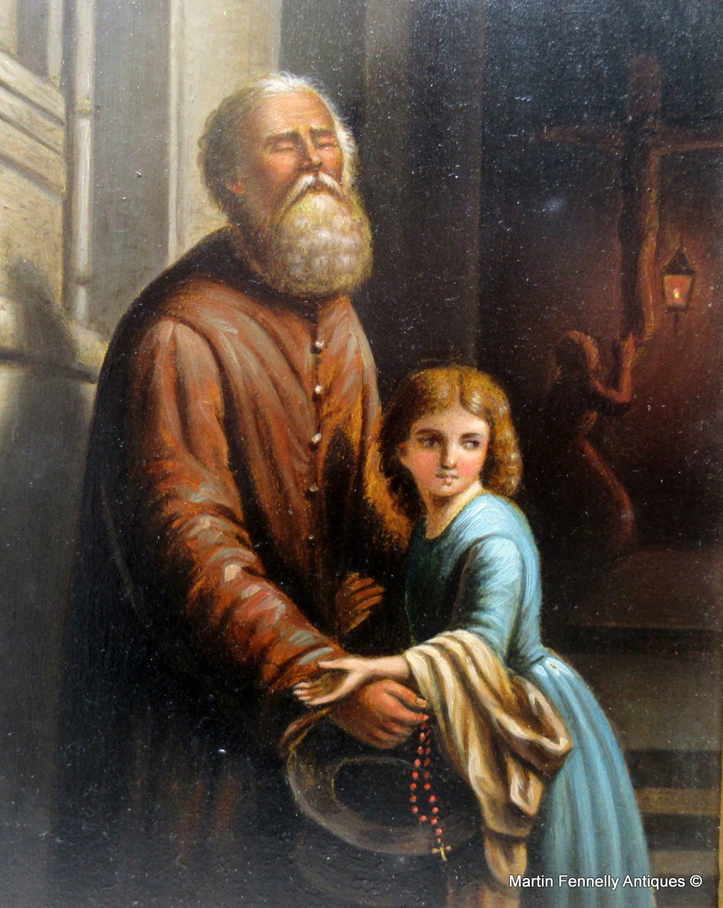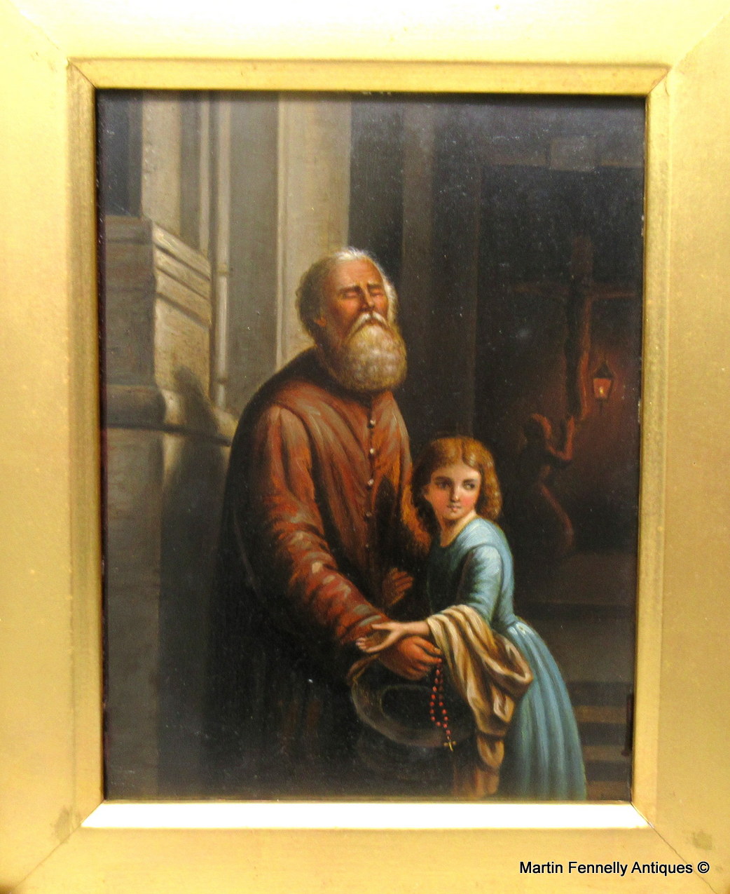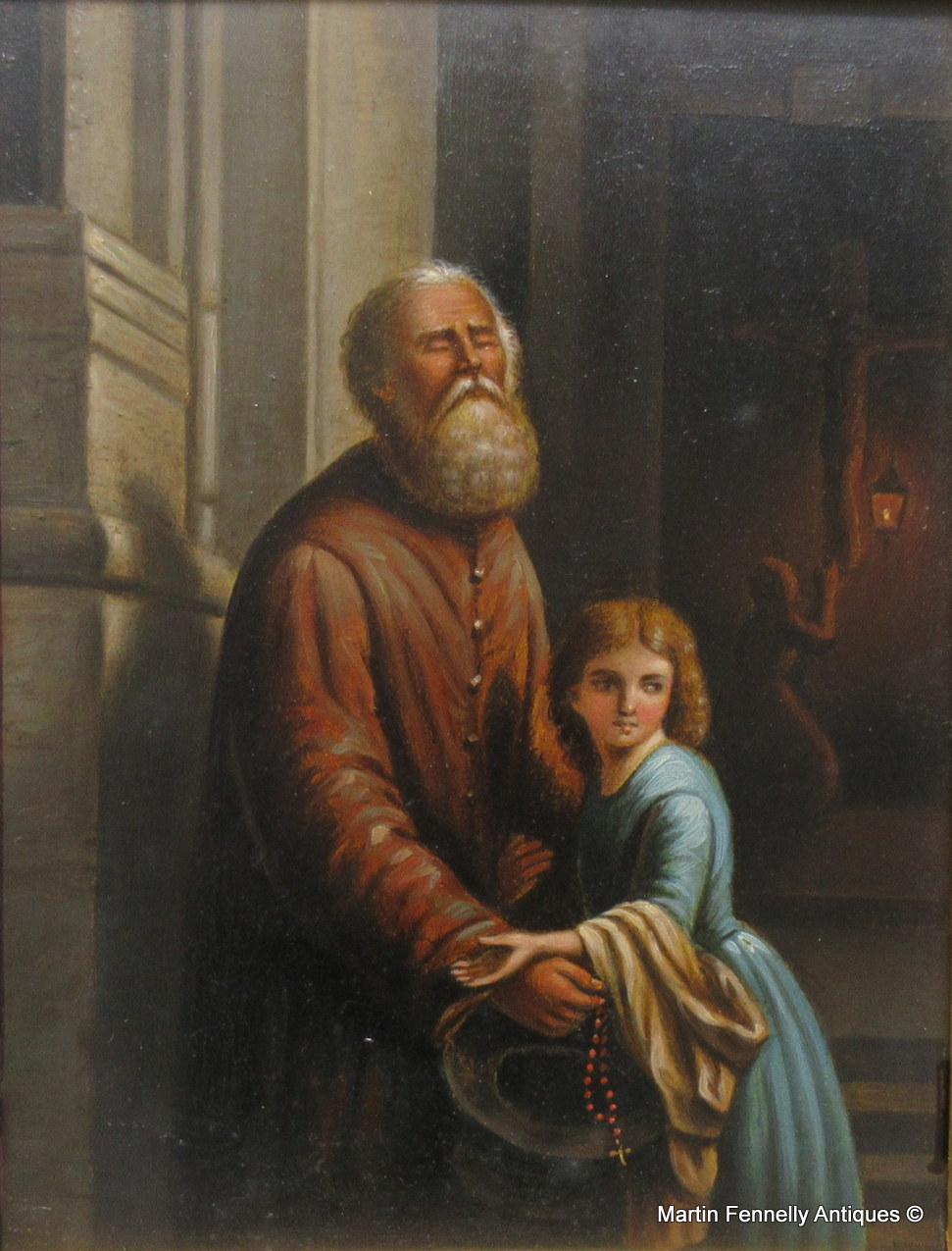 A blind bearded Begging Man standing outside a Church and a pretty young lady seems to be protecting him, his right hand holding a Rosary Beads and a Hat. The interior depicts a figure kneeling in front of a Crucifix.