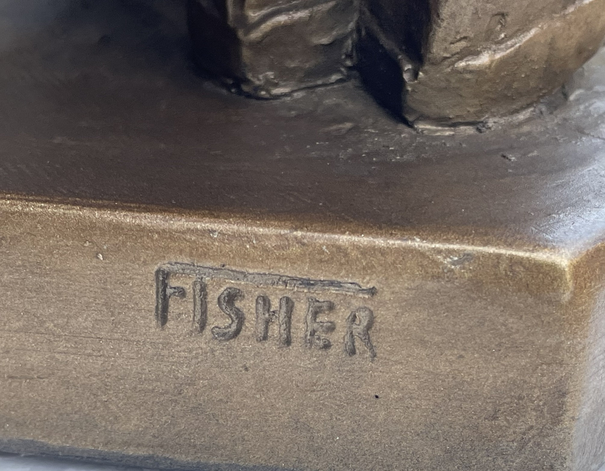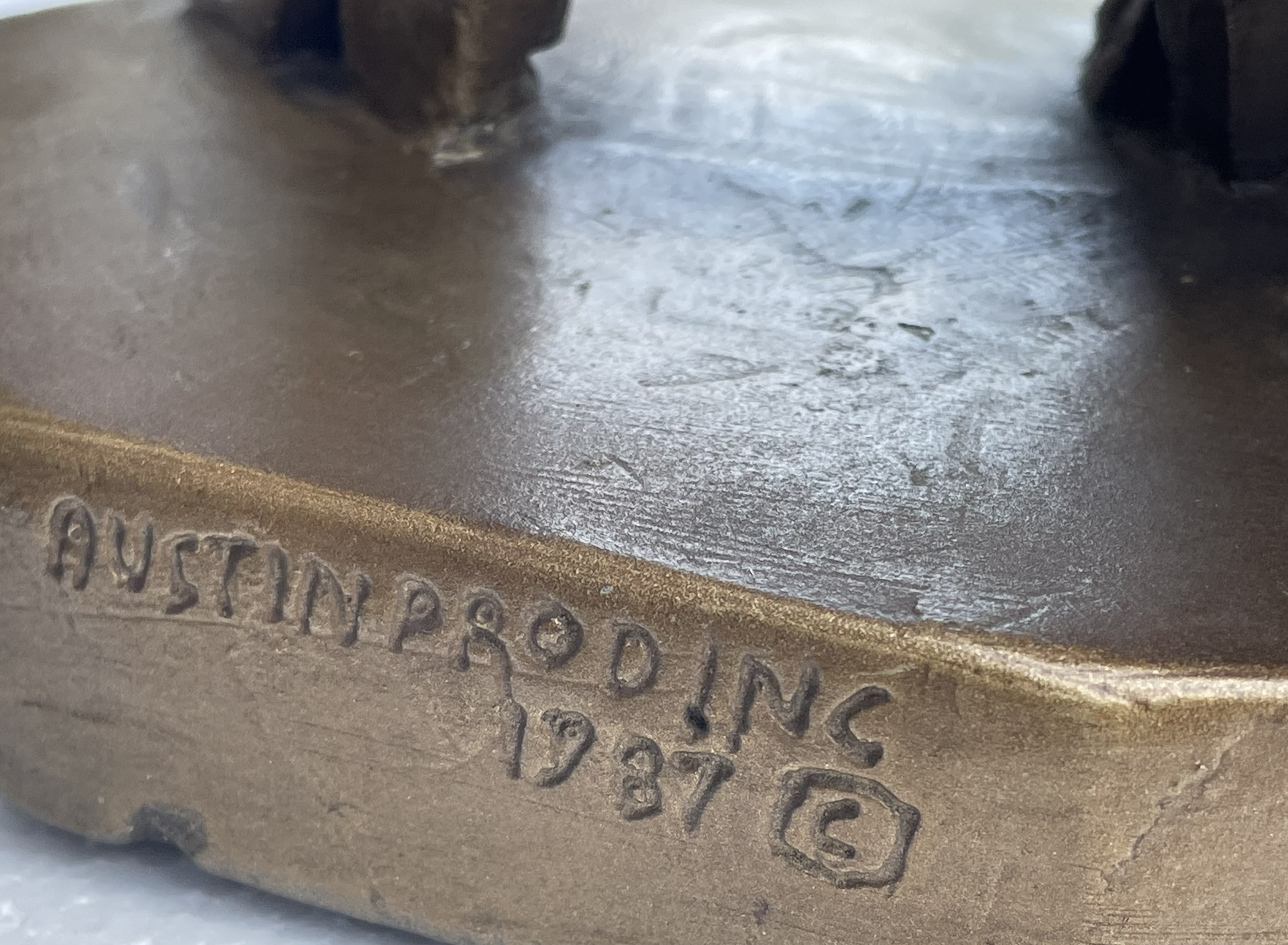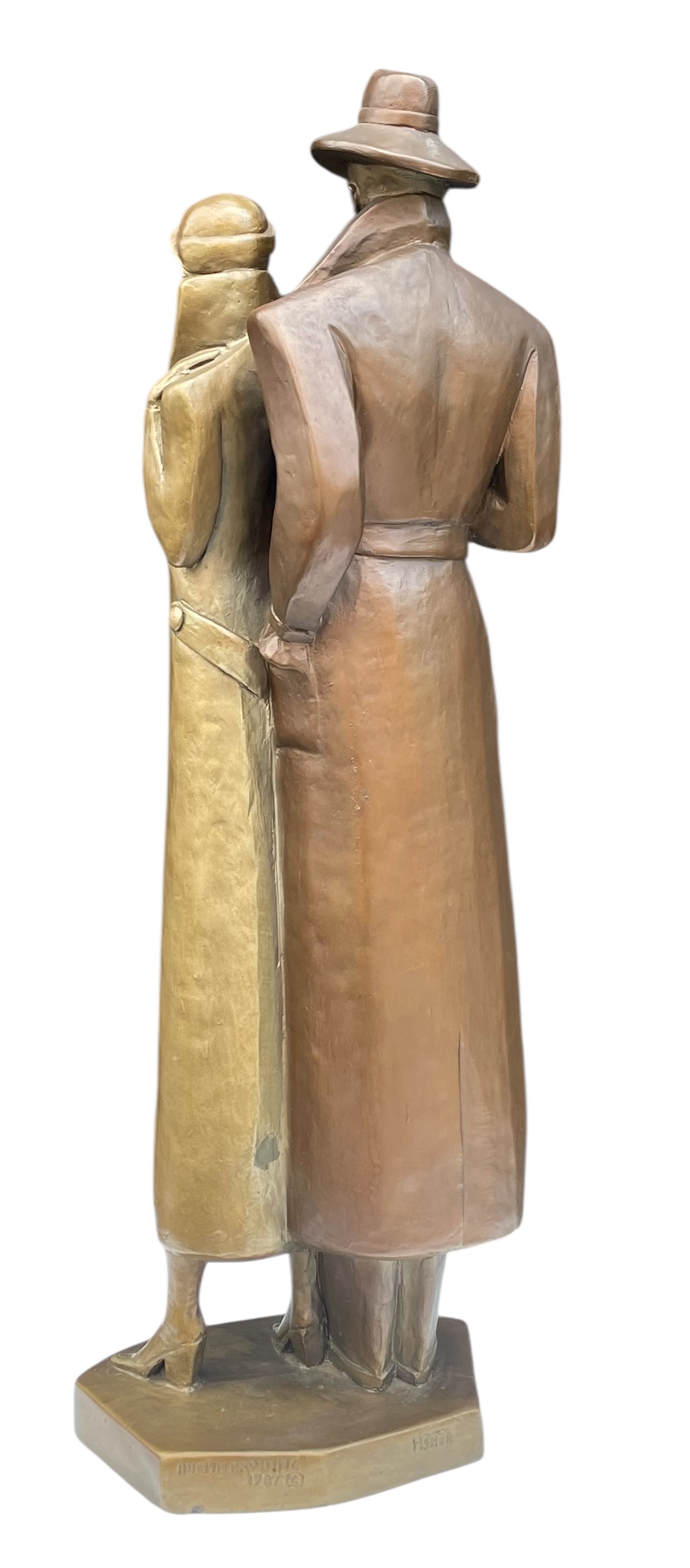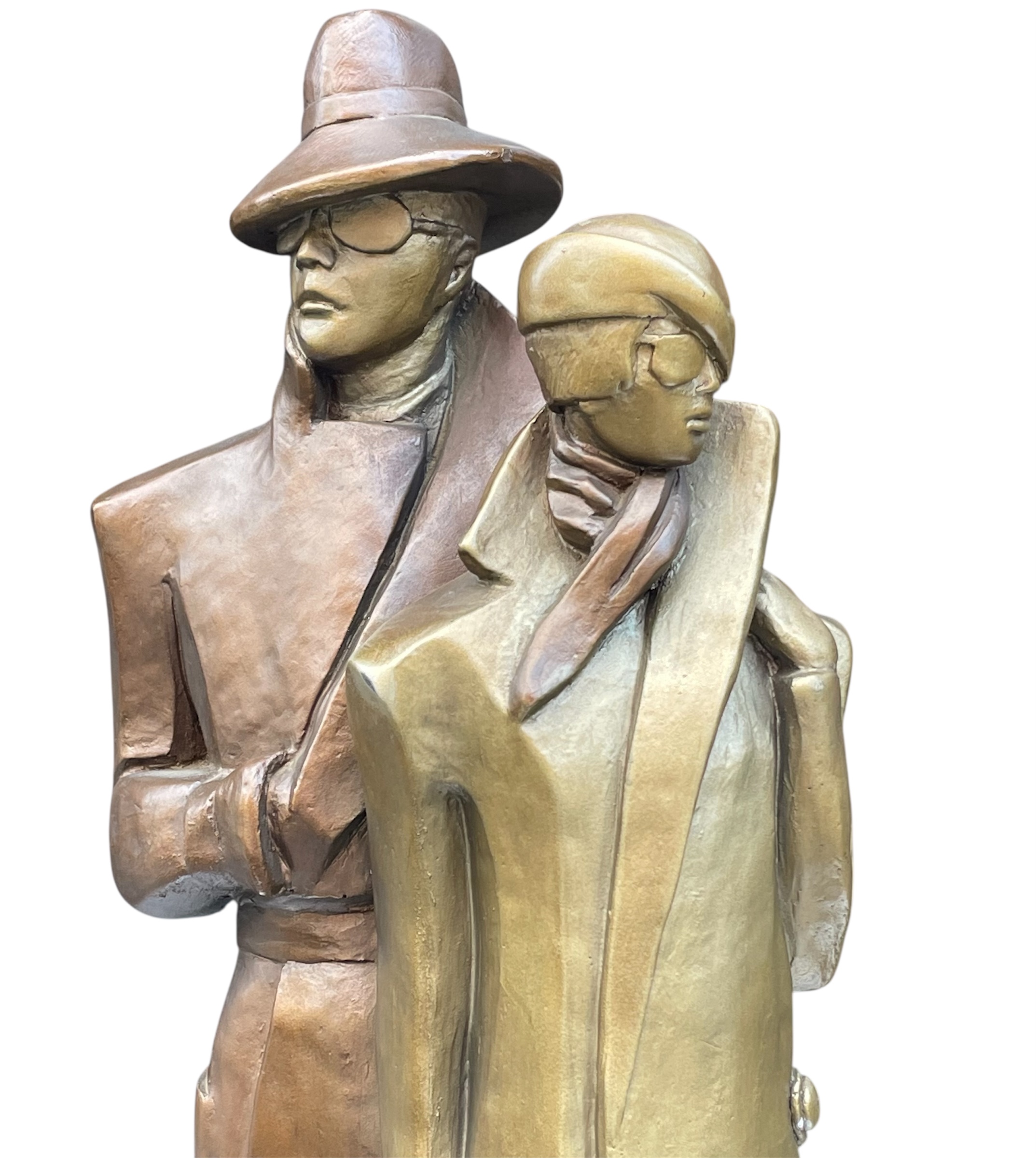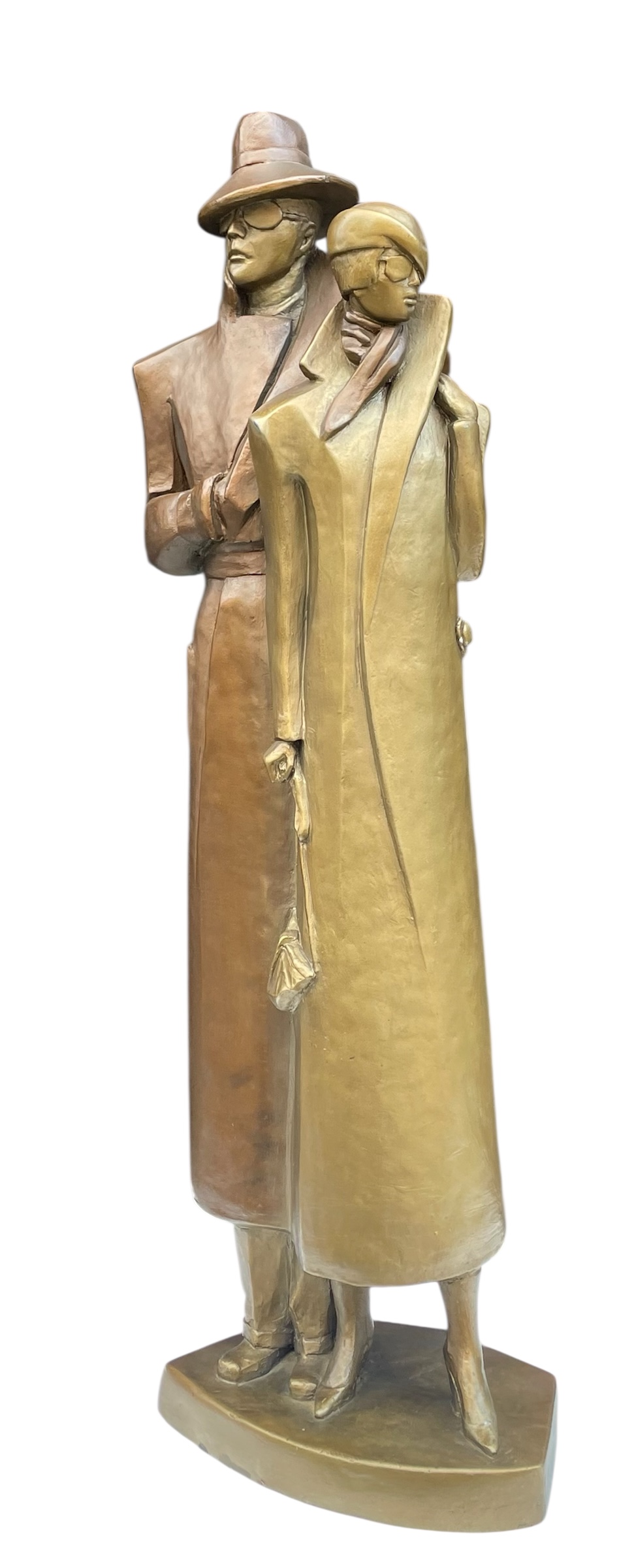 This is a striking – Austin Prod David Fisher “Dressed to Kill” AP 3484 Statue Dated 1987. It is in very good condition except for few scuff marks to the surface and some repair to the ladies handbag. Designed in 1987, this cool edgy couple are dressed for a night out on the Town. Made from a man-made material called Durastone , finished with Silver and Antique Bronze . The Austin company was founded in 1952 in New York as a museum reproduction company featuring selections from great art collections of Egyptian, Greek, Roman, Asian, African and Contemporary sculpture. The company is no longer in operation. This specific statue is made of Durastone.