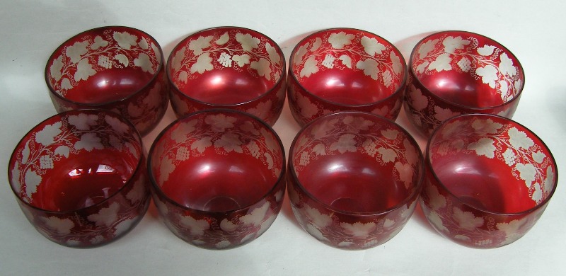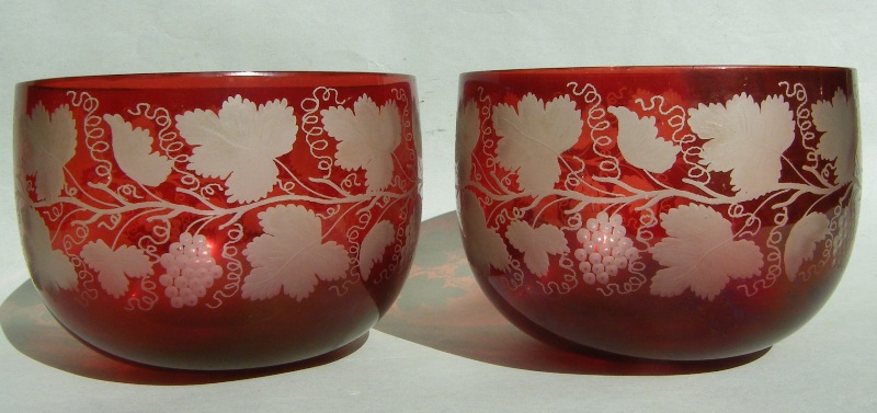 A Very Fine Quality Early Bohemian Clear and Dark Ruby Hand Etched Crystal Circular Finger Bowls, late Nineteenth, each with lavish leaf and vine decoration.