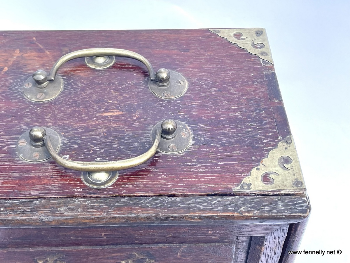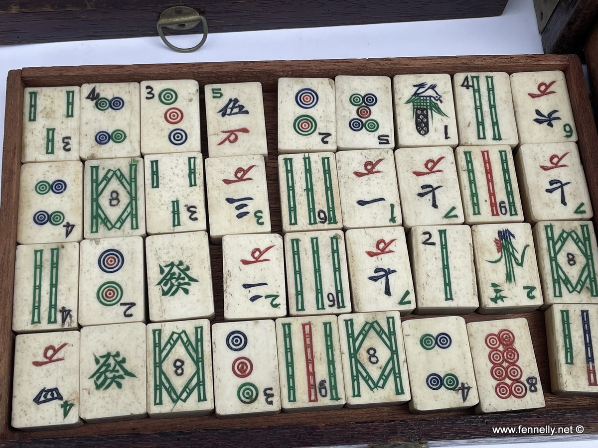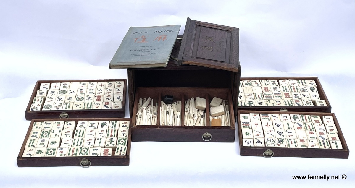 This Antique MaH Jongg Game Box complete with all original contents and instruction booklet date to the Circa 1910. The Game is in original wooden box with brass mounts. The front opens to reveal 5 drawers which you can slide by pulling the little handles. Contents: 144 plus 4 joker stones, dices made from bone, 4 Winds in original circular container and 120 bone checkout sticks. These are all hand made and the stones are made from bamboo which is dovetailed into bone with deep rich coloured paint work which remains vivid. All Beautifully handpainted and in great condition. The booklet is signed and daated 1926 when it arrived to Dublin.