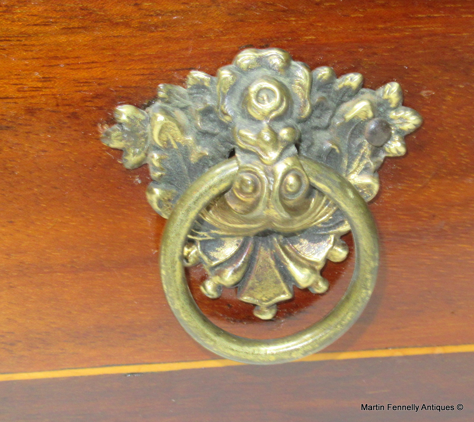 This Mahogany English Tea Caddy dates to Circa 1820. The top opens to reveal twin lidded compartments for tea storage. The Caddy has Satinwood stringing and brass handles