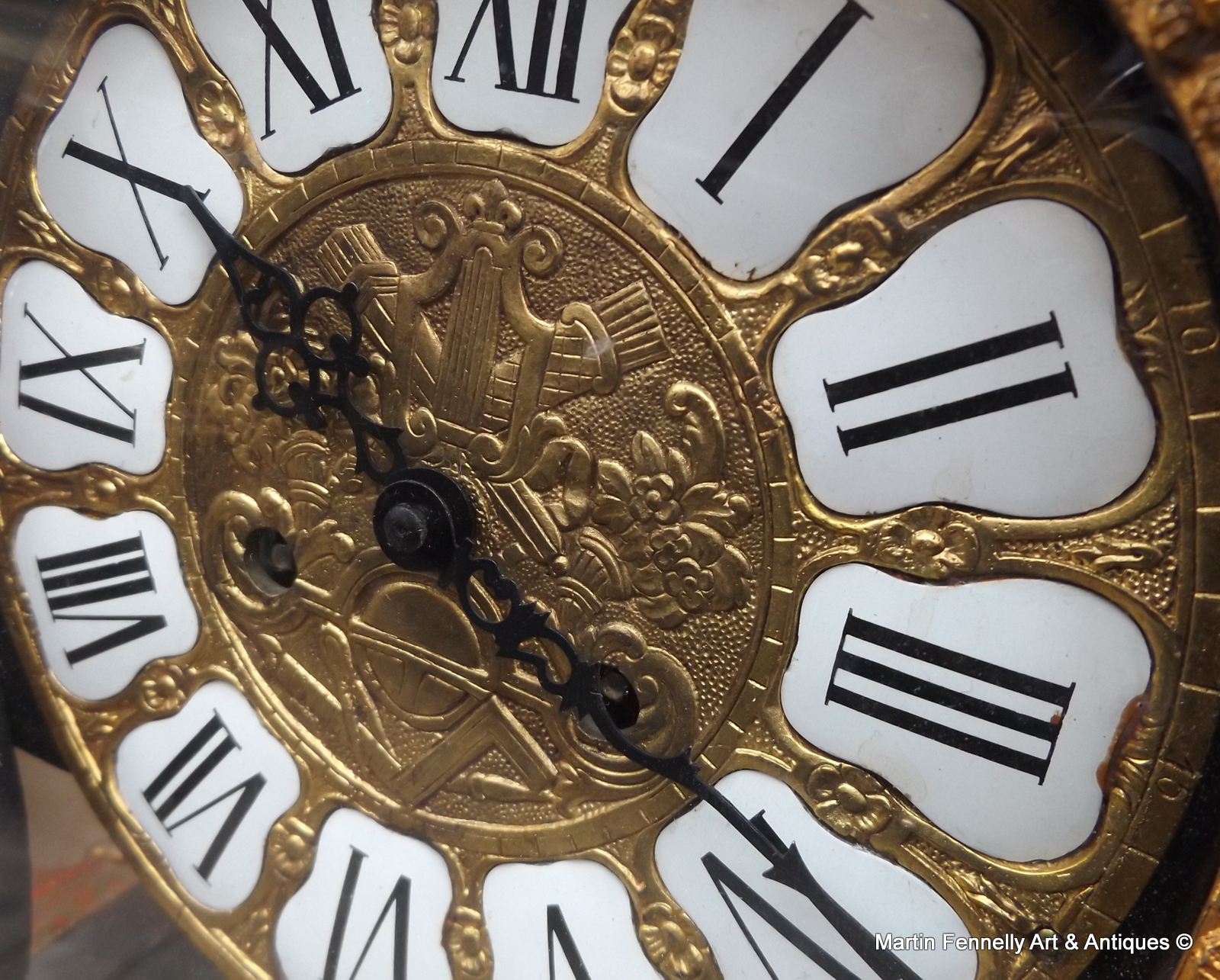 An excellent quality French Boulle Ormolu and Tortoise shell inlaid Mantel Clock with ormolu mounts and decorative brass dial with white enamel numerals. The Clock has an eight day French movement which strikes the hours and half hours on a bell. The Clock movement is stamped ‘Lauris’. This French Ornate Clock makes quite a statement and would need an impressive Fireplace to sit on. The Clock design would suugest 1880 and I have priced it to sell. Shipping would be expensive, Price to New York was checked and came in at €450.