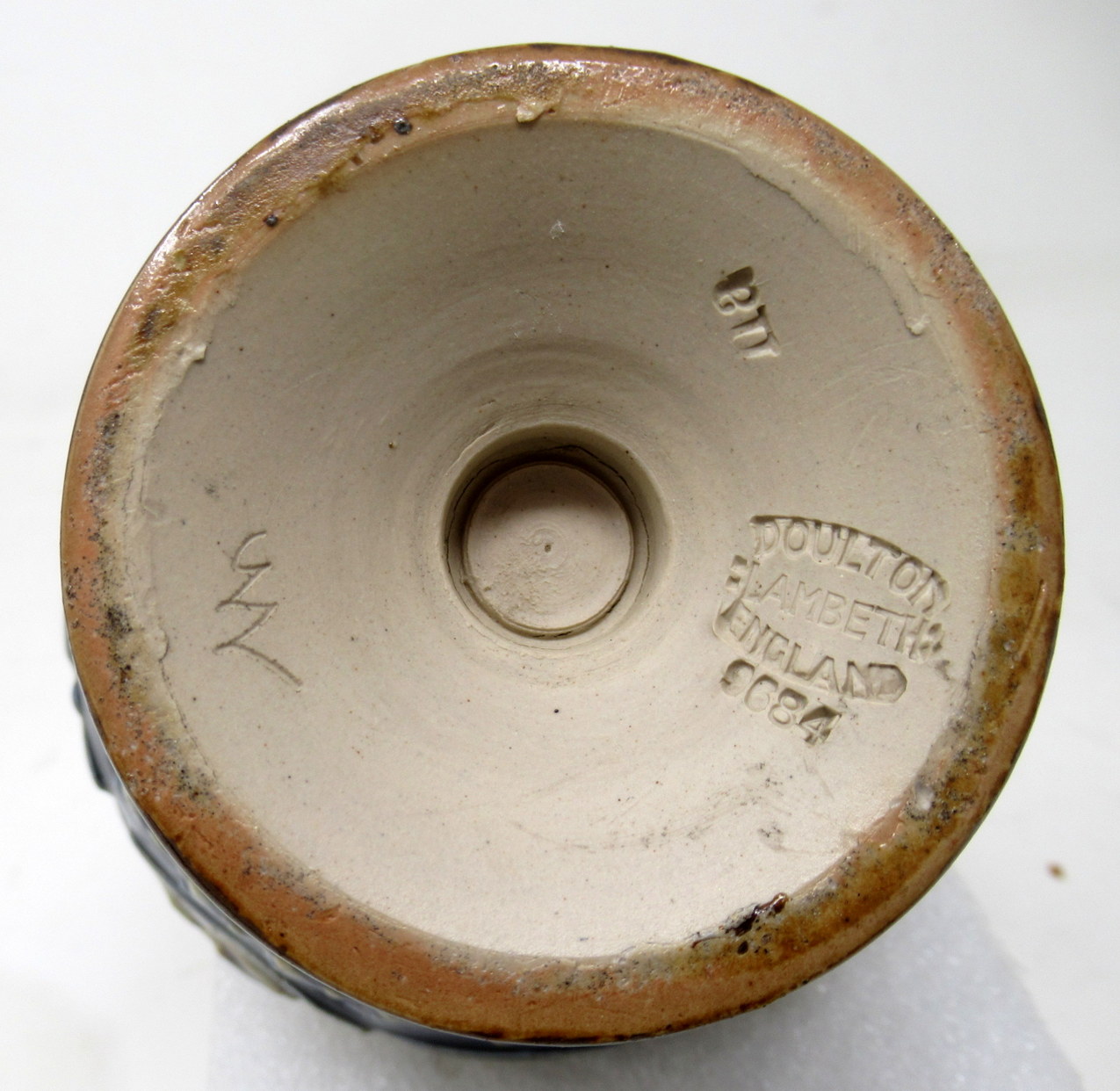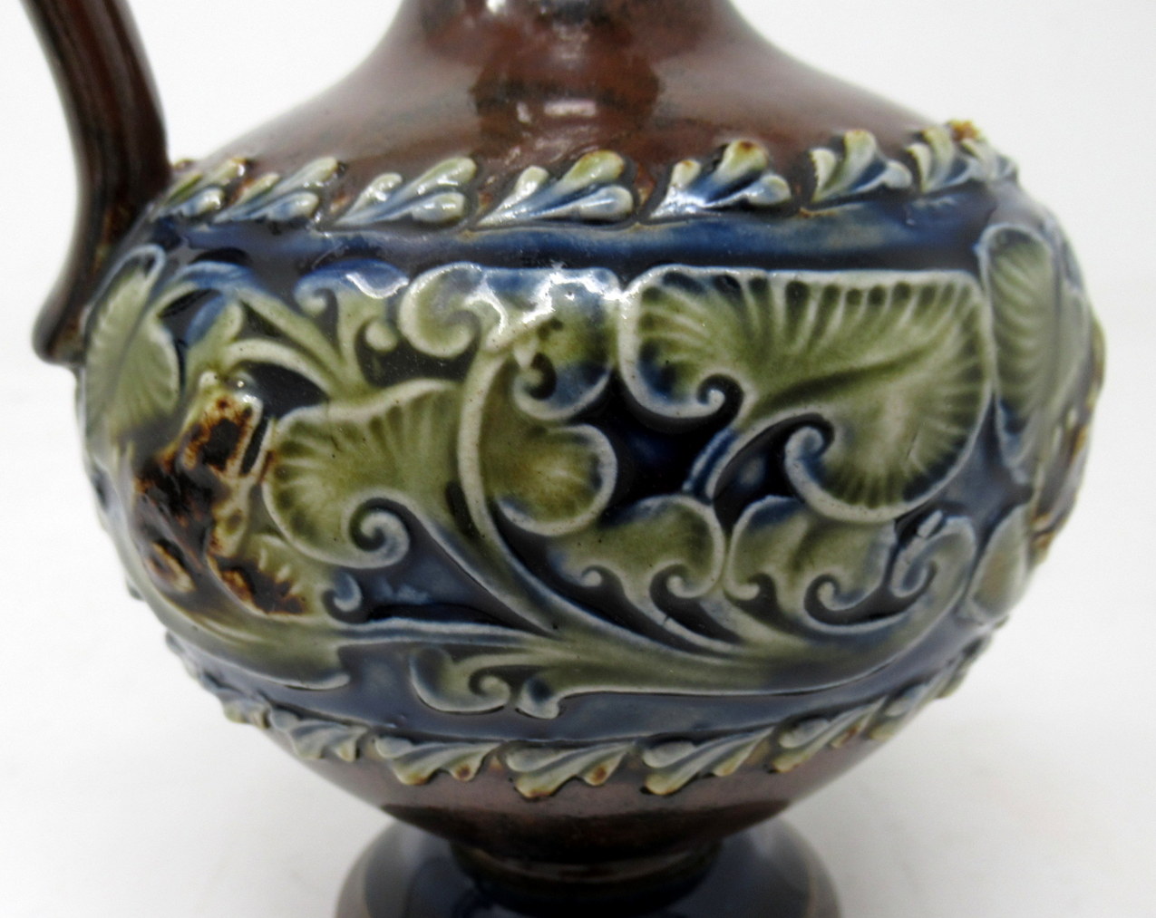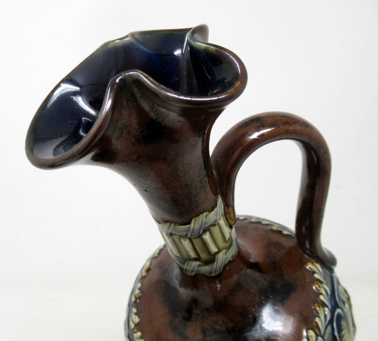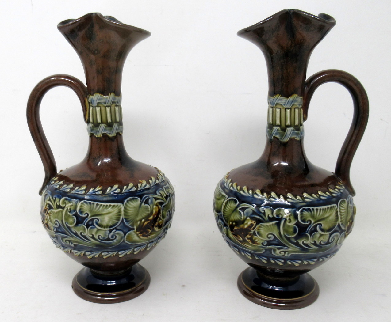 Each of bulbous form with wavy flared rim and single scroll handle. Lavish Art Nouveau raised tube-line decoration in relief of multiple leaves and frogs (unusual decoration for a Doulton piece) within a cobalt blue ground, the main body colour is dark brown mottled ground. Back and front views are similar.