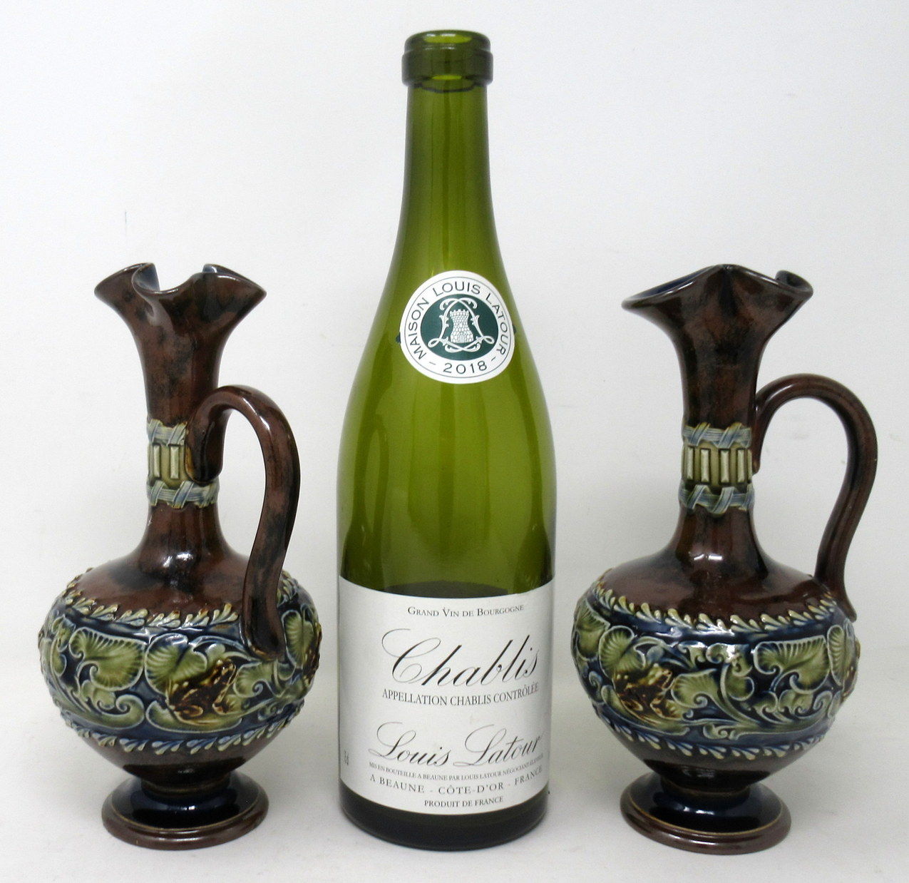 Identical Pair of English Royal Doulton Lambeth English Moulded Salt-Glaze Stoneware Pottery Ewers of compact proportions.