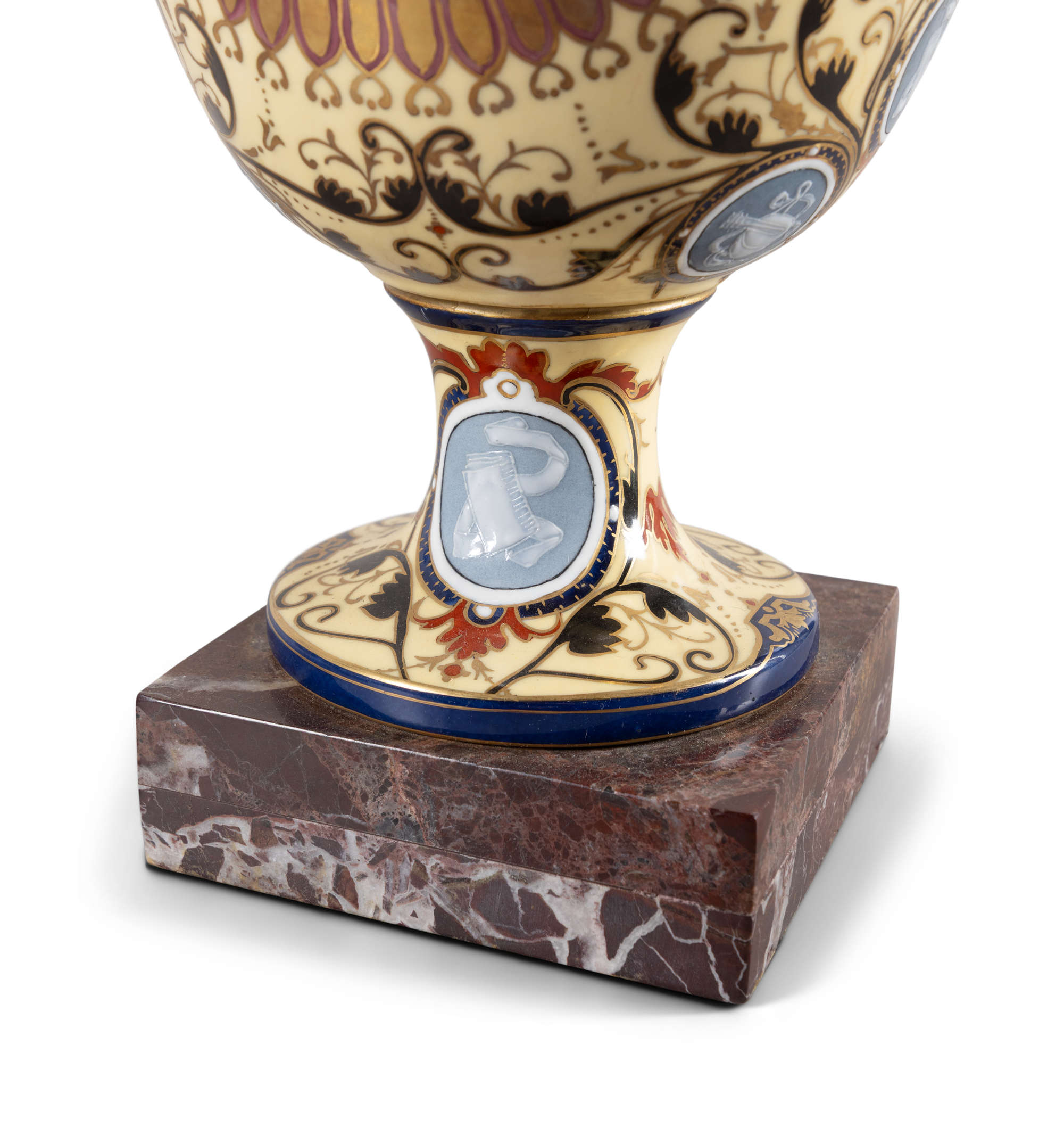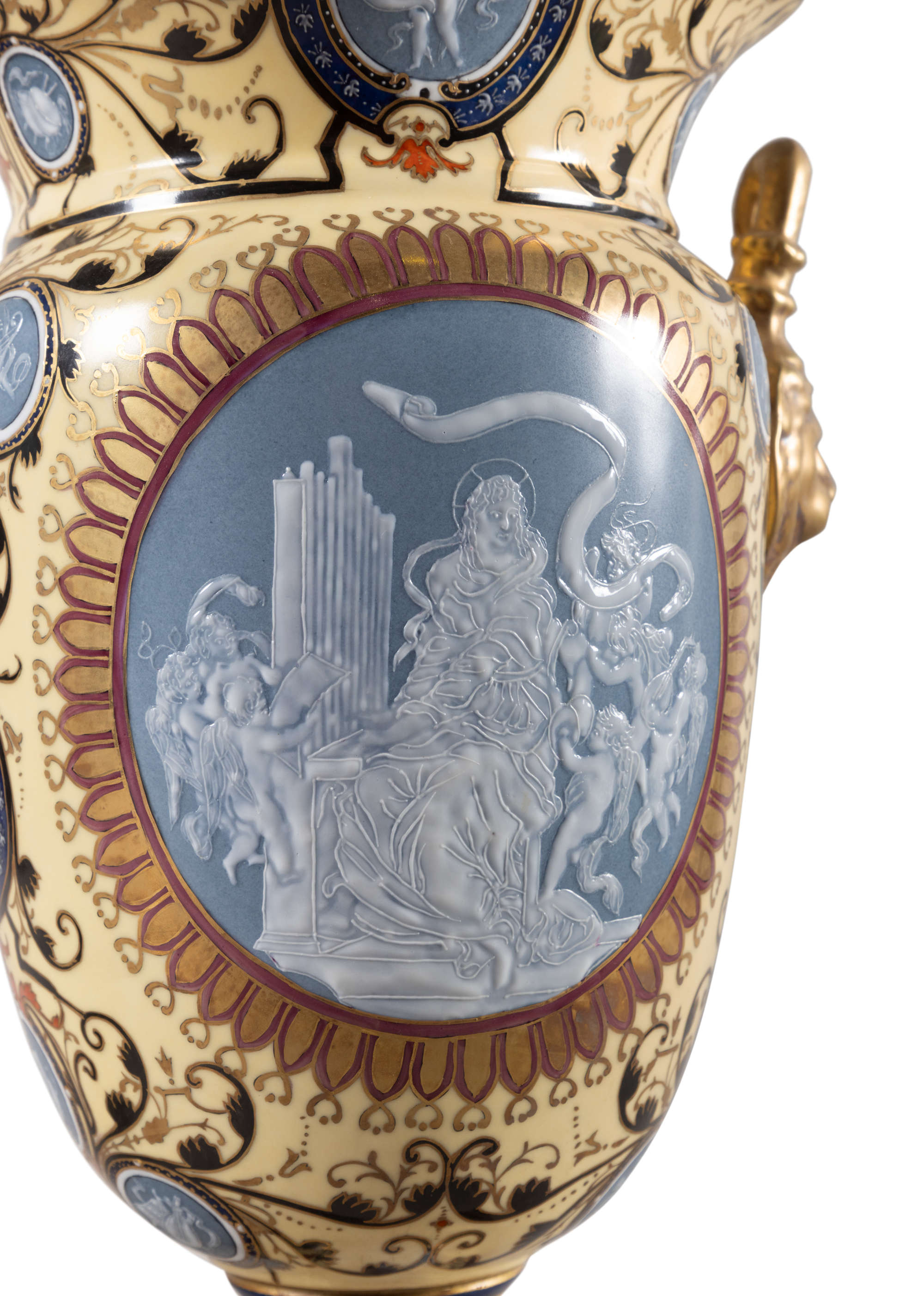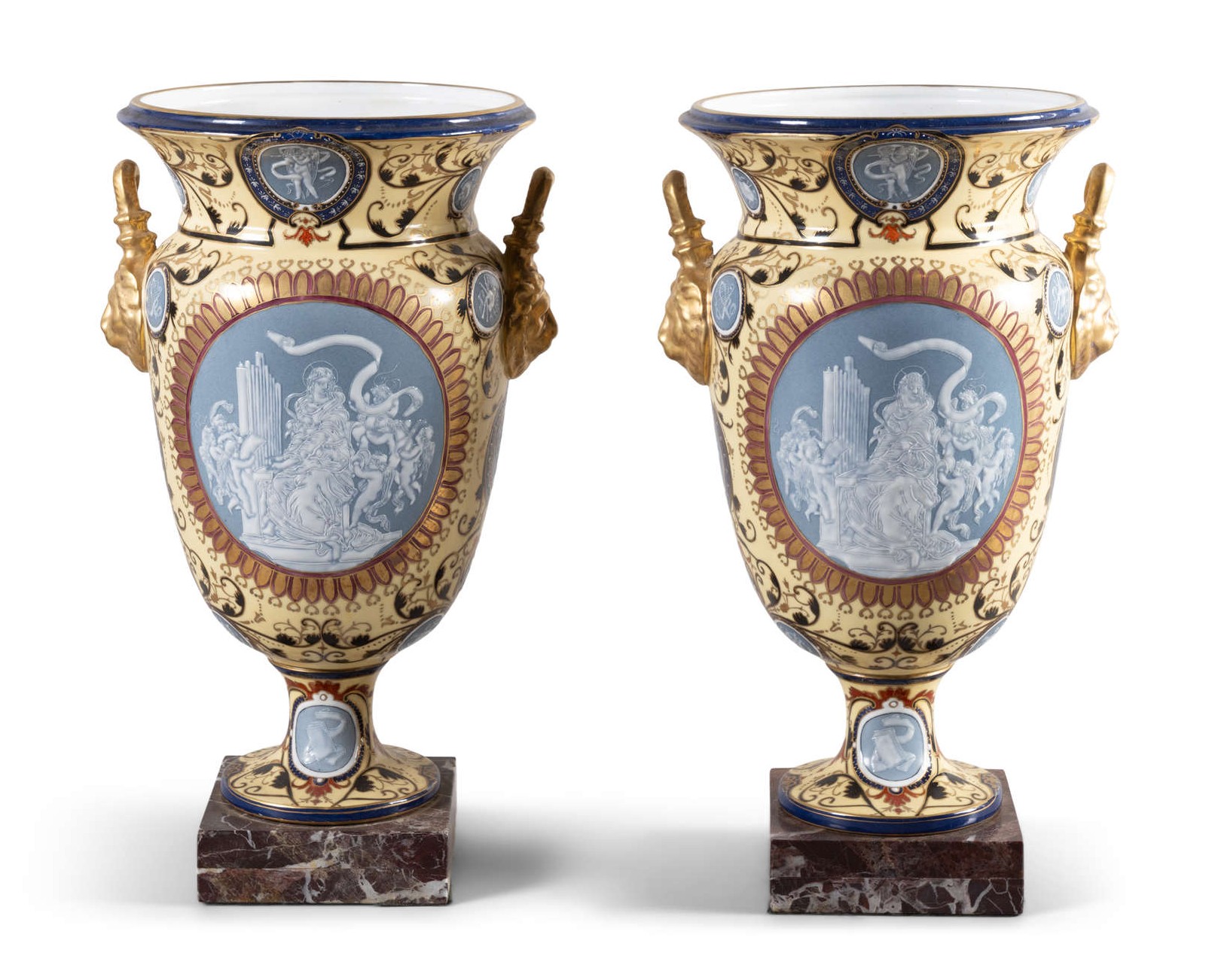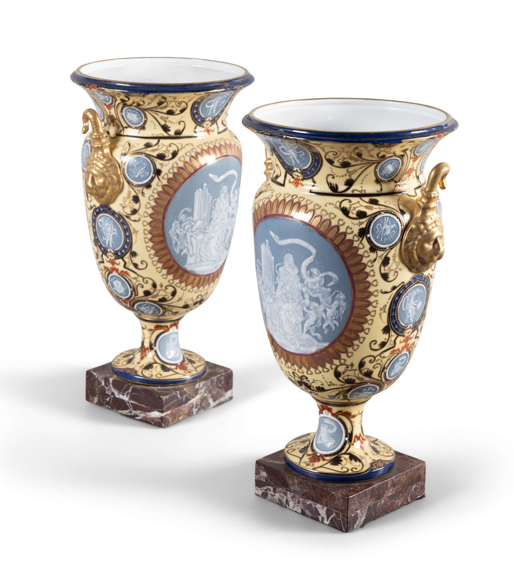 These are a very striking Pair of Pâte sur Pâte ornate Vases – They have superb detail with large decorated medallions depicting a lady playing an organ surrounded by cherubs playing instruments front and back with Celadon Backgrounds. The vases have multiple smaller medallions also with Celadon backgrounds depicting various musical instruments and musicians. The vases base colour is Imperial Yellow with intricate scroll detail. The Lion mask handles are gilded and the overall condition is excellent. The Lady playing the Organ design is a rare design and was produced by Minton and Sevres. Minton pâte-sur-pâte (paste on paste) is a highly specialized, late 19th-century English porcelain decoration technique where white slip is applied in successive layers to an unfired, coloured body to create a low-relief, cameo-like effect. They are very difficult to create and time consuming. These are possibly Minton dating to Circa 1910. Later applied Marble Bases.