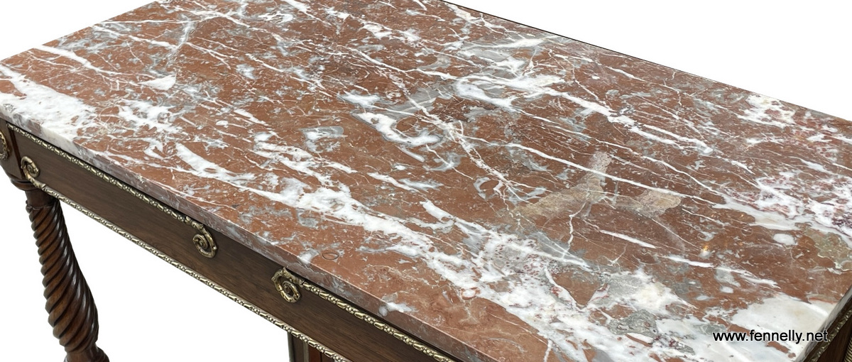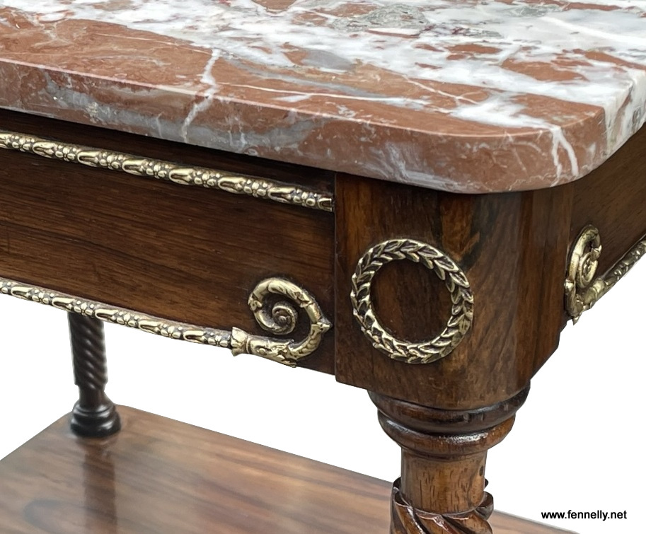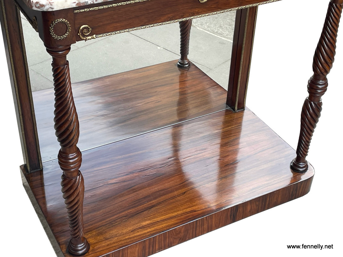 Superb William lV Marble Topped Rosewood Console Table dating to Circa 1835. This Console is a very striking piece of furniture and is in excellent condition. The Marble top is supported by beautifully carved rope twist supports and all raised oon a shaped platform base. The Table is enhanced with Ormolu mounts and is mirror backed. We believe this is a French Table and the quality of the finish suggest a very good maker.