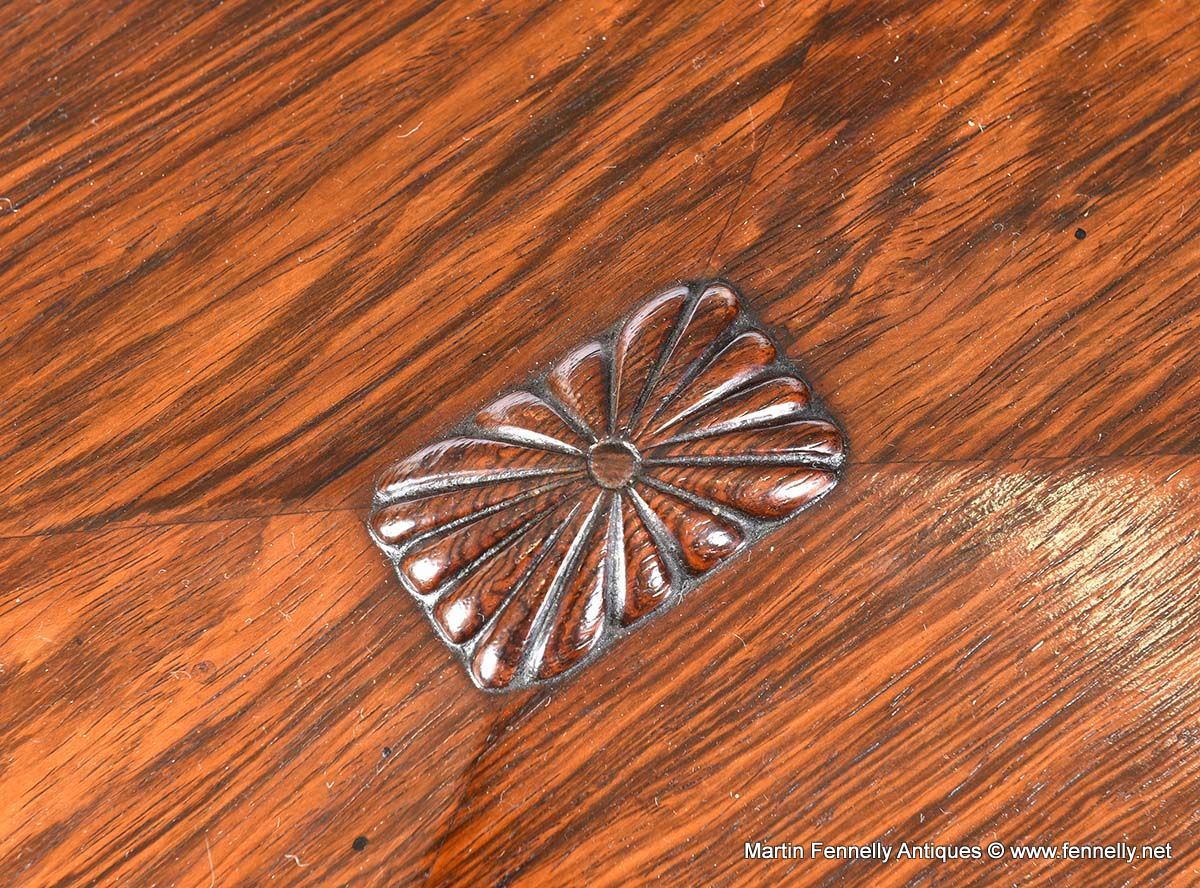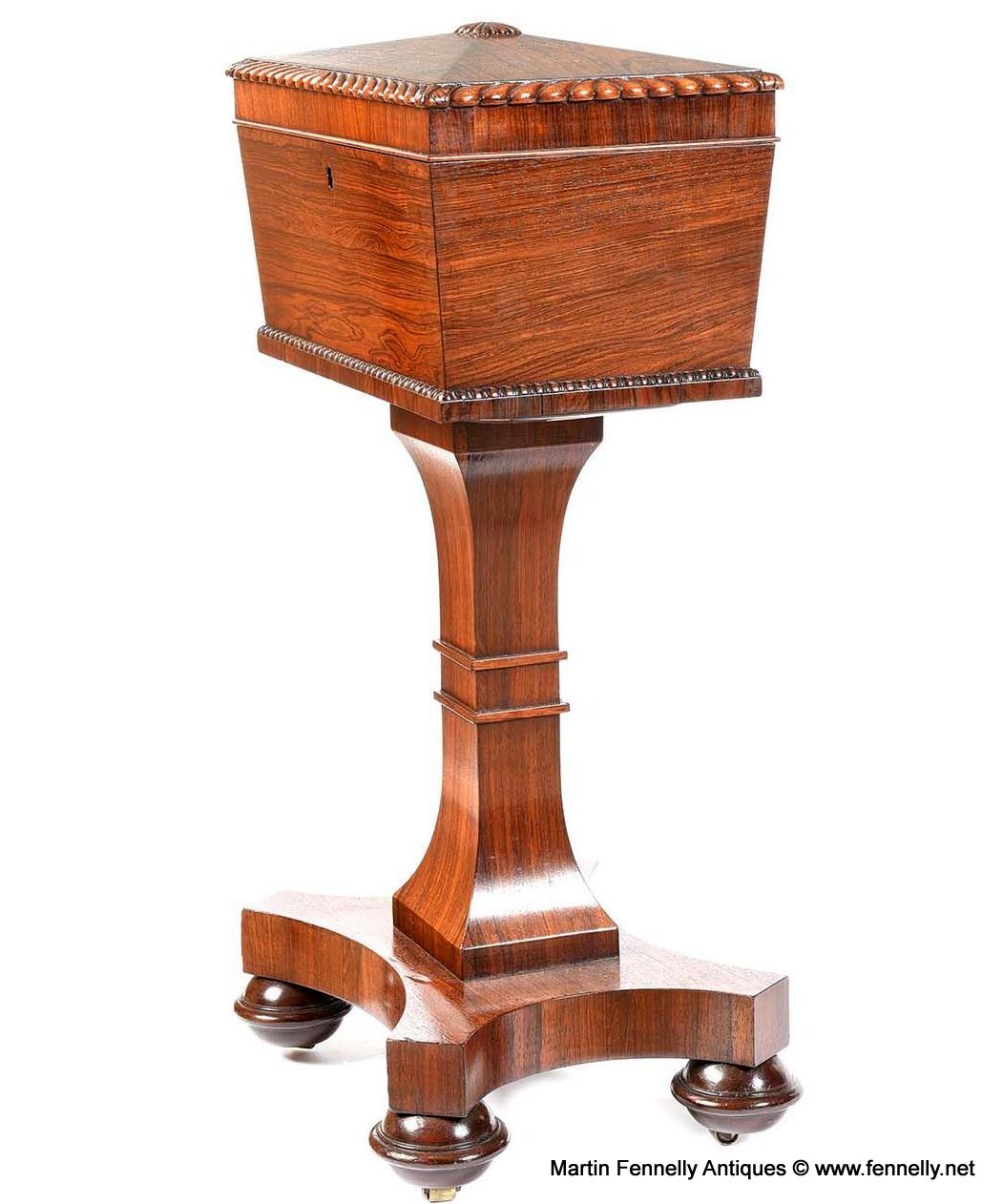 Premium quality English Regency Period well figured rosewood Teapoy, raised on its original stand, firmly attributed to Gillows of Lancaster and London. First quarter of the Nineteenth Century.