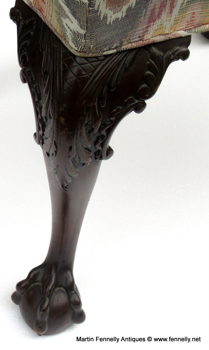 This is a large Georgian Revival English Stool dating to Circa 1920. It is in Mahogany with carved floral design knees, Cabriole Legs and Claw/Ball feet. Upholstered with a pastel pattern fabric.