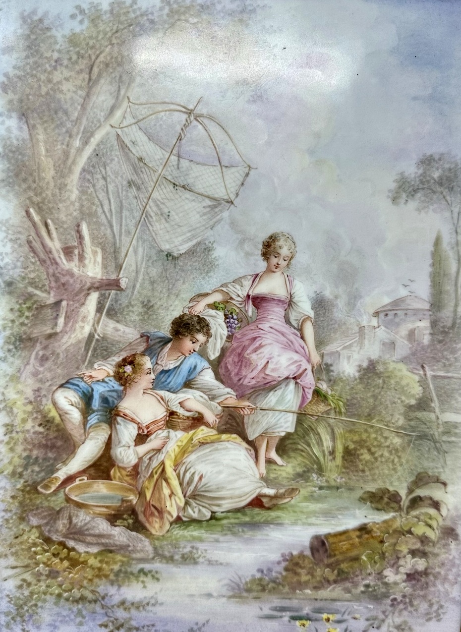French Sevres Porcelain Ormolu Mounted hand painted framed plaque, depicting a romantic scene with a standing lady and a seated couple fishing, dressed in Eighteenth Century Costumes beside a lake with a landscape background. late Nineteenth Century.