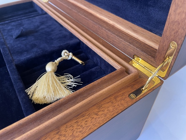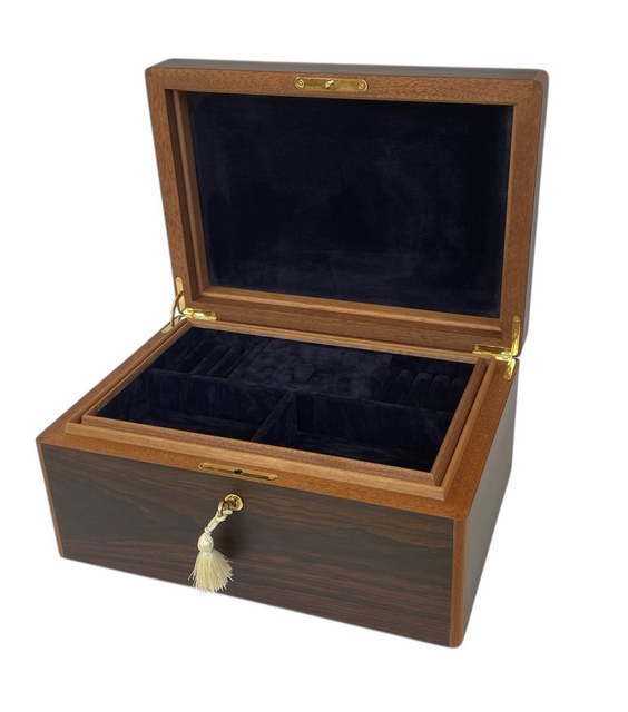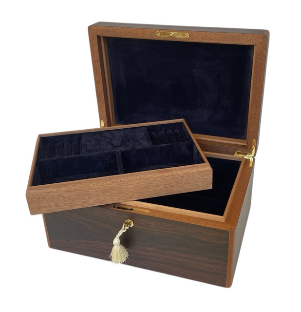 The Best Jewellery Boxes in The World – Rare Ebony – Manning of Ireland – Irish Made – This was manufactured by the Famed Manning of Ireland Company and is truly a Jewel of Handcrafted Genius. This Box is constructed of the Finest Woods available and the Knowledge and Skill of 4 Generations of Box making in the Manning family is obvious. The Box is made from Mahogany with Ebony veneer and enhanced with a hand polished finish. The Box frame is in Mahogany and Spanish Cedar completes the interior. The Hand Polished finish and interior gives a richness that has earned the Manning Company a well deserved place at the Pinnacle of the Master Cabinet Maker.