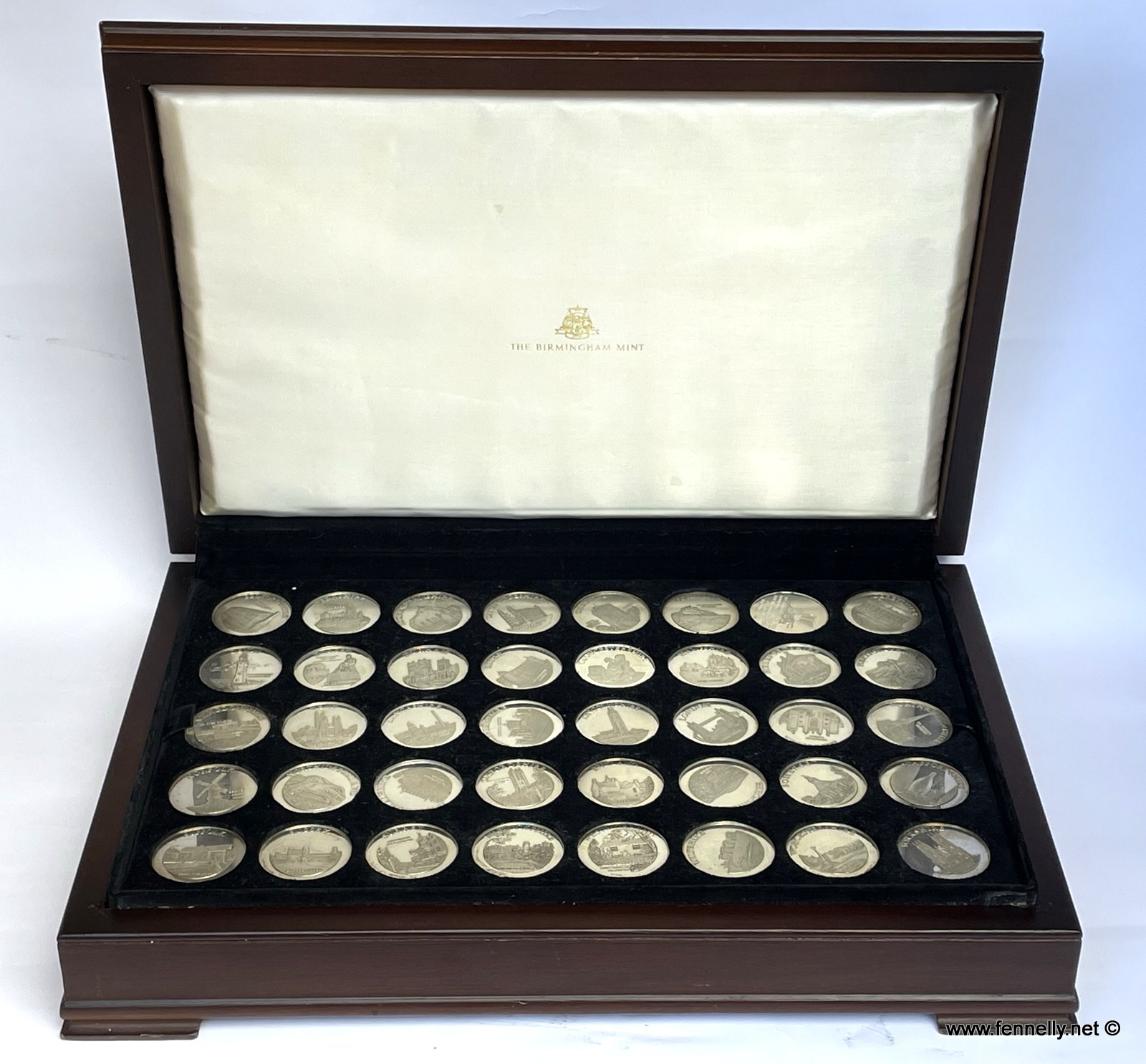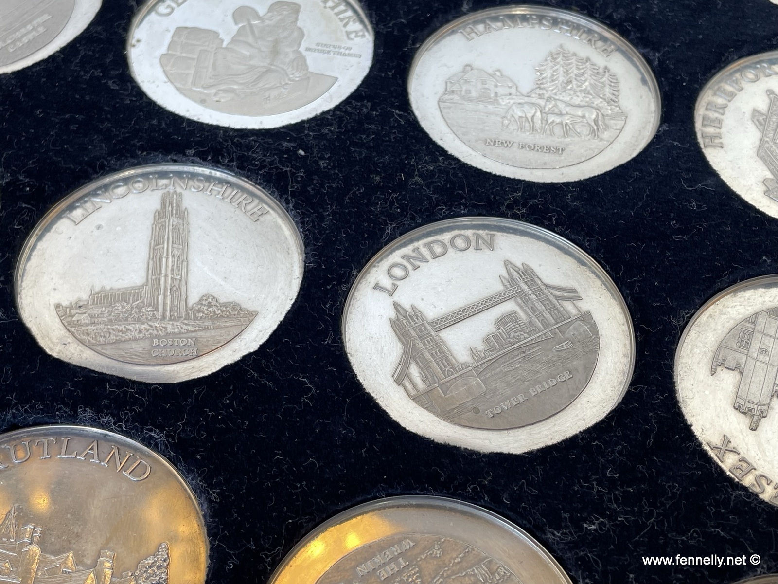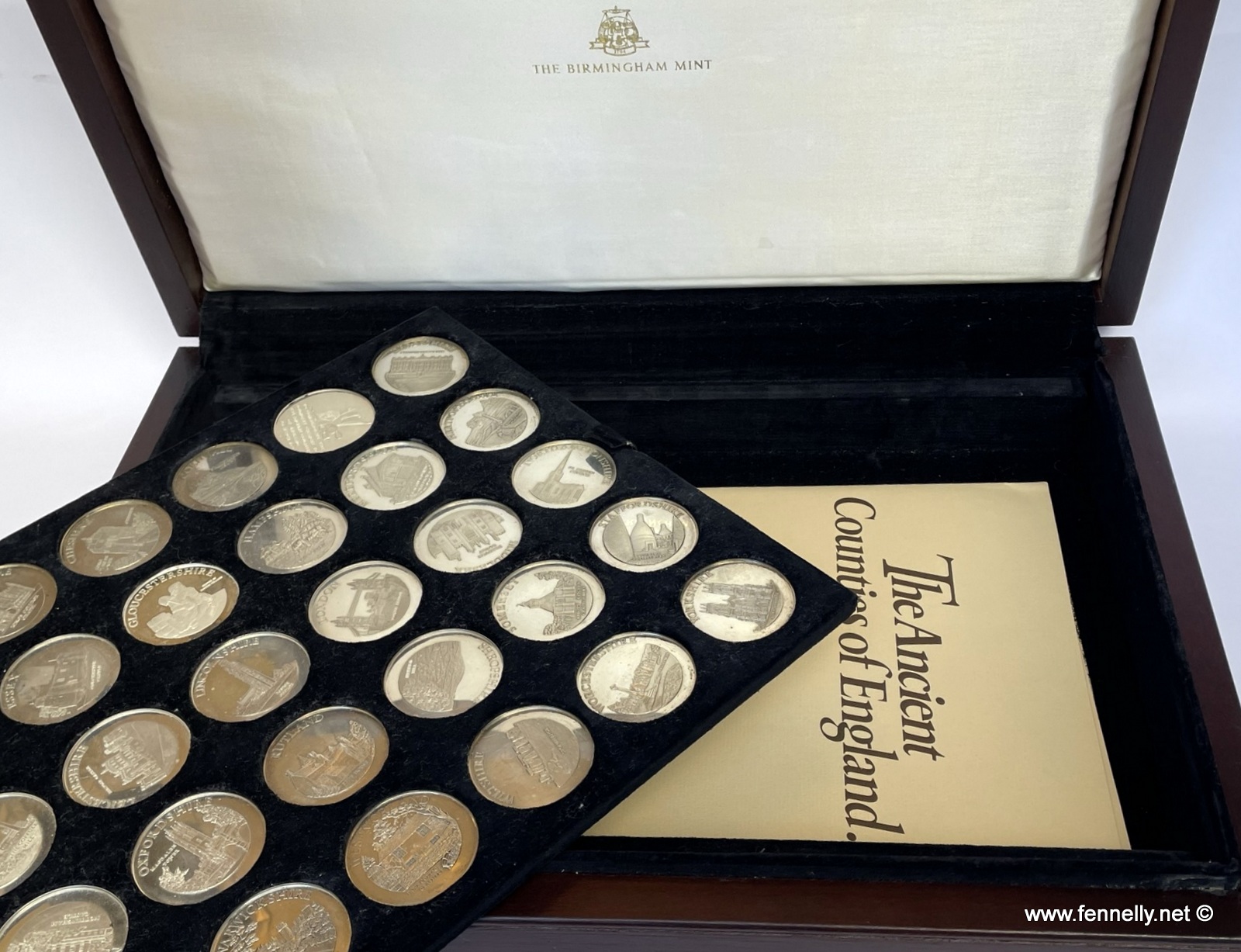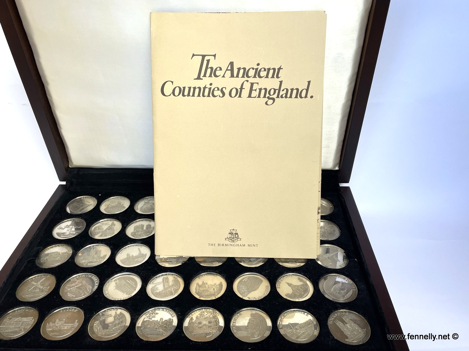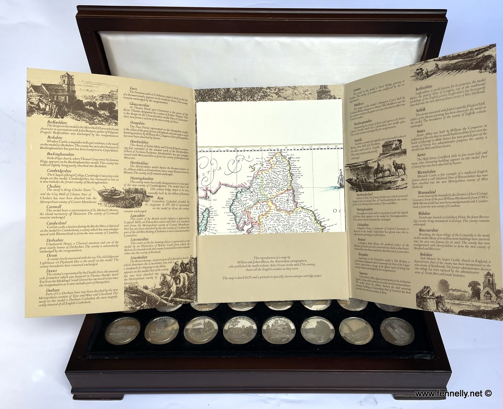 The Birmingham Mint “Ancient Counties of England” 40 silver medal collection. Birmingham Mint “Ancient Counties of England” silver medal collection, comprising 40 medals engraved with image of the county and reverse inscribed “To commemorate the boundary changes to the ancient Counties of England 31st March 1974”. This was a limited edition of 2500 in presentation case. The Box also contains a County description pamphlet together with a map depicting the UK Counties by Willem and Johan Blaeu in 1635. This is a wonderful item and in very good condition.