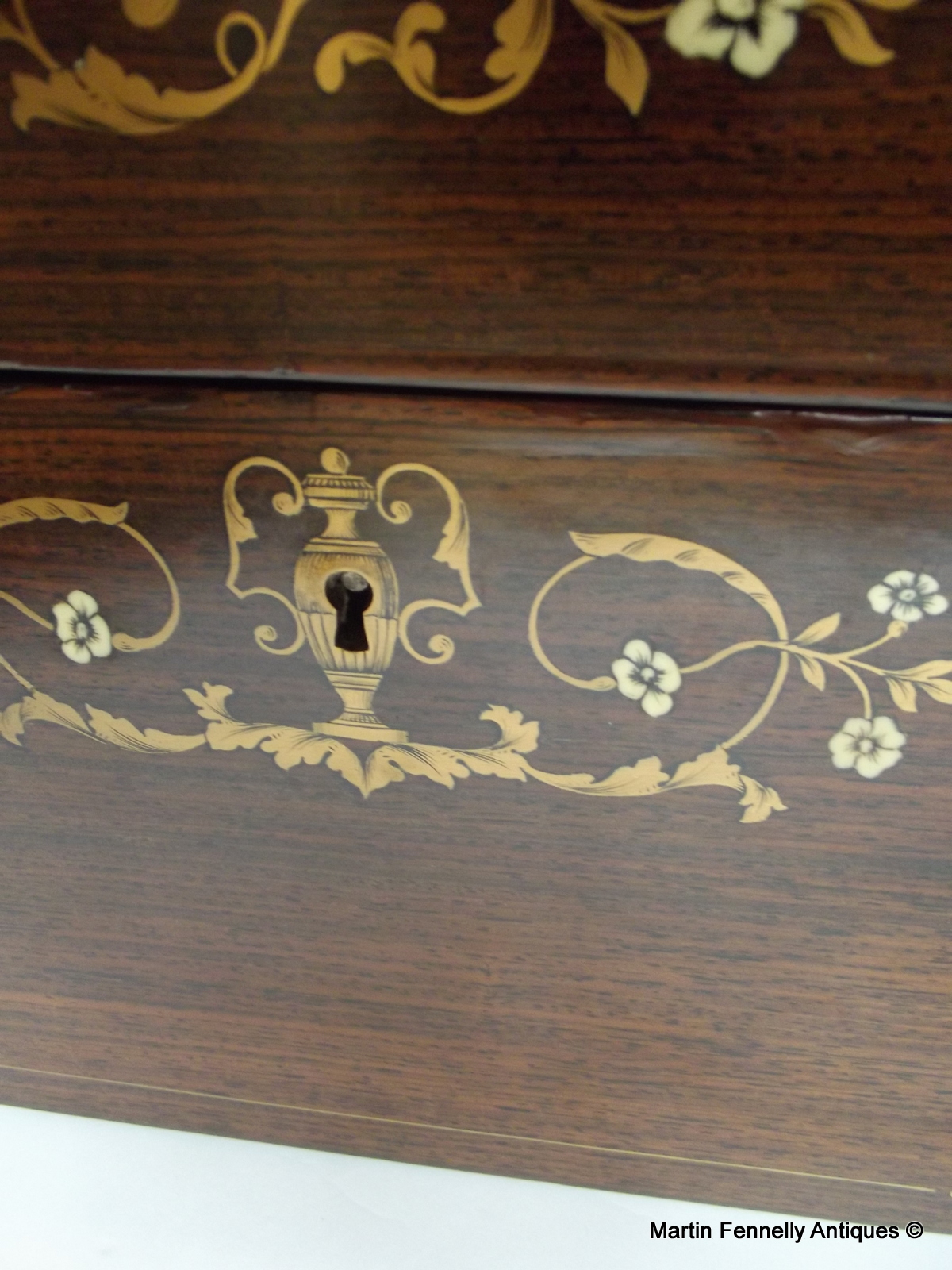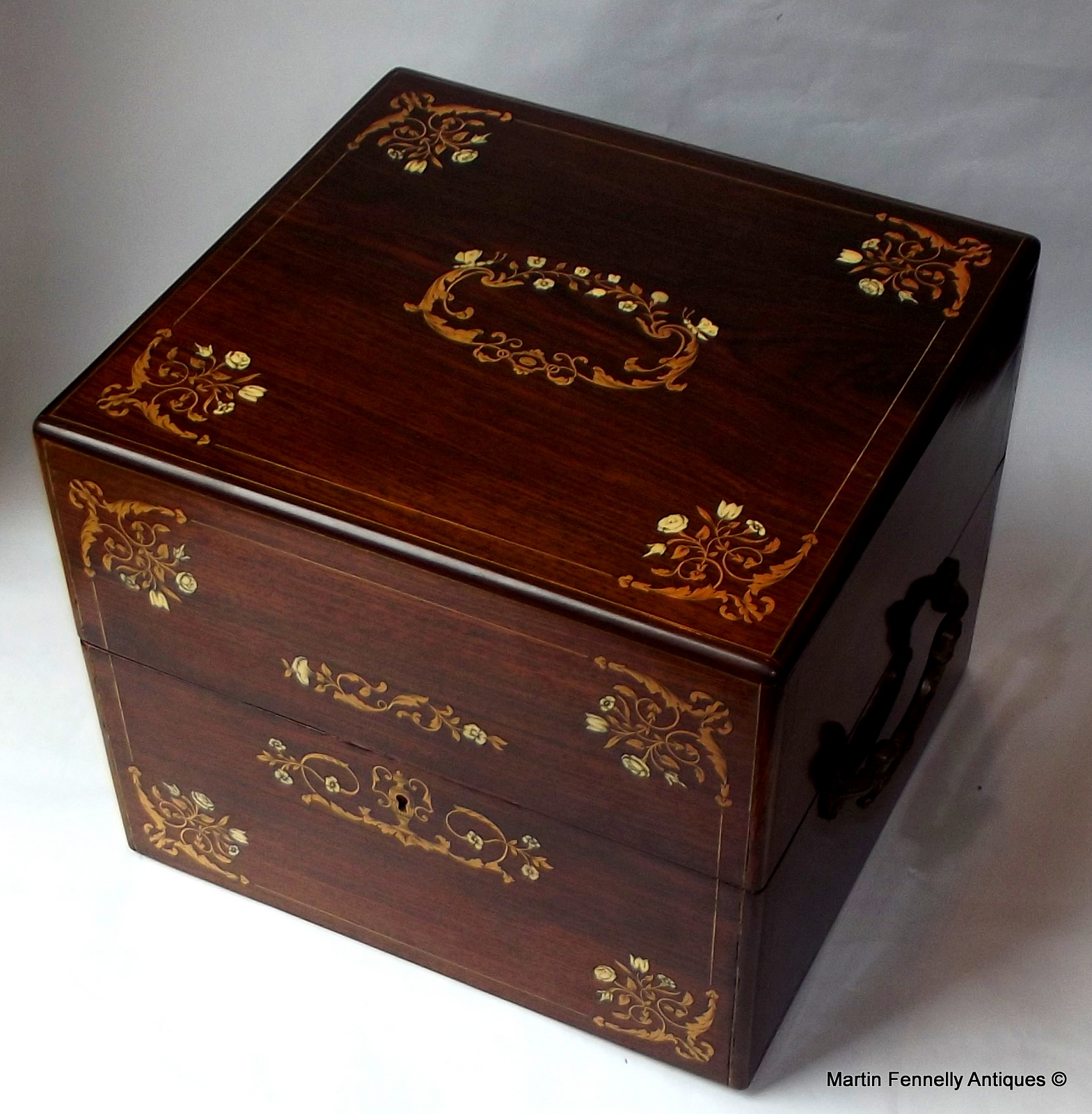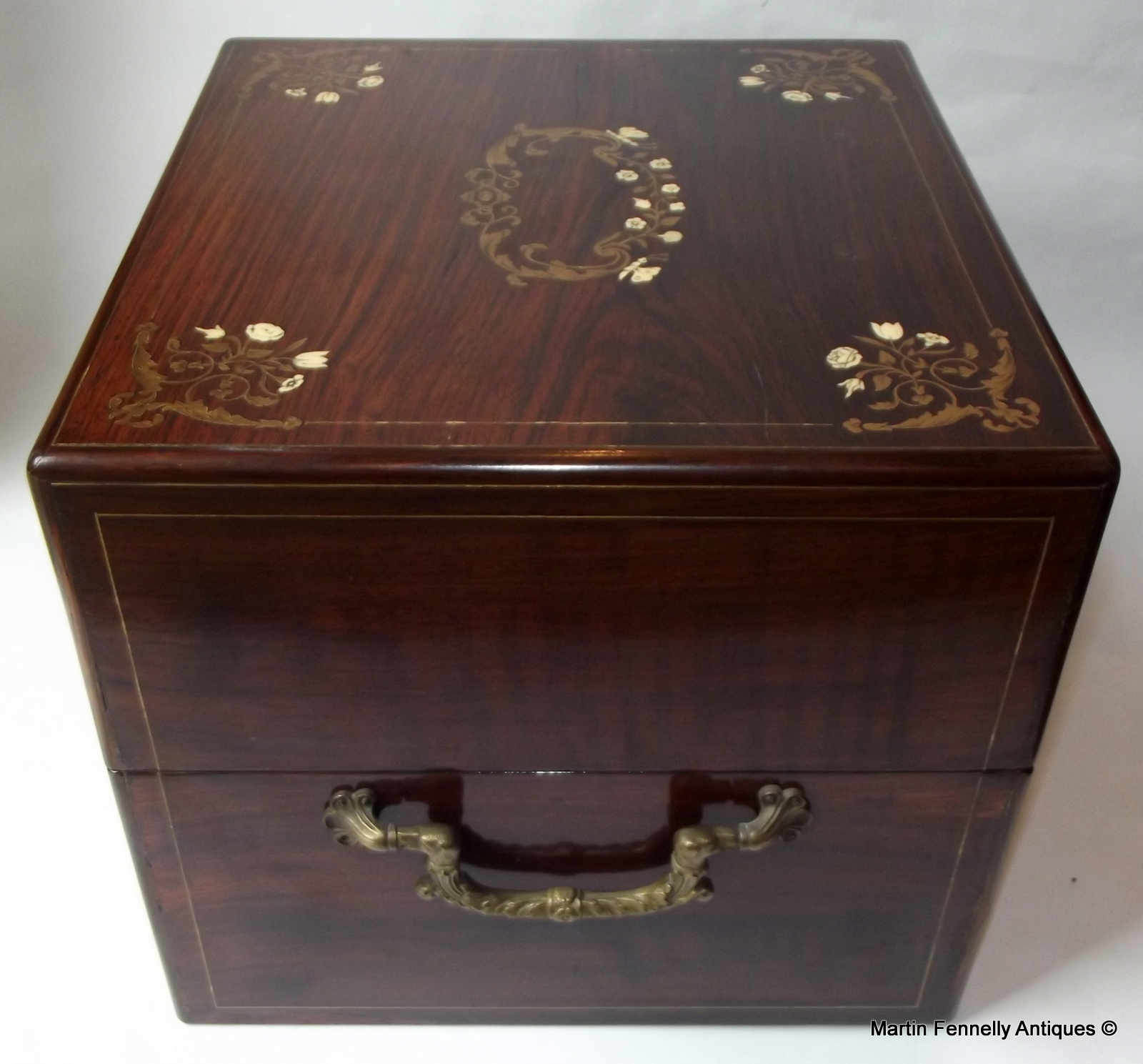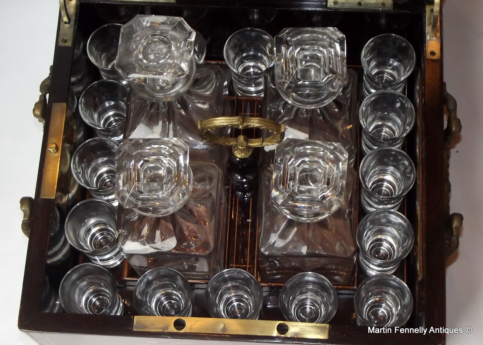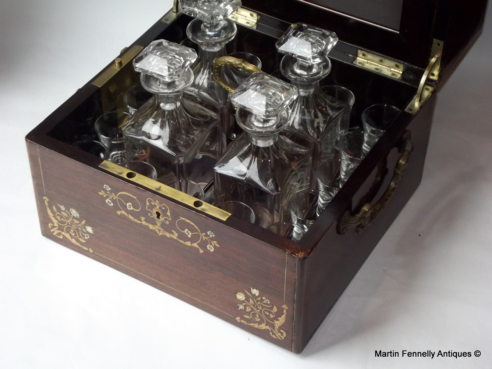 This Classic French Tantalus dates to Circa 1890 and is in great condition. The Complete set of 4 Decanters and 16 Glasses are present. The Hinged top opens back to reveal this stunning collection. The entire set of decanters and Glasses can be lifted from the Case to be placed on a table and stand free.The Box is made from the finest Rosewood with Brass and Ivory Inlay in floral patterns. The Box has the original brass carrying handles and without doubt this is the best Decanter set to Grace any Antique Store in Ireland for quite sometime.