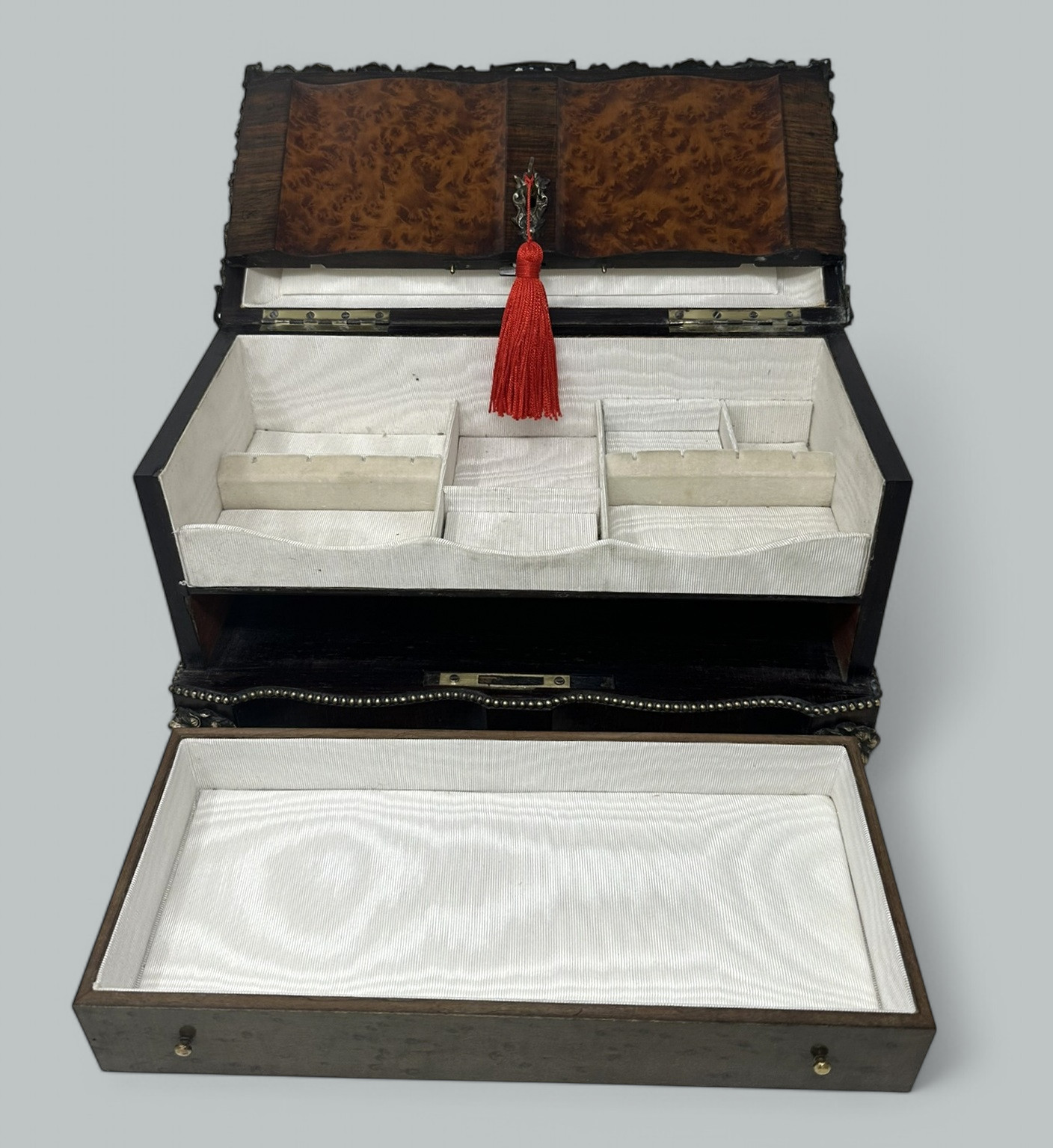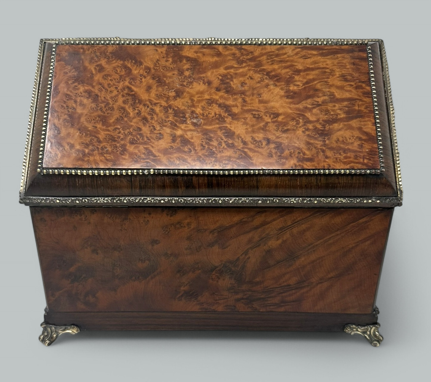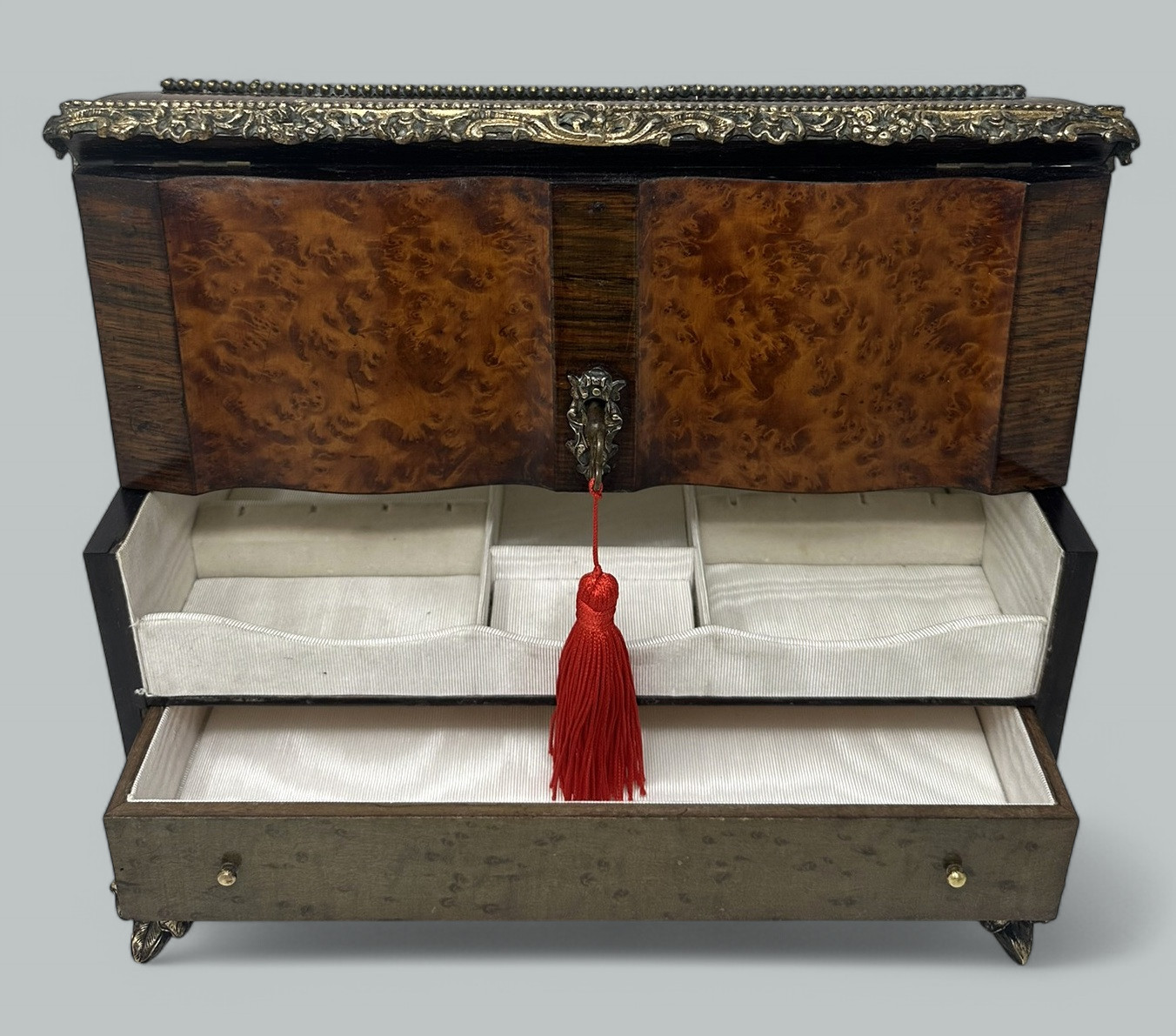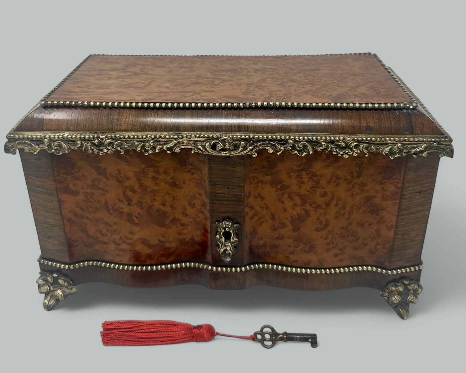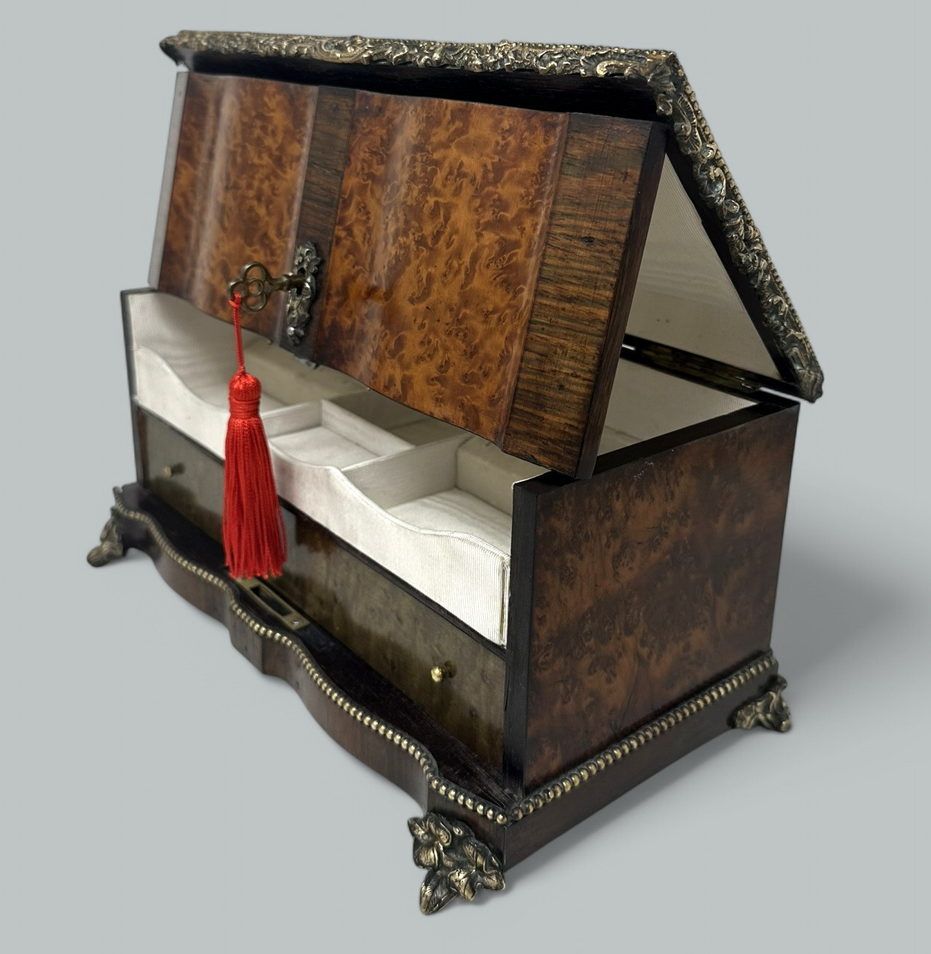 Superb quality example of a Lady’s or Gentleman’s early Victorian Period Gilt Bronze mounted well figured Burr Walnut Jewlery Casket or Table Box made during the third quarter of the Nineteenth Century, of French origin. Raised on its original decorative bronze supports.