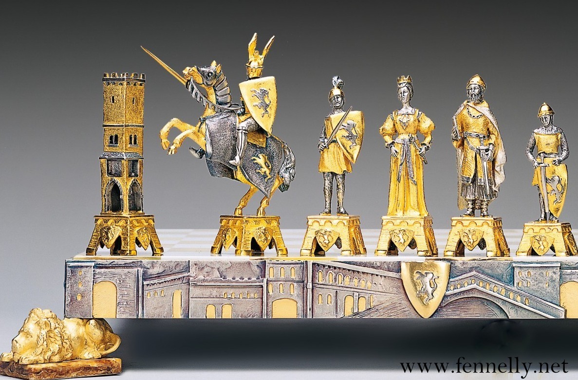 This is a spectacular Chess Board and pieces made in Italy and depicting The Venetian Middle Ages. This unique Chess Set, made in Bronze by lost wax process technique, finished using Real Gold 24 Karat. Each piece is signed by the Sculptor. The Chess Board is made in Onyx, Marble and Bronze with a frame in Silver and real gold. This is a truly magnificent Chess Set and what a gift for the chess player ‘with everthing’. The Board is supported by Crouching lions the Symbol of Venice (winged lions). Please note this is a very heavy item – Shipping to USA would be Circa €650.