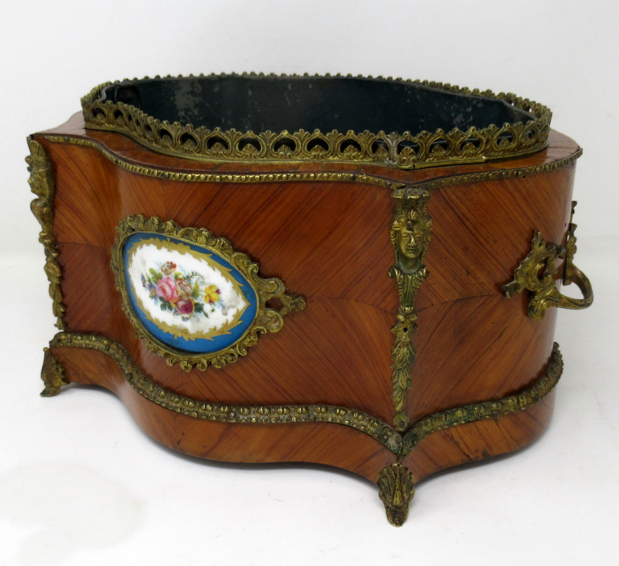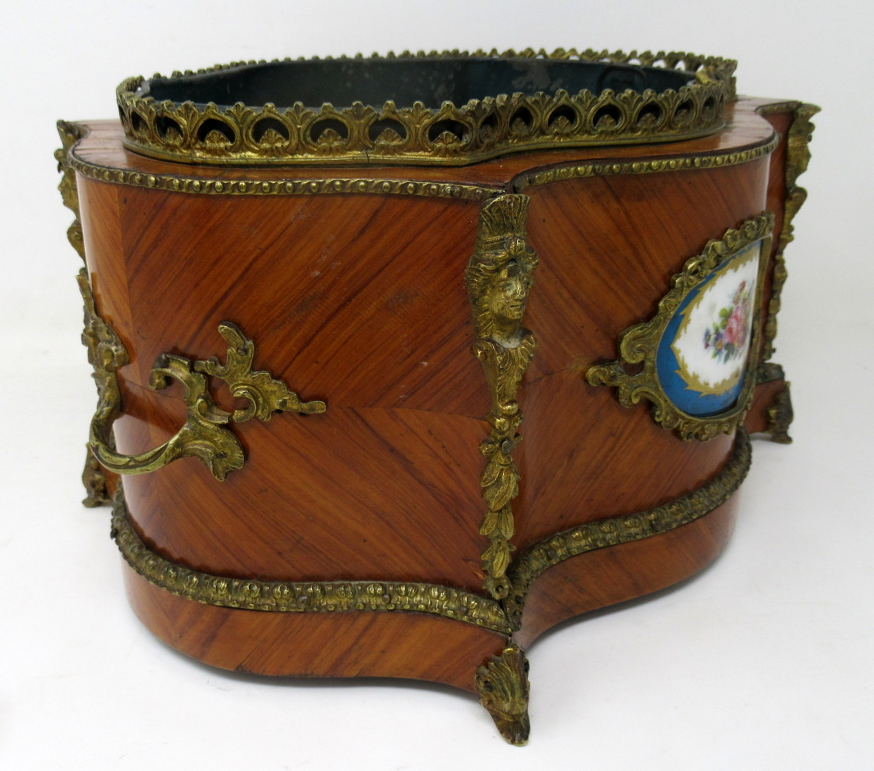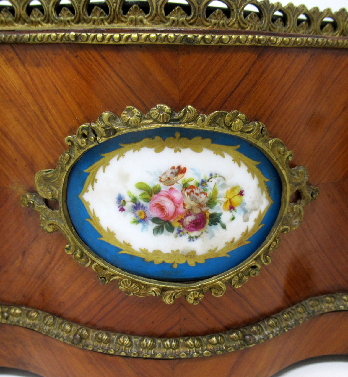 French Twin Handle Kingwood Jardinière of traditional oval form, with ormolu gallery pierced rail and ornate ormolu twin handles and central hand painted soft paste Sevres porcelain plaque depicting hand painted still life of flowers, complete with original painted tin liner.