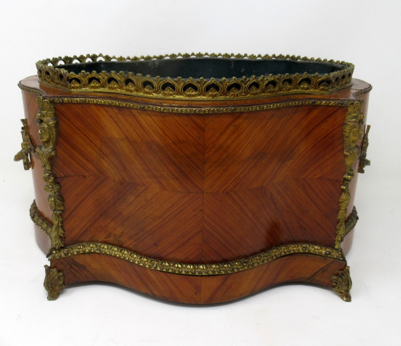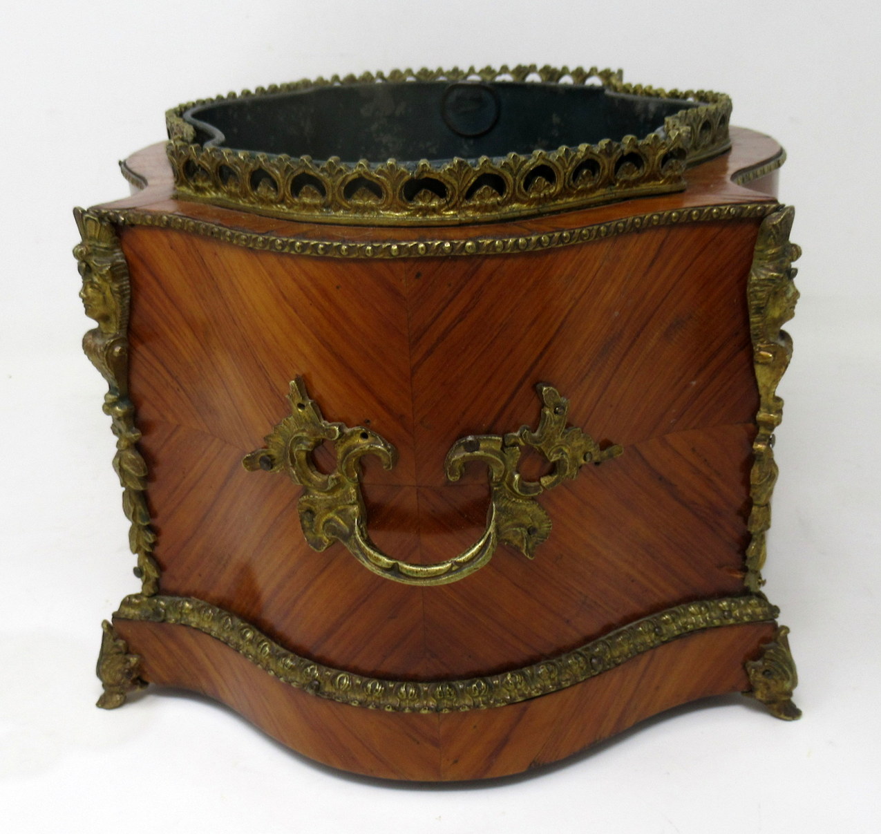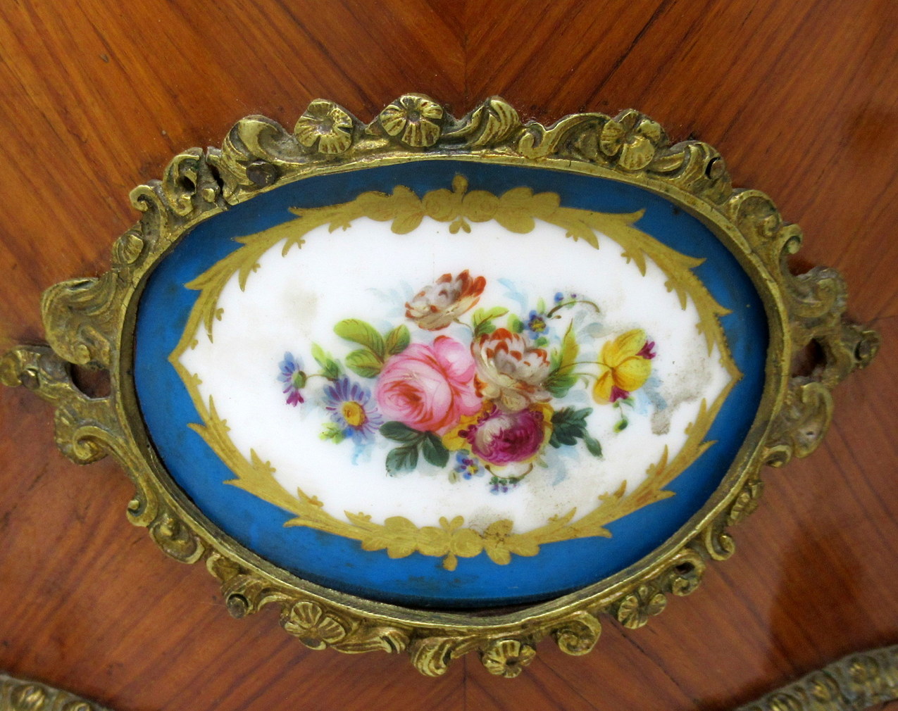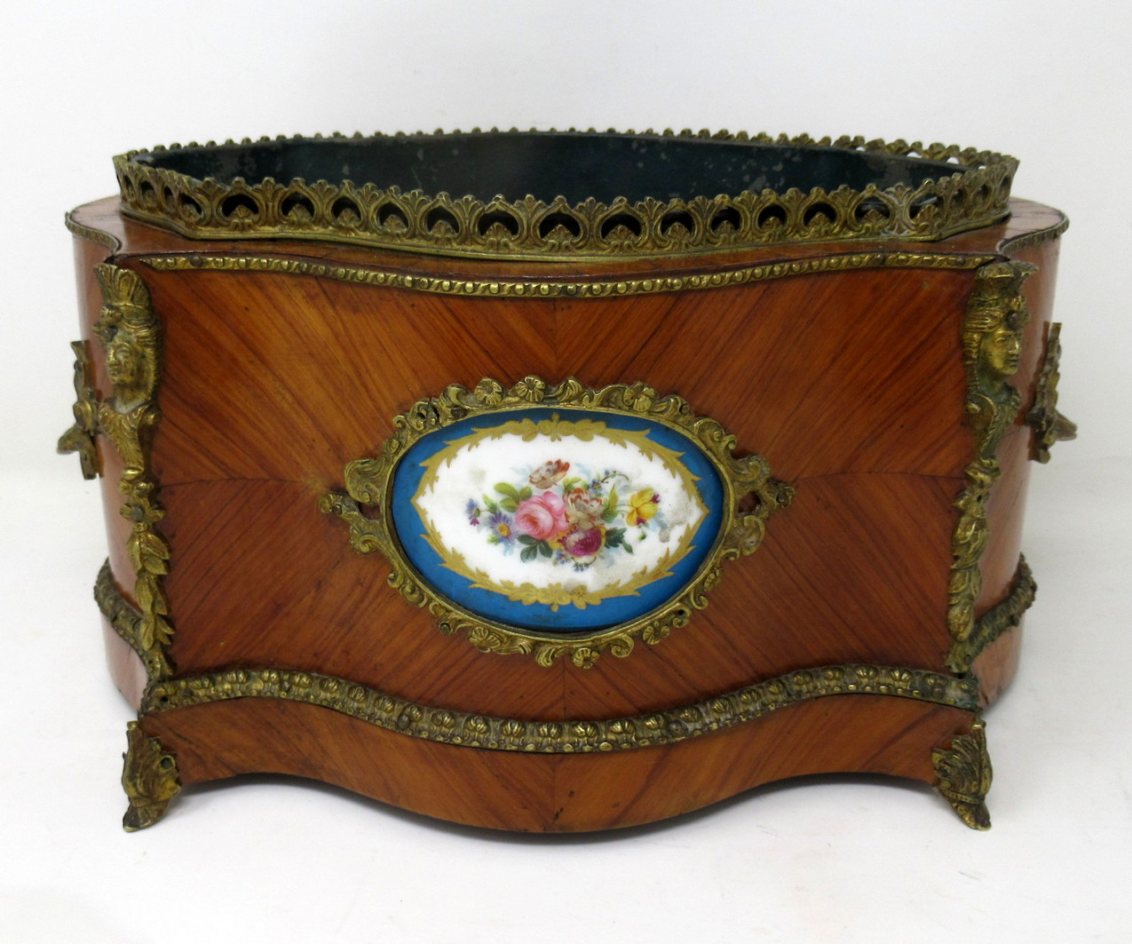 French Twin Handle Kingwood Jardinière of traditional oval form, with ormolu gallery pierced rail and ornate ormolu twin handles and central hand painted soft paste Sevres porcelain plaque depicting hand painted still life of flowers, complete with original painted tin liner.