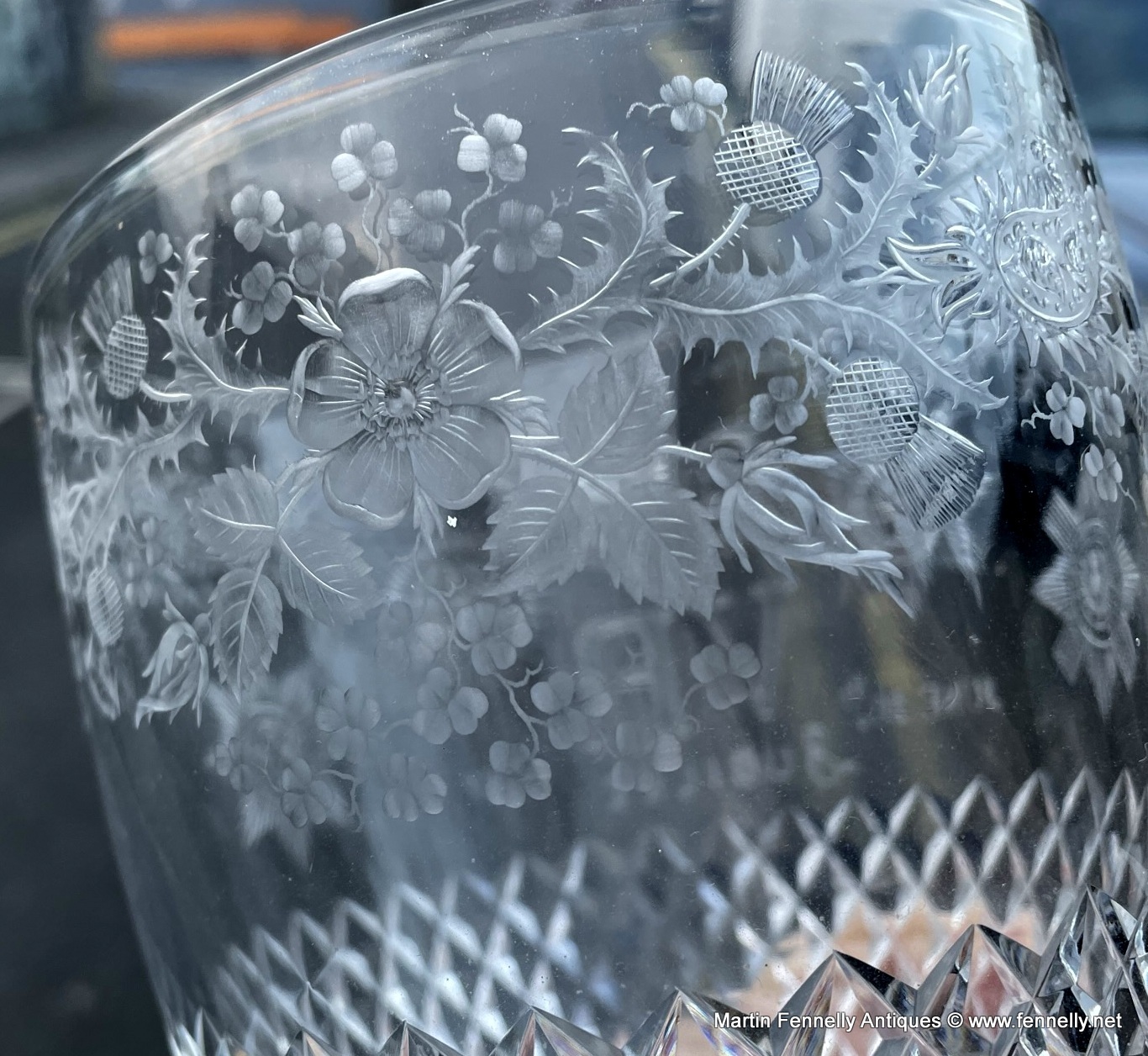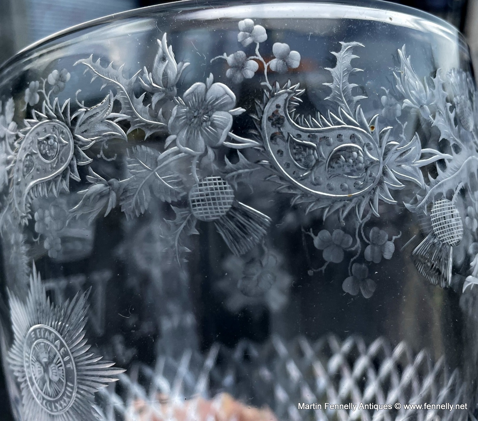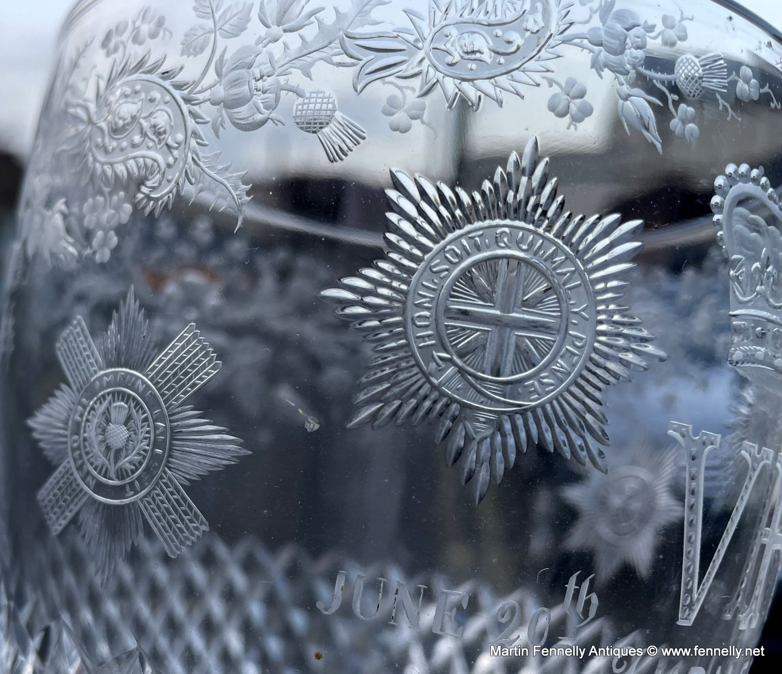 This Glass was produced in 1887 (June) to celebrate and commemorate The Royal Jubilee of Queen Victoria. The quality of the etching on this piece is superb. The Glass is a very rare piece and examples are very difficult to find. The Glass is etched with Thistles, Shamrocks, Crown and the four emblems that were very special to Queen Victoria.