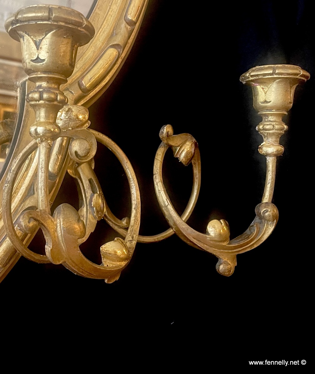 This is a beautiful English Girandole Mirror dating to Circa 1850. The Mirror has original back boards and the old gilt has a deep rich patina. It is carved wood with the original gilt finish. Floral and leaf detail which is finely carved and twin candle holders to each side. This mirror is really beautiful and spent most of its long life at a lovely building on Stephens Green here in Dublin.