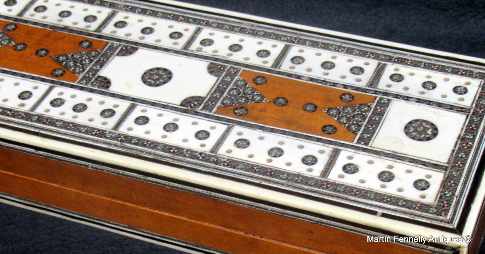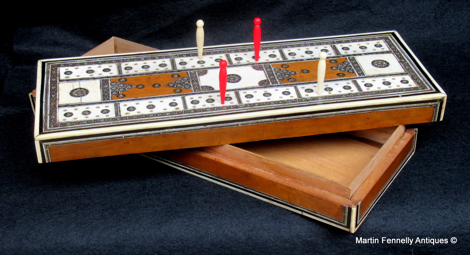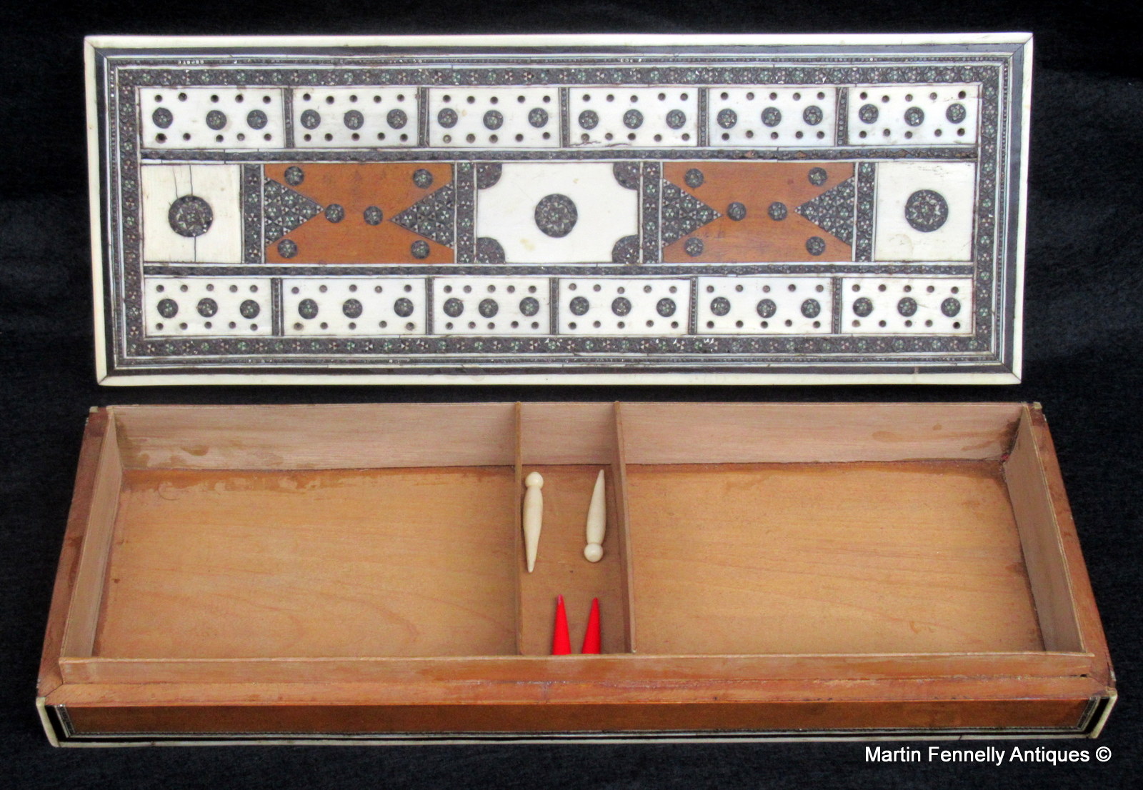 An Anglo Indian Vizagapatam Cribbage box made Sandal wood carcass veneered with Ebony and Ivory. Circa 1860. The top of the box is profusely decorated with engraved ivory and mico mosaic detail. The top opens to reveal three compartments to take playing cards and a small central compartment to store the marking pegs. The sides and edges are finish in Ivory with Ebony stringing. Originally made for the European market this Mid 19th Century Cribbage box is a lovely gift idea for the Cribbage player in your life.