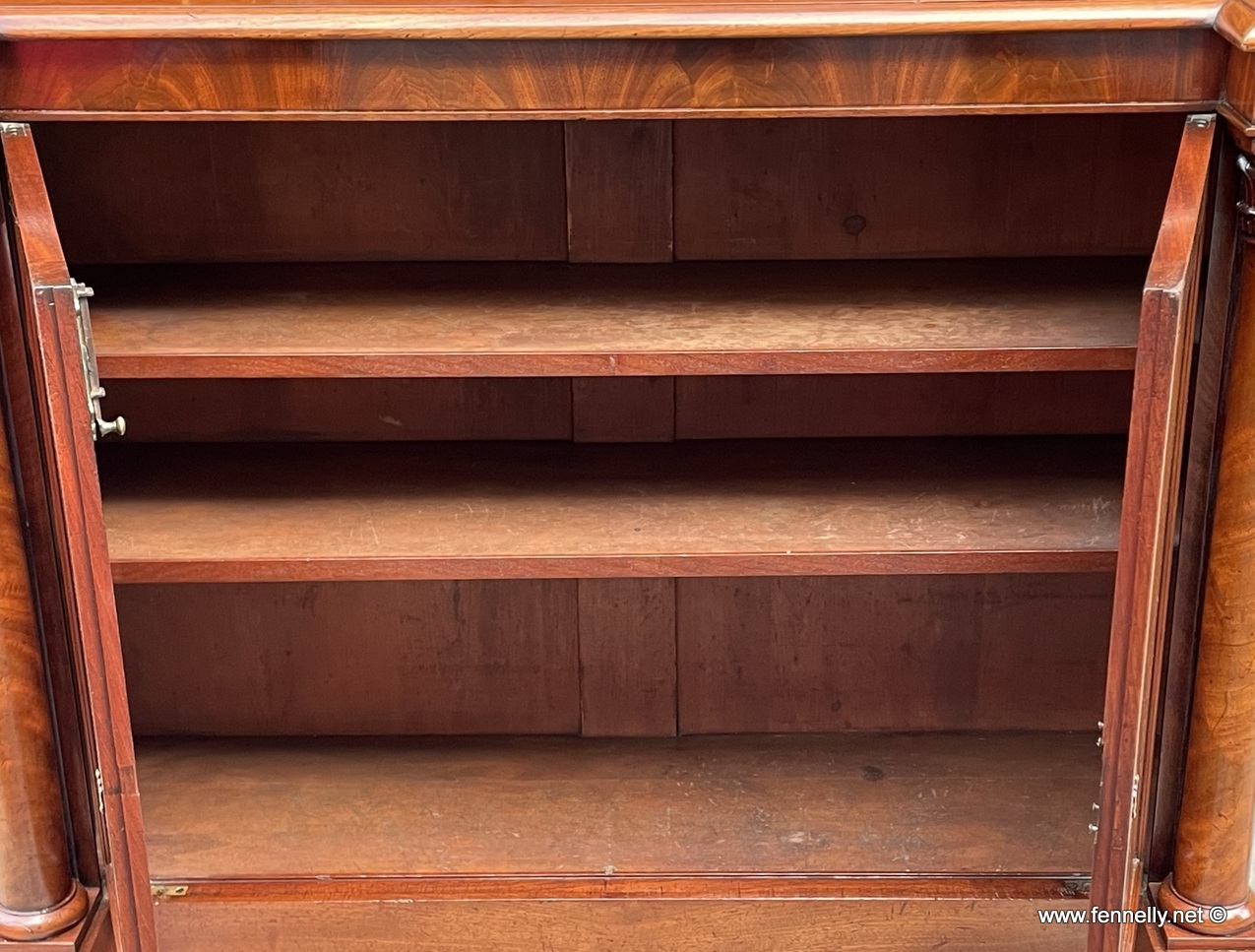 Well Figured Irish Mahogany Side Cabinet by Williams and Gibton of Dublin. This beautiful piece of stamped and numbered Irish furniture dates to Circa 1820. The rectangular Mahogany top with twin panelled doors enclosing a shelved interior, flanked by twin columns with carved detail. The quality of the Mahogany is very apparent on this piece with the wonderful flame mahogany which is sourced near the base of the tree used on the doors and creating a wonderful visual impact. The original working locks are present. The Cabinet just needed some light restoring from our Master Craftmen with a wax finish returning the glorious Patina back to the original Georgian condition. This is a superb piece of Irish History and a lucky find for my Gallery