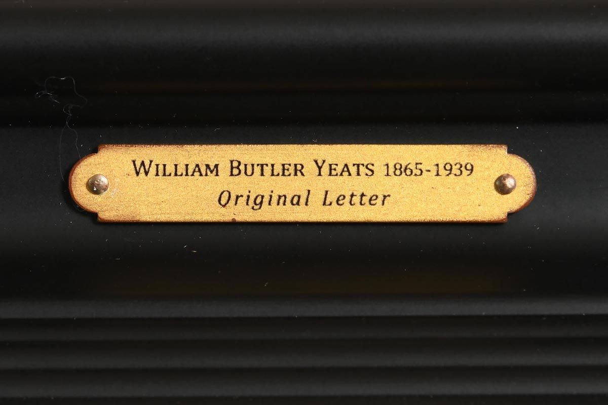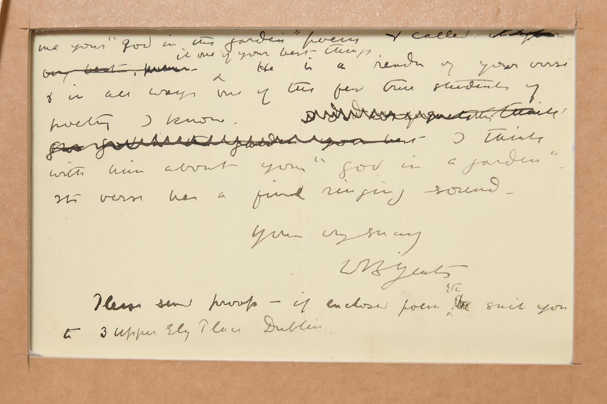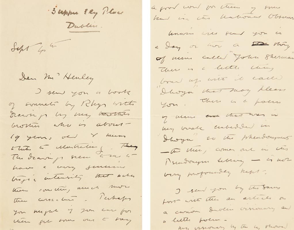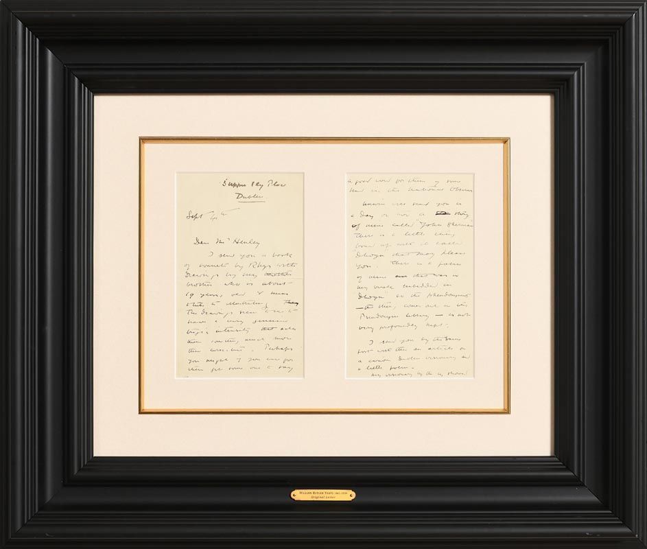 W.B. Yeats (Irish) (1865-1939) Poet and Dramatist – Signed Letter. Yeats won the Nobel Prizer for Literature in 1923. The letter bears a good signature, W B Yeats, Dublin, 4th September (1890), to W. E. Henley. Yeats sends Henley a book of sonnets by Rhys ‘with drawings by my brother who is about 19 years old & means to take to illustrating’, adding ‘The drawings seem to me to have a very genuine tragic intensity that makes them something much more than caricatures. Perhaps you might if you care for them get some one to say a good word for them of some kind in the National Observer’. Yeats also explains that the publisher Unwin will shortly be sending Henley a copy of John Sherman, remarking ‘There is a little thing bound up with it called ”Dhoya” that may please you. There is a poem of mine that was in my book embedded in ”Dhoya” so the pseudonymer – the thing comes out in the Pseudonym Library – is not very profoundly kept’, further stating that he is sending an article ‘on a curious Dublin visionary and a little poem’, adding ‘My visionary by the by showed me your ”God in the garden” poems & called it one of your best things. He is a reader of your verse & in all ways one of the few true students of poetry I know. I think with him about your ”God in a garden”. Its verse has a fine ringing sound’. In a postscript Yeats provides his address in Dublin for the proofs of the poem to be sent to, should it suit Henley. A letter of good content and referencing some insight into William’s early thoughts on Jack’s work. Condition is about very good.