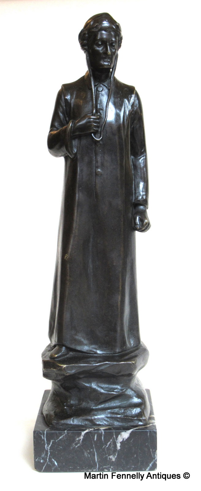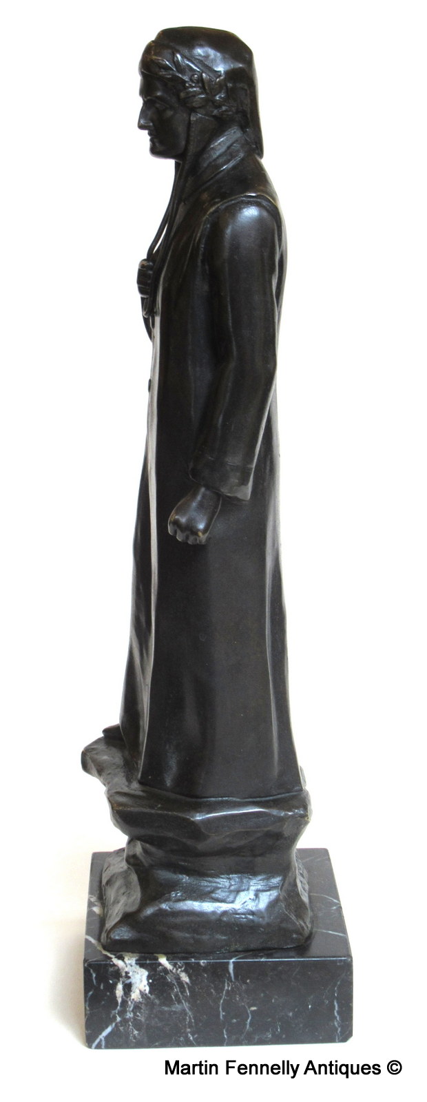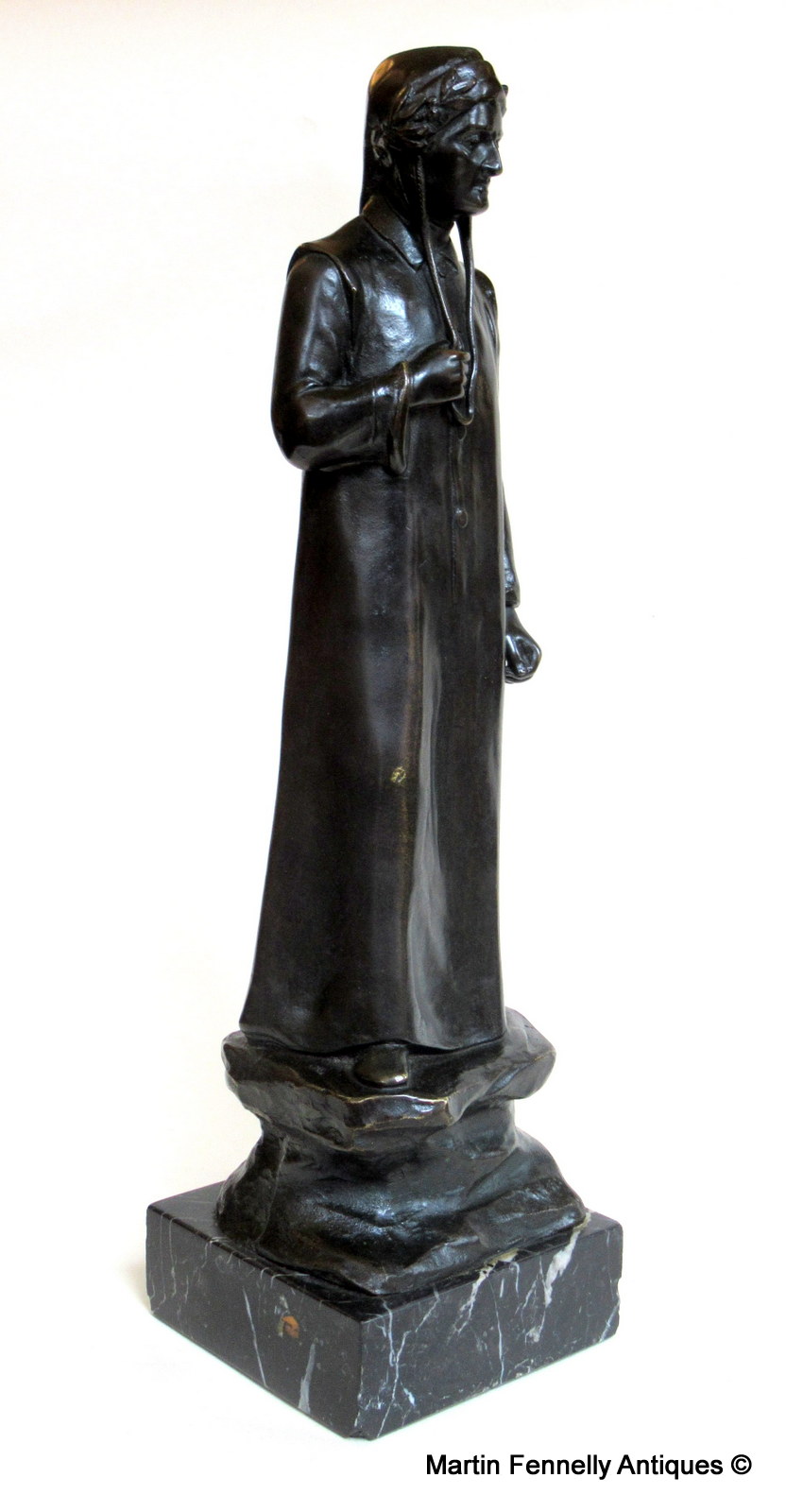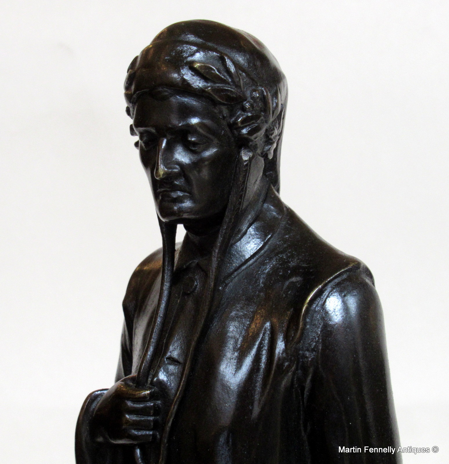 Superb Bronze Sculpture by Tito Angelini (1806-1878) of Dante. Durante degli Alighieri, usually simply known as Dante was born in Florence in about 1265. He wrote the Infeno, the first part of the Divine Comedy by about 1300. He is considered the father of the Italian language and perhaps their greatest poet. This lovely bronze, with fine detail and with a great colour shows him in a full length coat and hat. Set on a marble base. Tito Angelini was an Italian sculptor and leader of the Academy of Fine Arts in Naples, where he was born and died. His studies in Rome led to an influence by the pre-eminent Neoclassic sculptors of his day, Canova and the Danish Thorvaldsen. This Bronze is superbly cast, rare and in tandem with all bronzes changes colour depending on light (internal tend to be dark and external more of a brown patiniation).