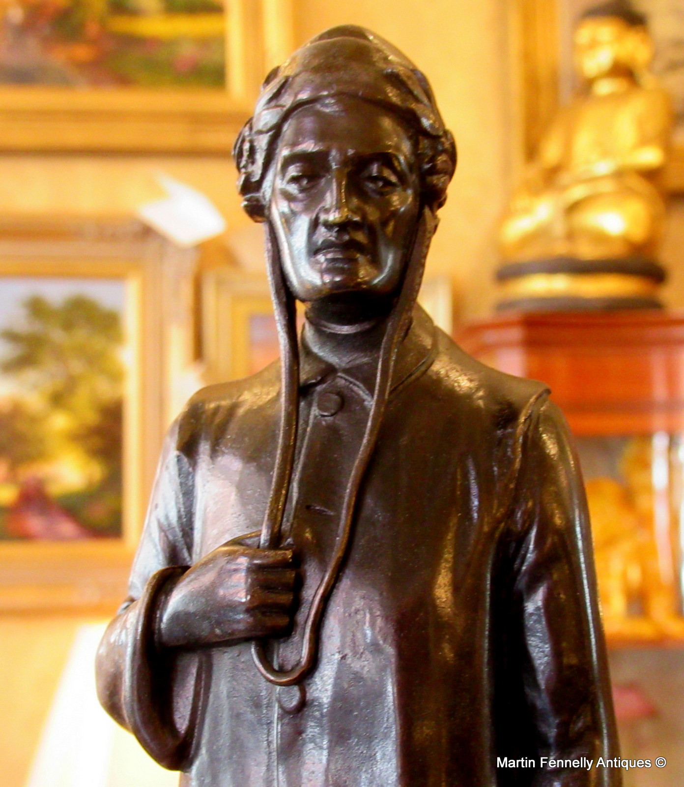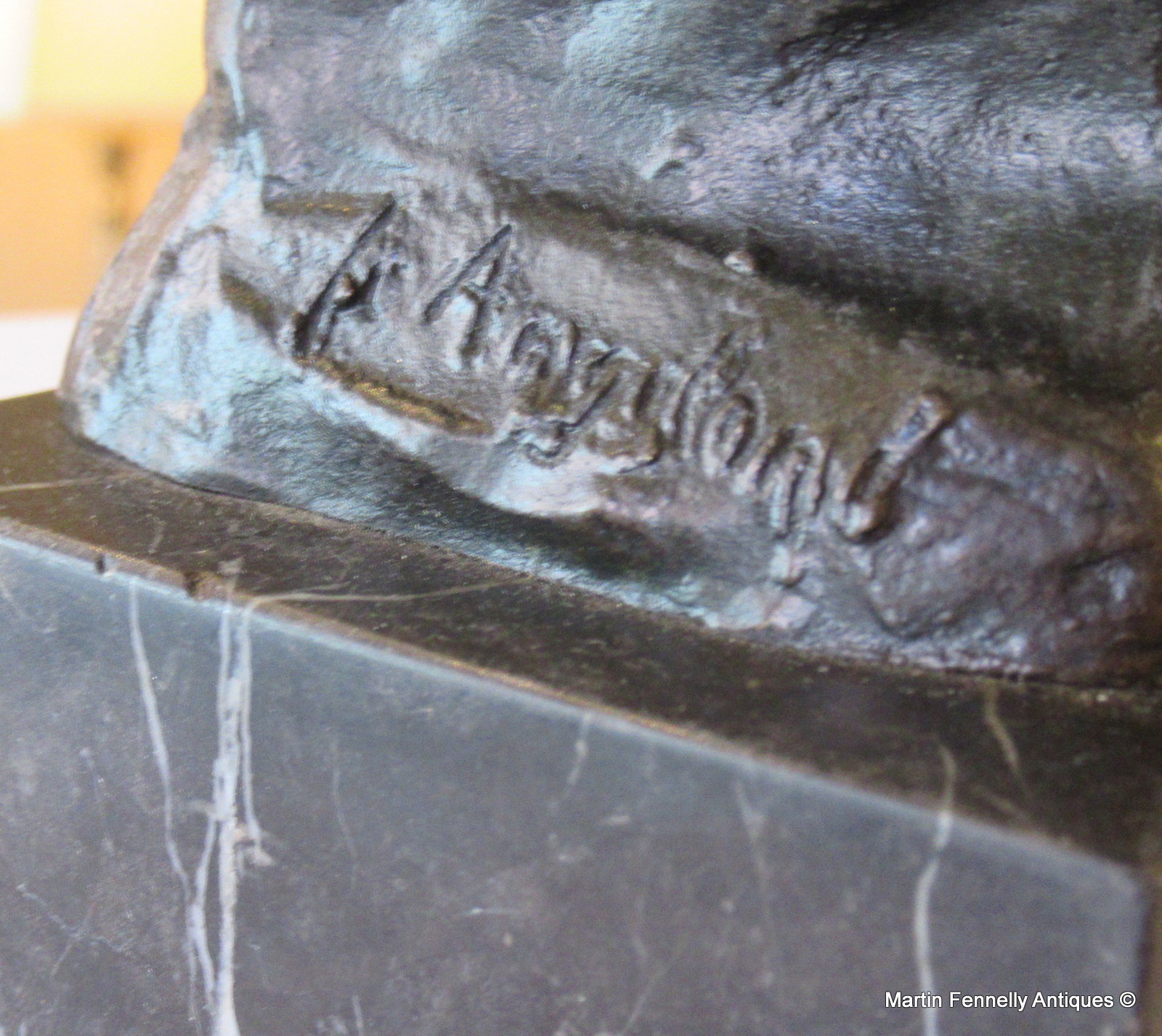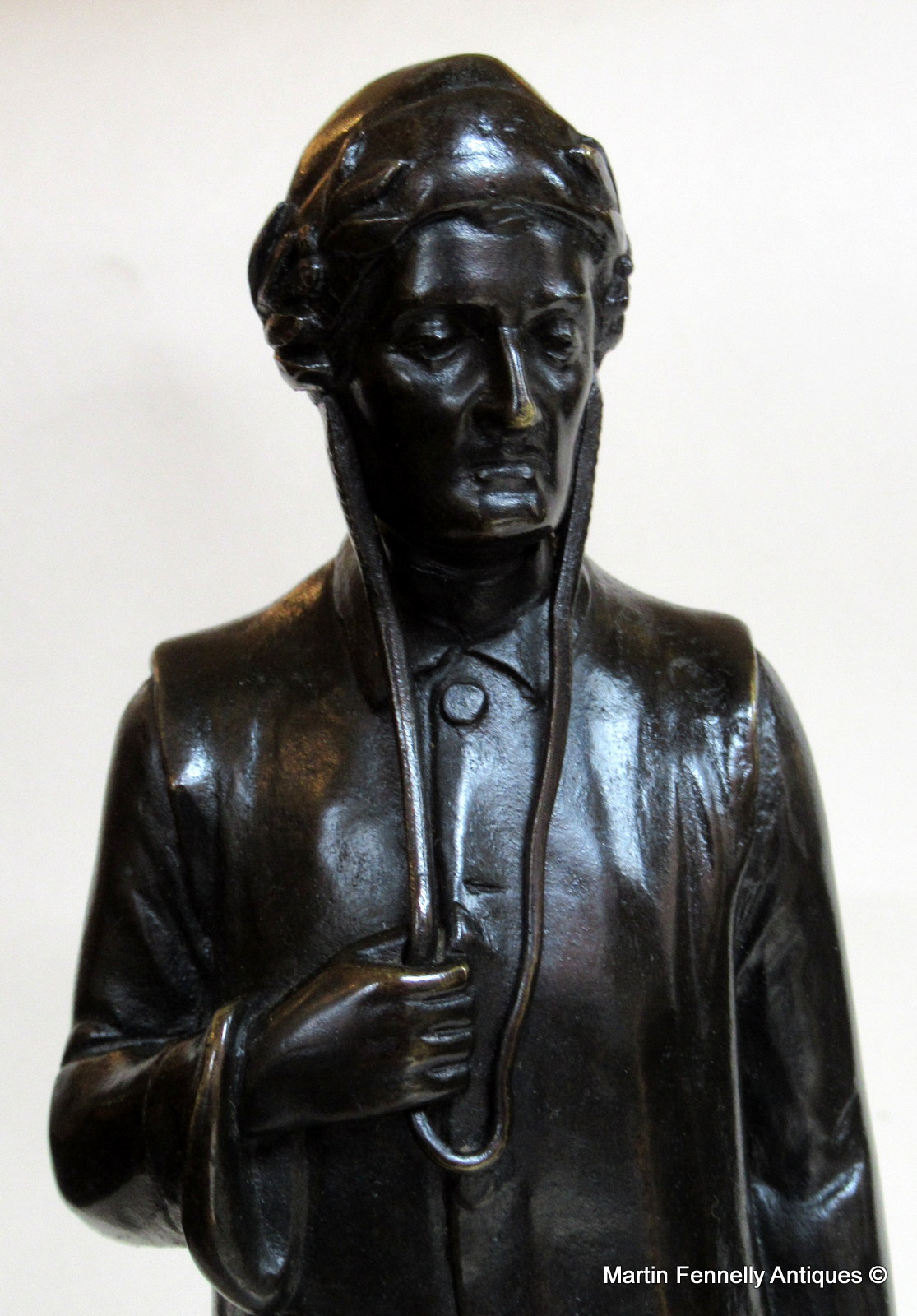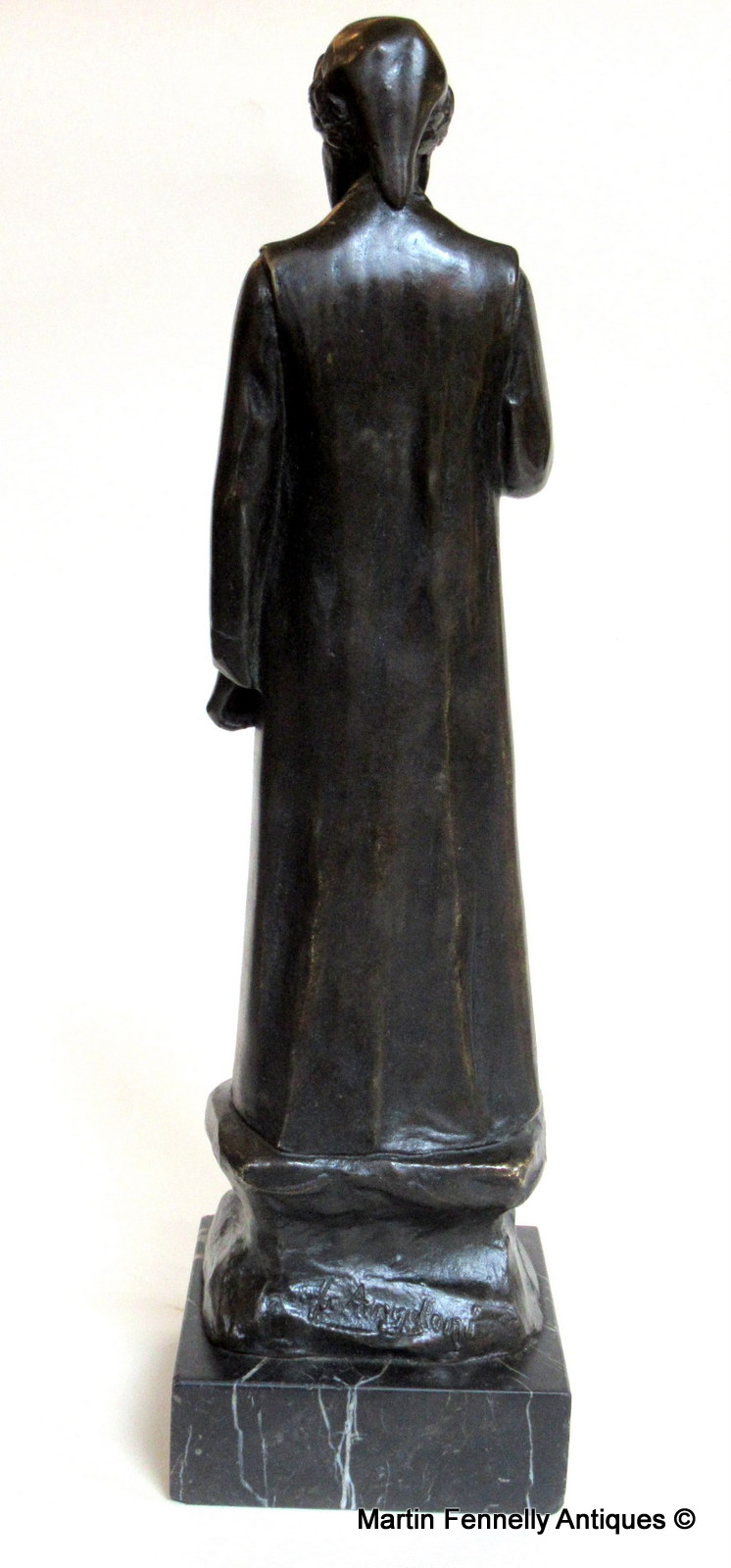 Superb Bronze Sculpture by Tito Angelini (1806-1878) of Dante. Durante degli Alighieri, usually simply known as Dante was born in Florence in about 1265. He wrote the Infeno, the first part of the Divine Comedy by about 1300. He is considered the father of the Italian language and perhaps their greatest poet. This lovely bronze, with fine detail and with a great colour shows him in a full length coat and hat. Set on a marble base. Tito Angelini was an Italian sculptor and leader of the Academy of Fine Arts in Naples, where he was born and died. His studies in Rome led to an influence by the pre-eminent Neoclassic sculptors of his day, Canova and the Danish Thorvaldsen. This Bronze is superbly cast, rare and in tandem with all bronzes changes colour depending on light (internal tend to be dark and external more of a brown patiniation).