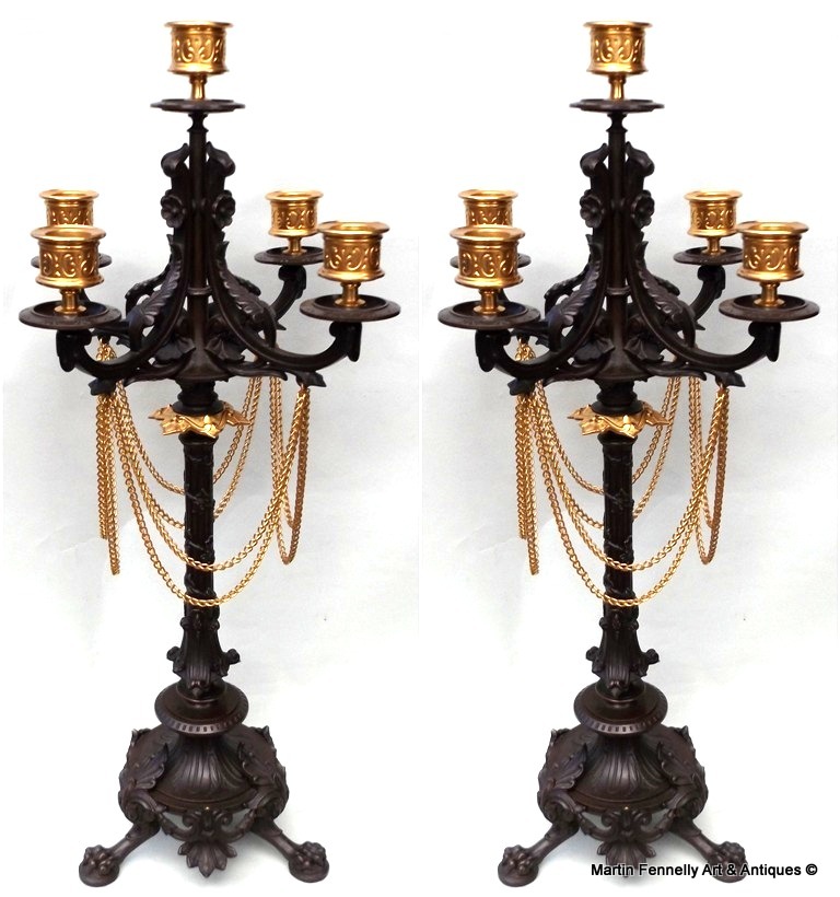 Fine Pair of Superbly Cast French Ormolu & Bronze Five Light Candelabras, each complete with original ormolu double hanging chains and firm fitting drip pans. Mid Nineteenth Century.The four ornate outswept reeded arms supported by a slender central bronze column ending on a lavish cast bronze tri-form support with applied Acanthus leaves, standing on three claw feet. Condition: Superb condition with no losses, these pieces have been professionally re-gold plated and the Bronze areas which retain their original patination have been waxed.