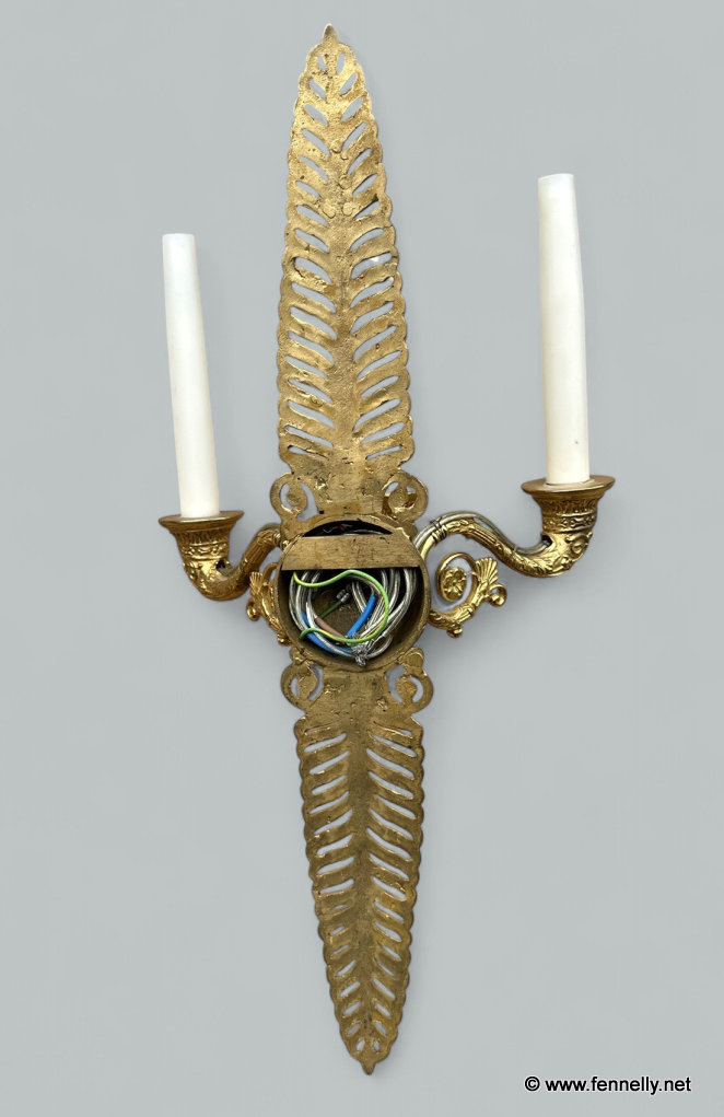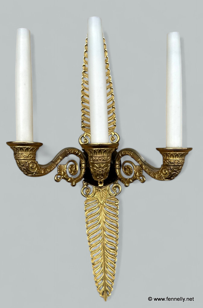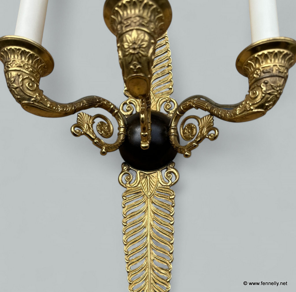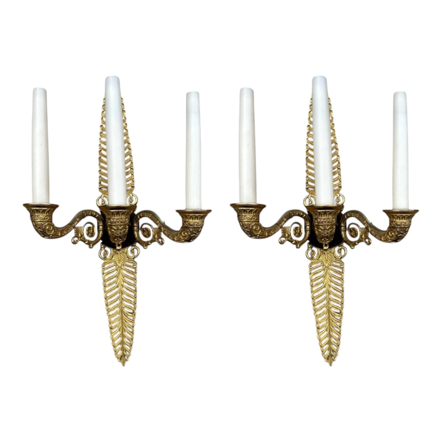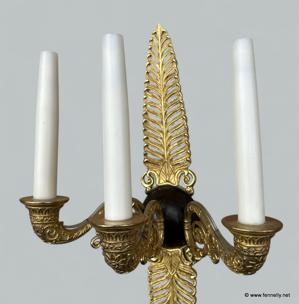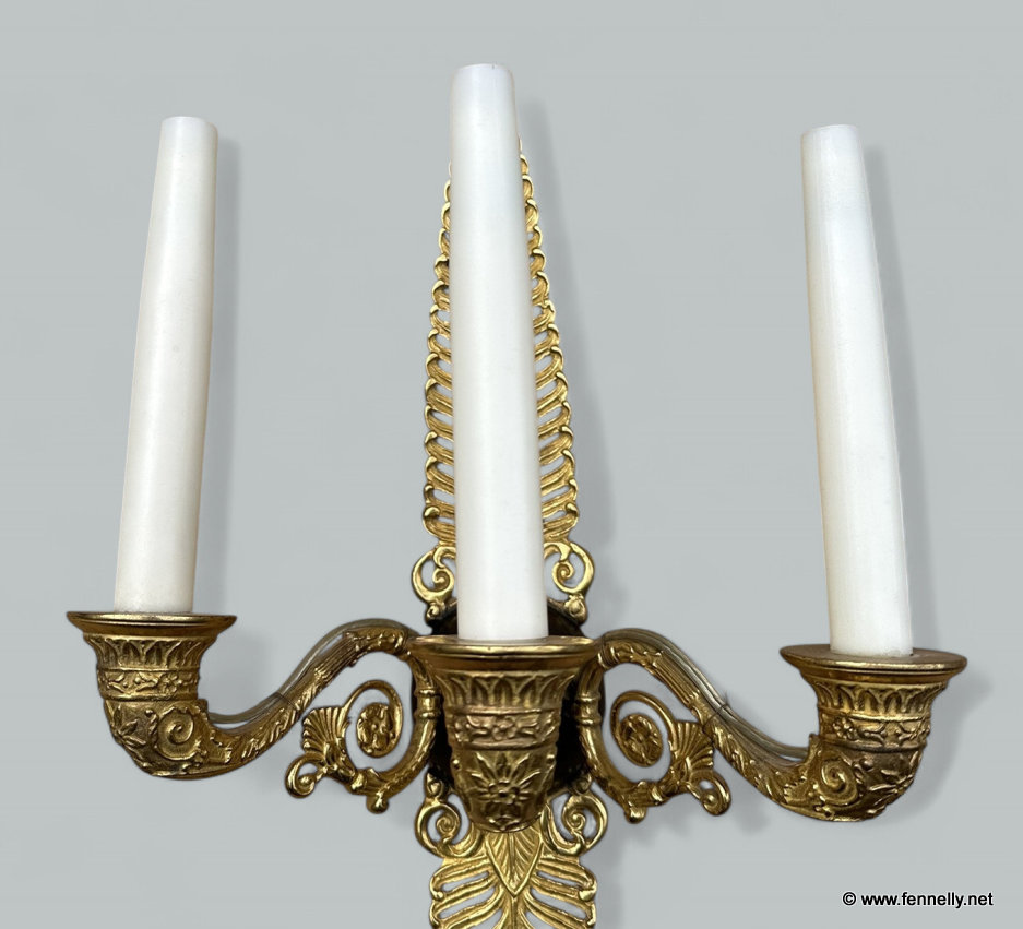 Fine Quality Pair of French Empire Gilt Bronze Three Arm Wall Candle Sconces Lights, of generous proportions, mid to late Nineteenth Century. The three leaf capped very ornate scroll arms issuing from patinated bronze circular support, the well-cast single central decorative tapering column backplate gives this stunning pair of wall lights a wonderful Regency style. Condition: Good condition with nice patination, these lights have been professionally re-gold plated, the electrical fittings, and wiring have been professionally replaced.