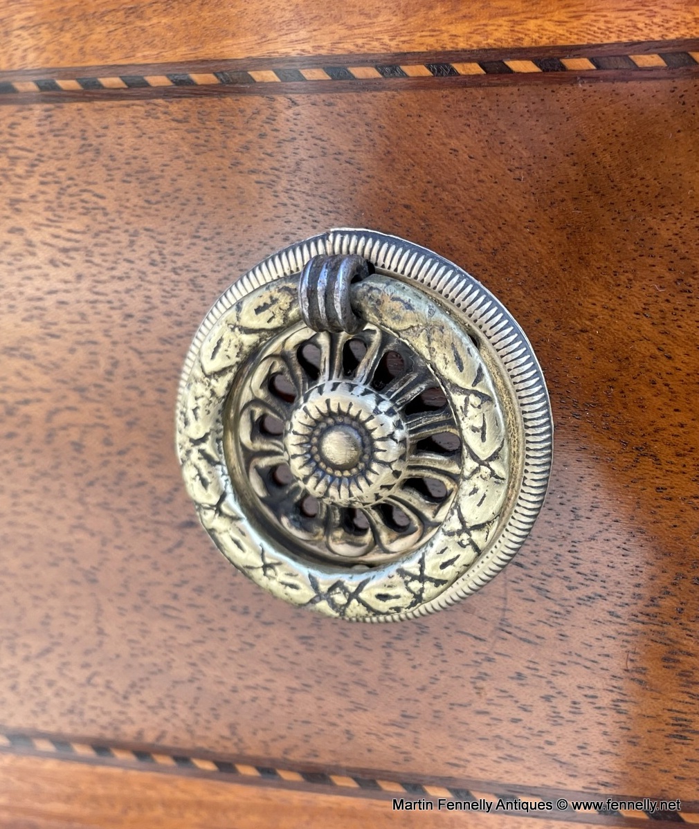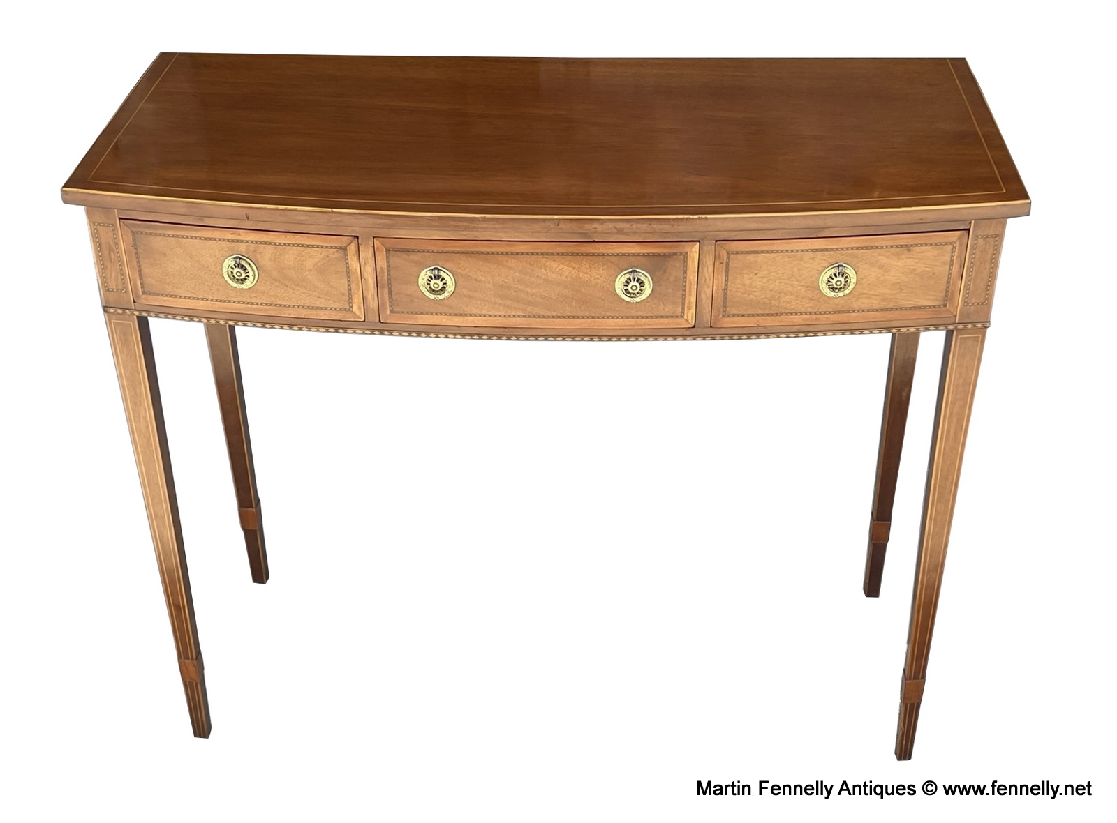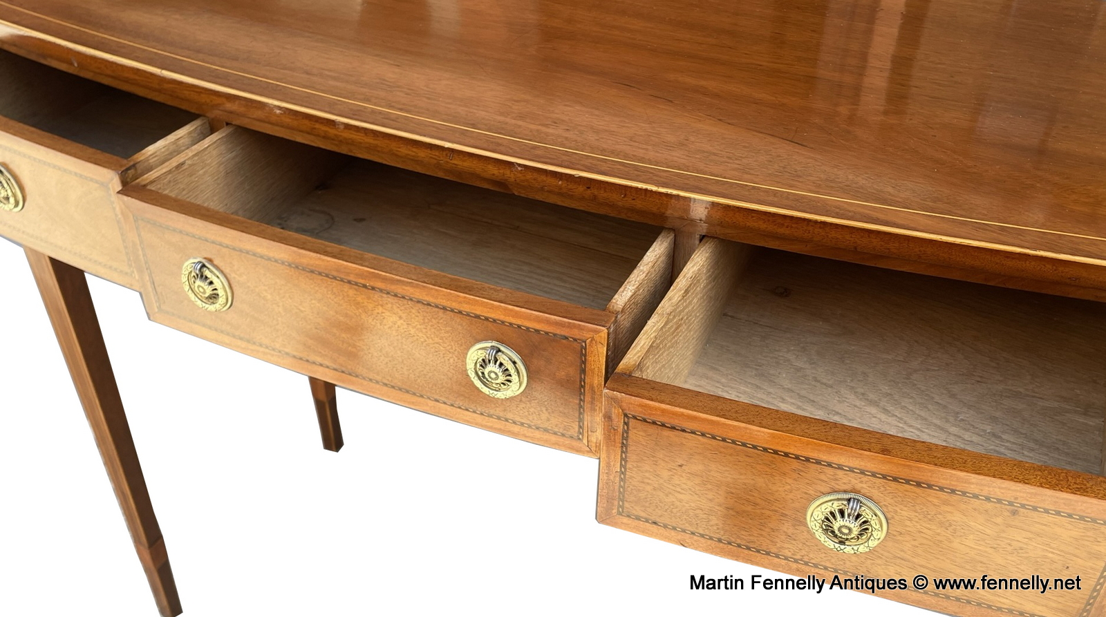 This is a superb piece of Irish Furniture made Circa 1900 by Hicks of Dublin. The Table is in the Sheraton Style and made from the finest Mahogany. The Table has Boxwood stringing to the top with Boxwood and Ebony stringing on the drawers which are oak lined. The original handles are present and the table is raised on four tapering legs. This piece of Irish History was located here in Dublin and although in excellent condition, our master restorers bought back that deep rich patina that 120 years of sunlight and use had diminished. The piece has the original Hicks Label to the back as shown.