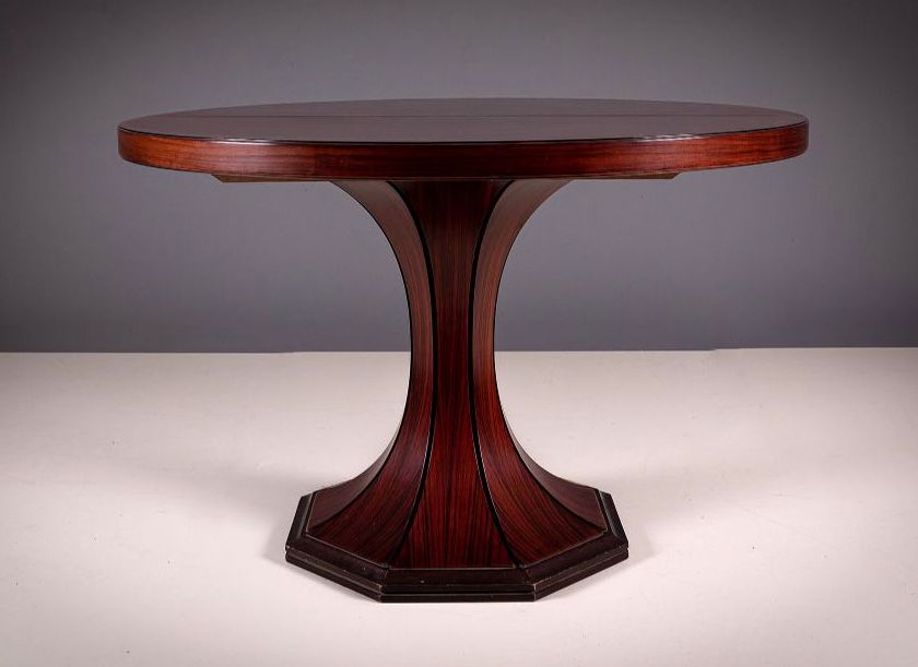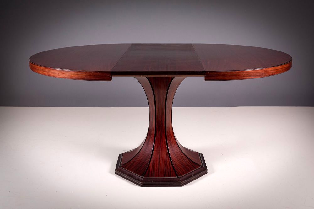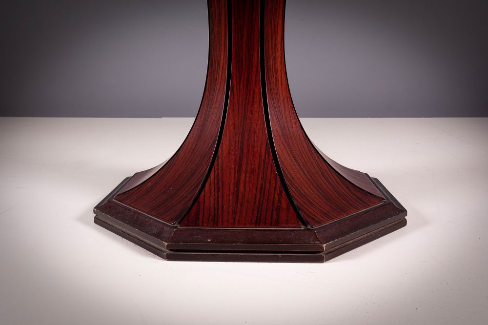 This is a truly stunning and rare pedestal (extendable) Mid Century Dining Table which was designed by Carlo de Carli (attributed) in Italy in the 1950s. The Table is made from the beautiful Palisander Wood from Bolivia/Brazil and the textured grain gives the table a wonderful patina. The seamless lines and sculptural octagonal shaped base is typical of Carlo de Carli and the use of one material emphasizes the solid look of this design piece. The table can accomodate 6 to 8 comfortably extended and when closed is perfect for 4 guests or makes for a work of art to place a vase of flowers on. The lacquer coating is original, nevertheless in great condition with barely noticeable, minor signs of wear. The 5cm thick tabletop opens to reveal the hidden leaf to extend the table. De Carli is famous for his design and this table encapsulates his essential talents succinctly