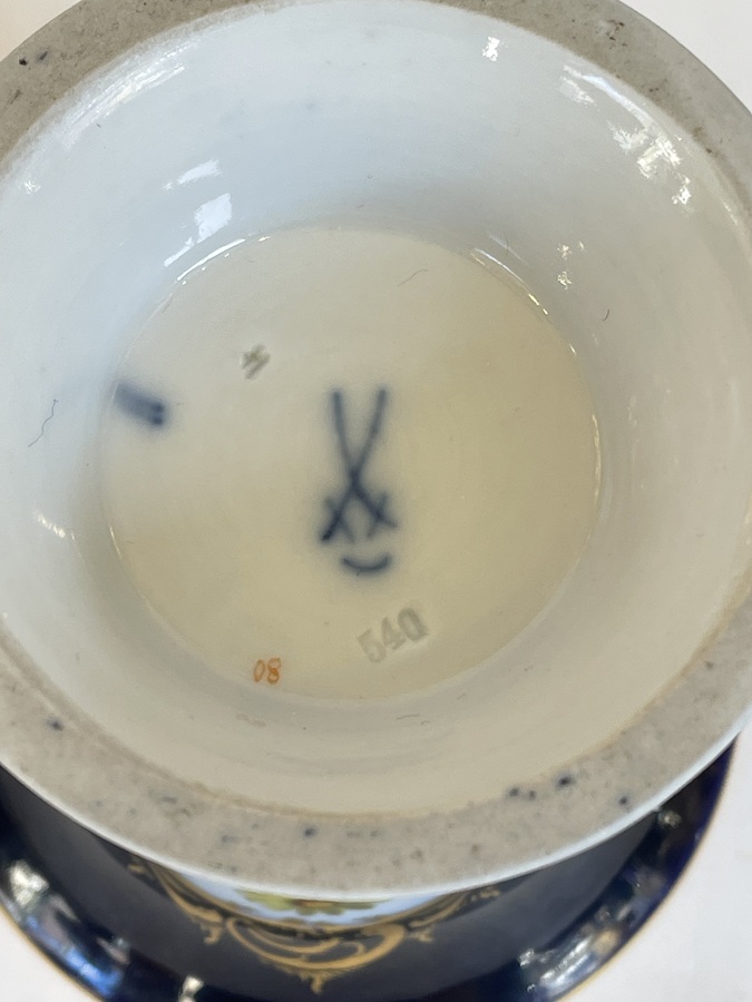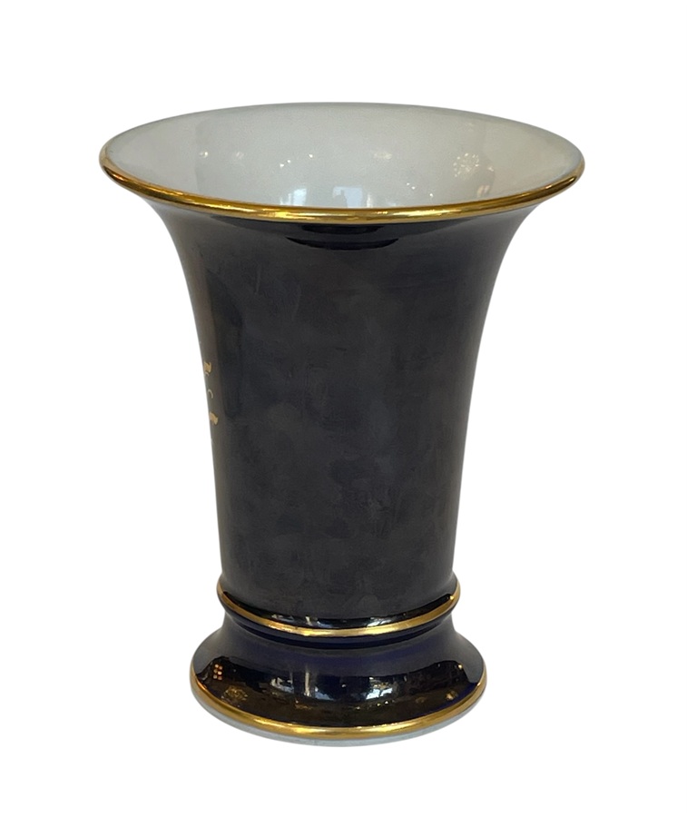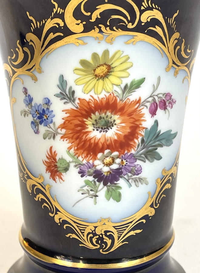 Meissen Porcelain Funnel/Trumpet Vase, 20th century Germany. Decorated with cobalt blue and gilding. Hand painted with flowers within the central Gilt Cartouche. Superb condition and Stamped to base with Meissen crossed swords.