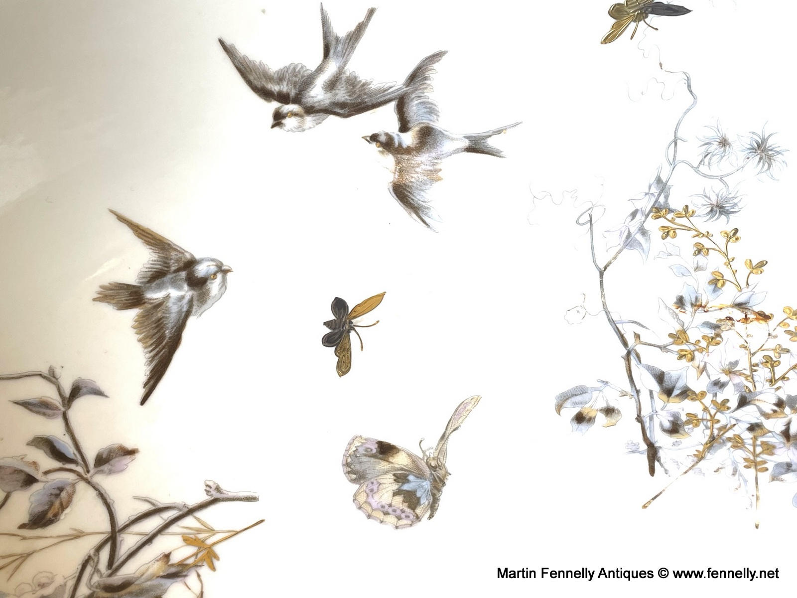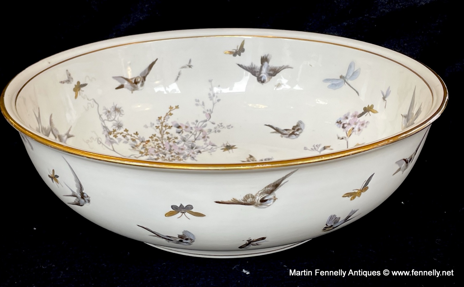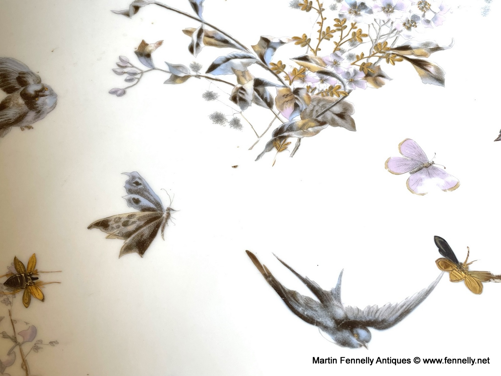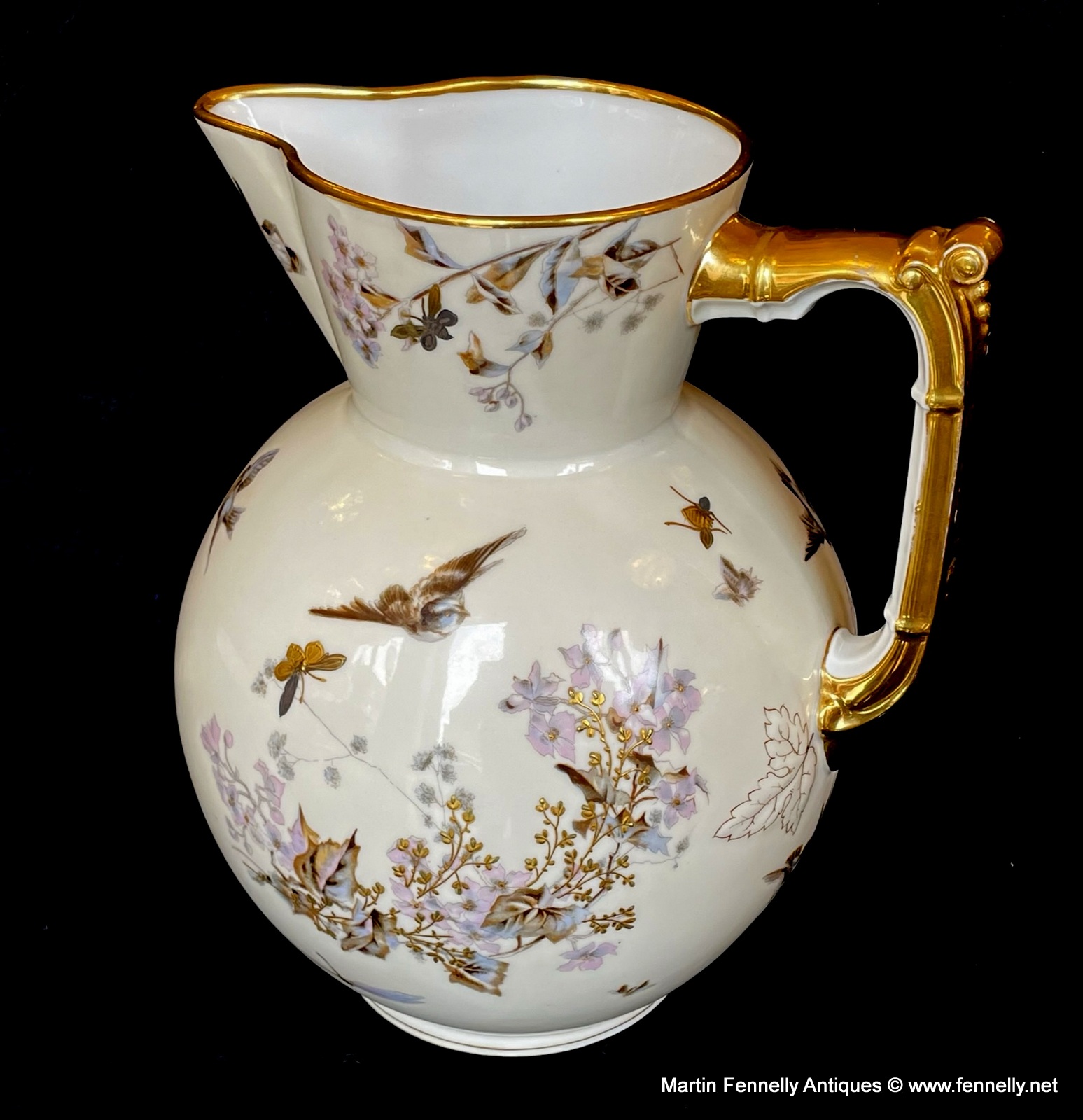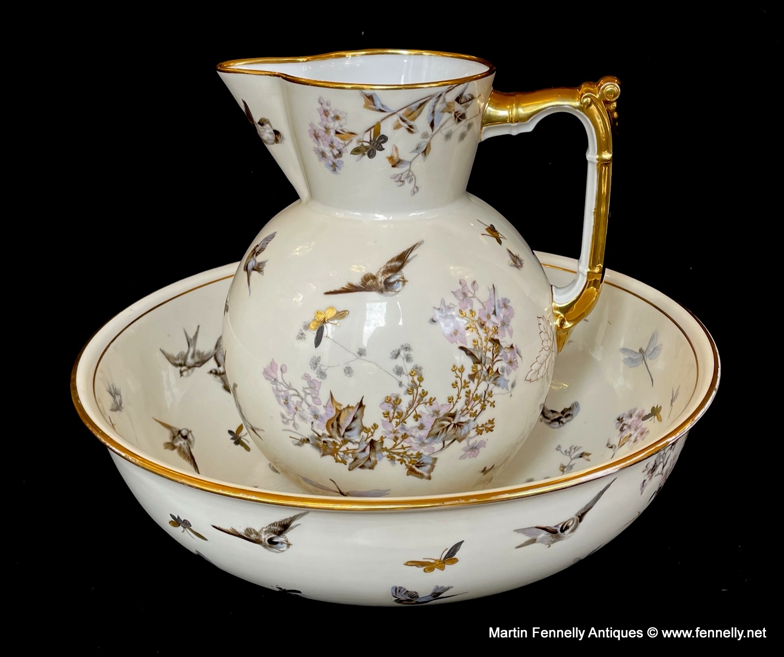 This is a lovely Bathroom Set from Fischer & Mieg of Pirkenhammer. Marked to the base with F & M and dating to Circa 1860. This large set is beautifully decorated with Birds, Butterflies, Floral and other insects and finished with gold rim detail. The hnd painting is excellent quality and there is some wear which is expected with pieces this old.