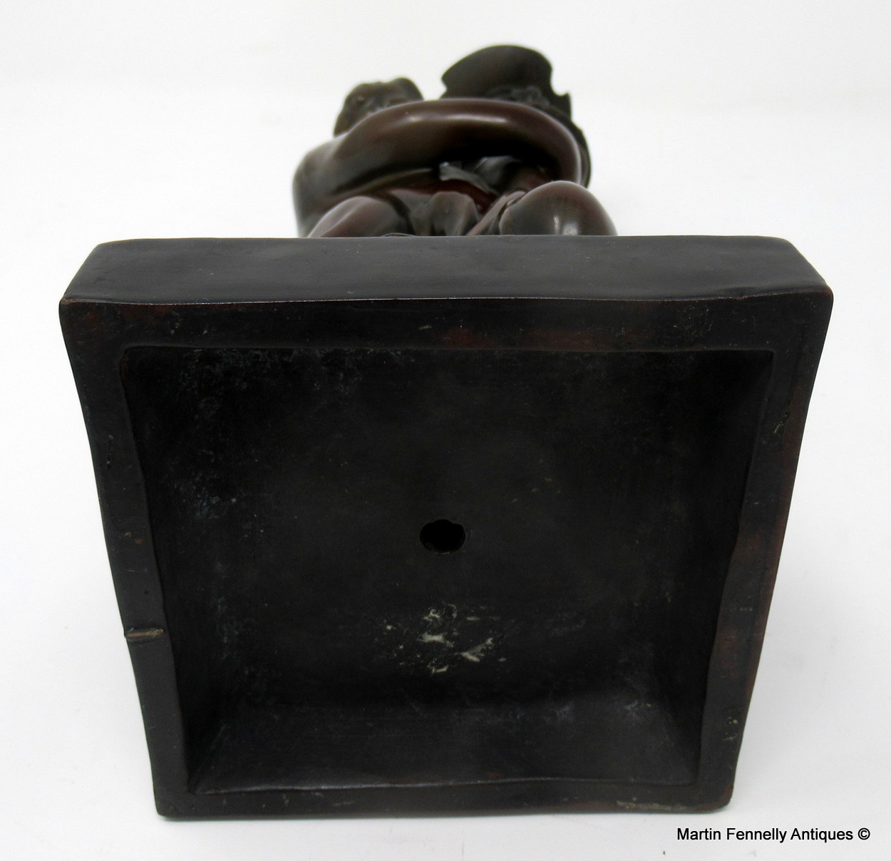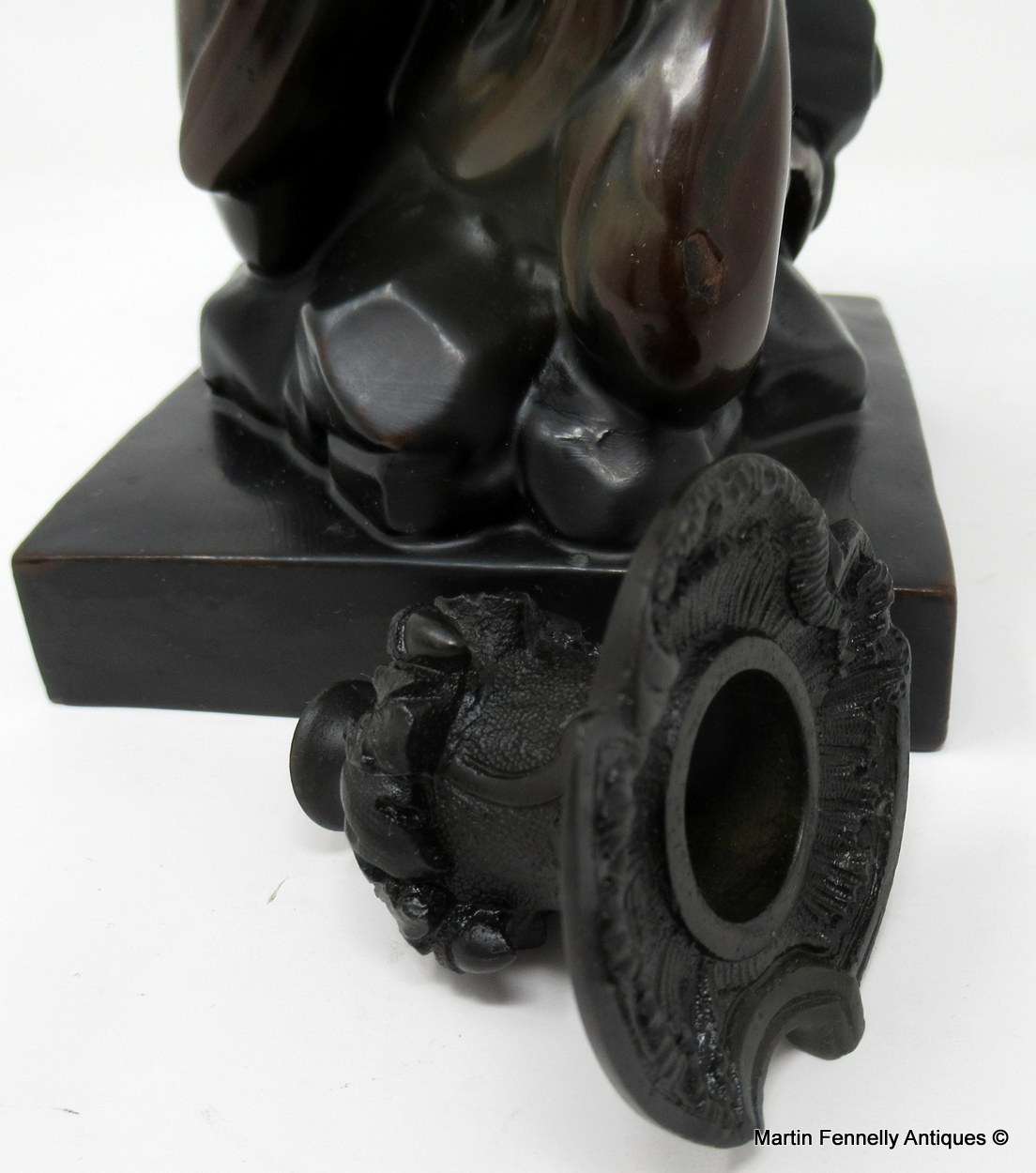 The figure is seated on a rocky outcrop holding a Cornucopia which is mounted with a decorative patinated bronze removable single candle holder.