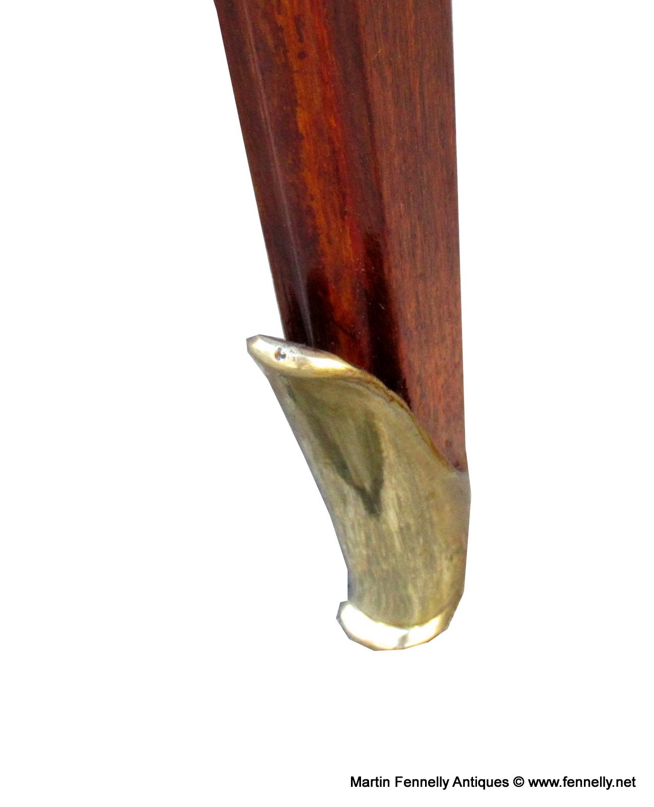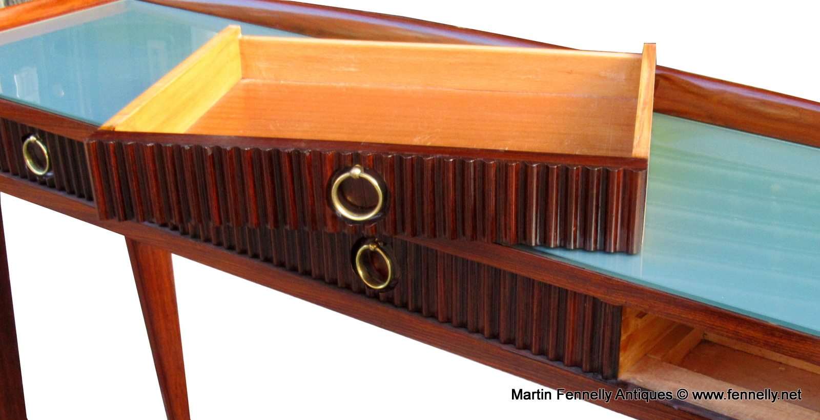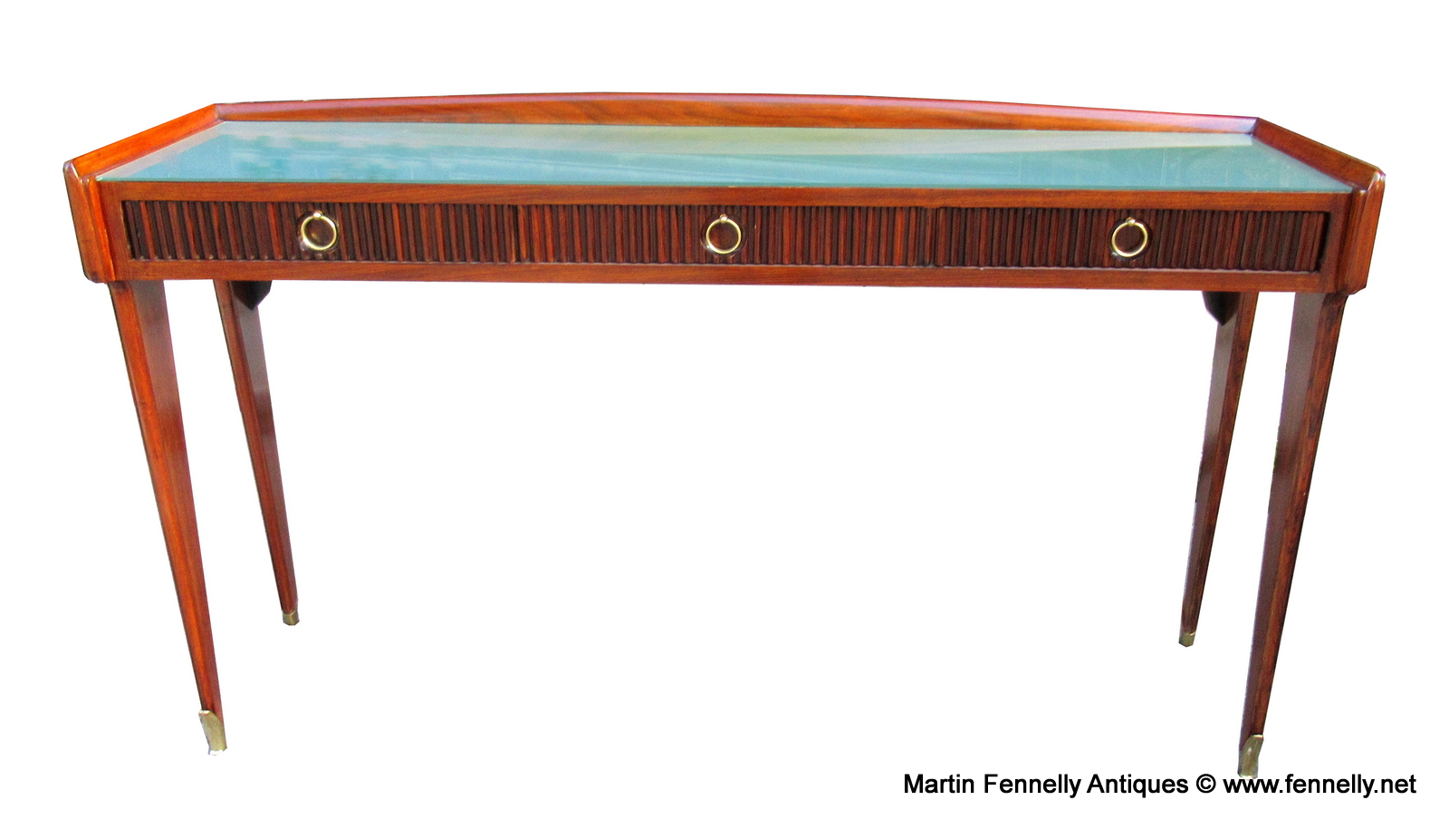 This is a very elegant Console table with firm attribution to Paolo Buffa of Italy. This piece is made from Mahogany with three drawer frieze below a green glass top. The drawers are completed with fluted rosewood facades, brass handles and the extremely graceful legs finished with brass sabots. The piece is all original and dates to Circa 1955. Paolo Buffa (1903 – 1970) was a famed Furniture Designer and Architect and his pieces are very sought after especially, high end pieces like this one now at my Gallery. The firm Attribution is certified by members of The Premier Art and Antique Dealers of Ireland and a member of The Irish Antique Dealers Association.