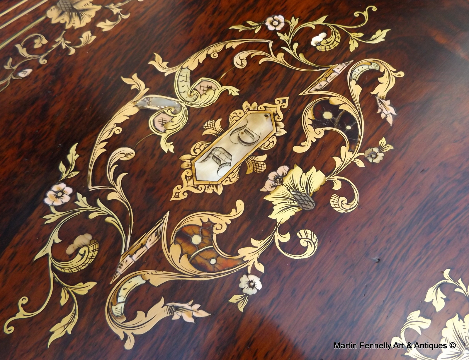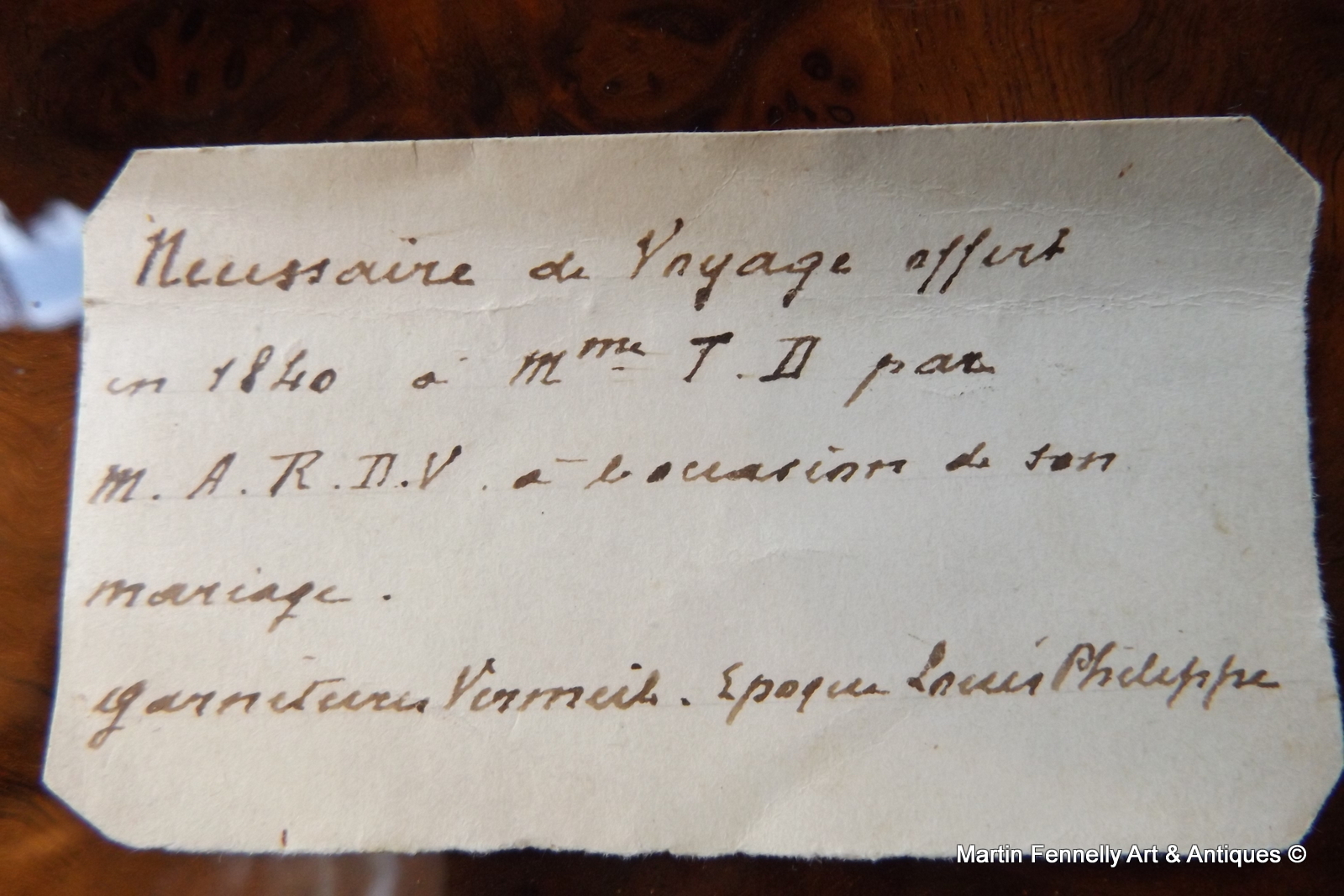 Antique French ‘Nécessaire de Voyage’ Dressing Case in Inlaid Rosewood possibly by Aucoc Ainé à Paris. This Gentlemans Travelling Casket was made in France in 1840 as a Wedding Present for someone really really important. It is a Superb piece of French construction and is a masterclass in Box making. The Box is made from the finest Rosewood and inlaid profusely with Brass, Mother of Pearl and Abalone Shell. The Initials on this Box were obviously intended for the Wedding of someone important in France in 1840. The Initials ‘DT’ are of course also the initials of someone very important running for President !!! – Mr.Donald Trump !! . This Box is Complete with all original Gilt Gold Contents and a myriad of compartments and storage Jars. The original Key and working lock are also Present