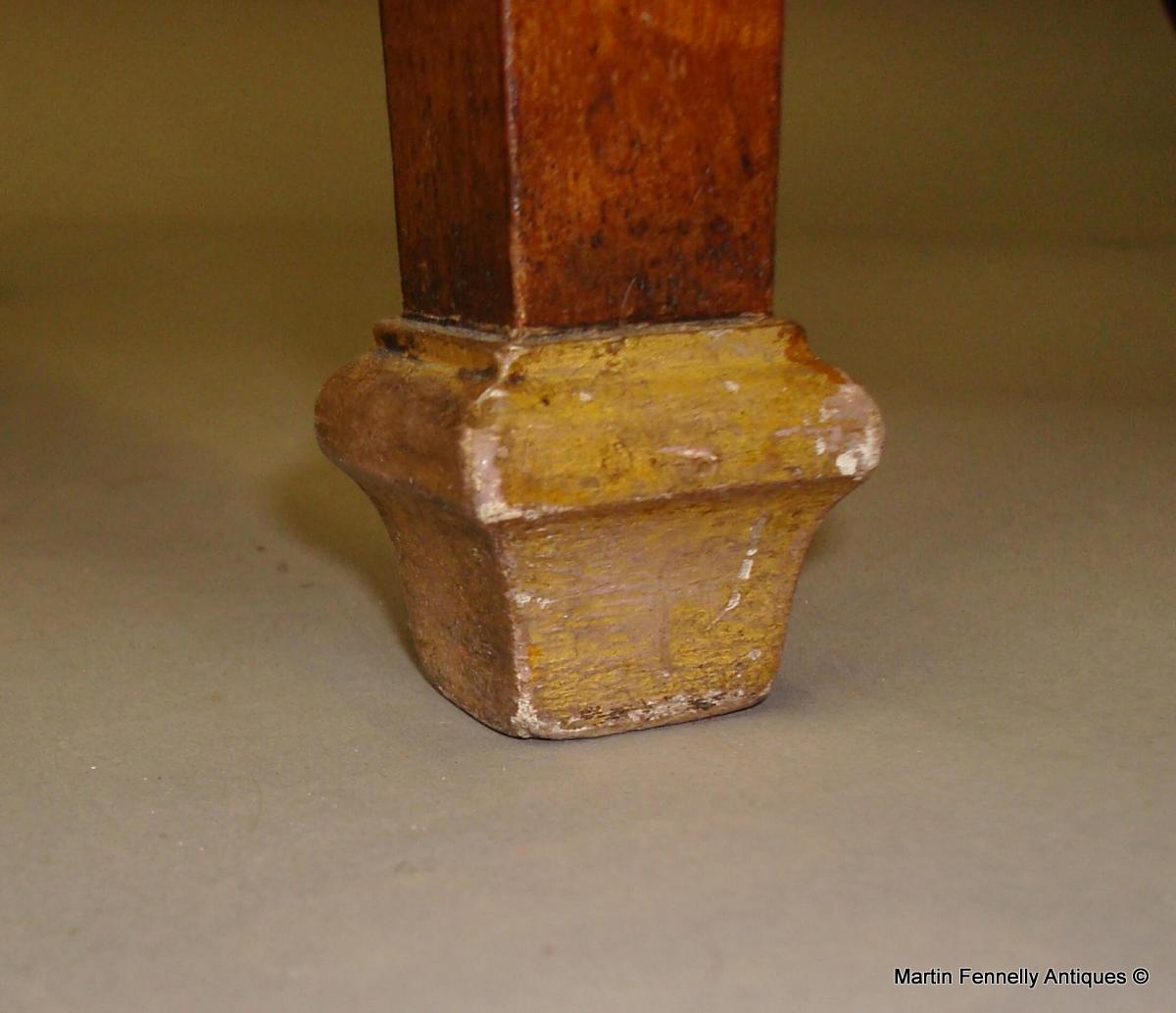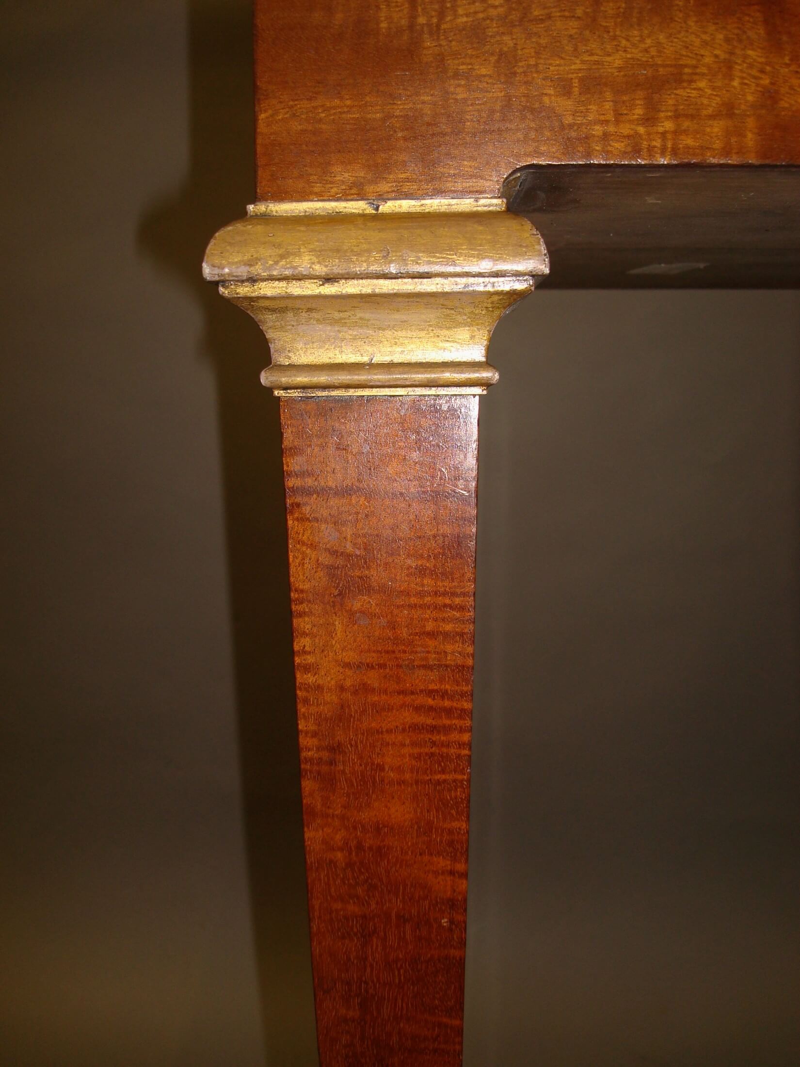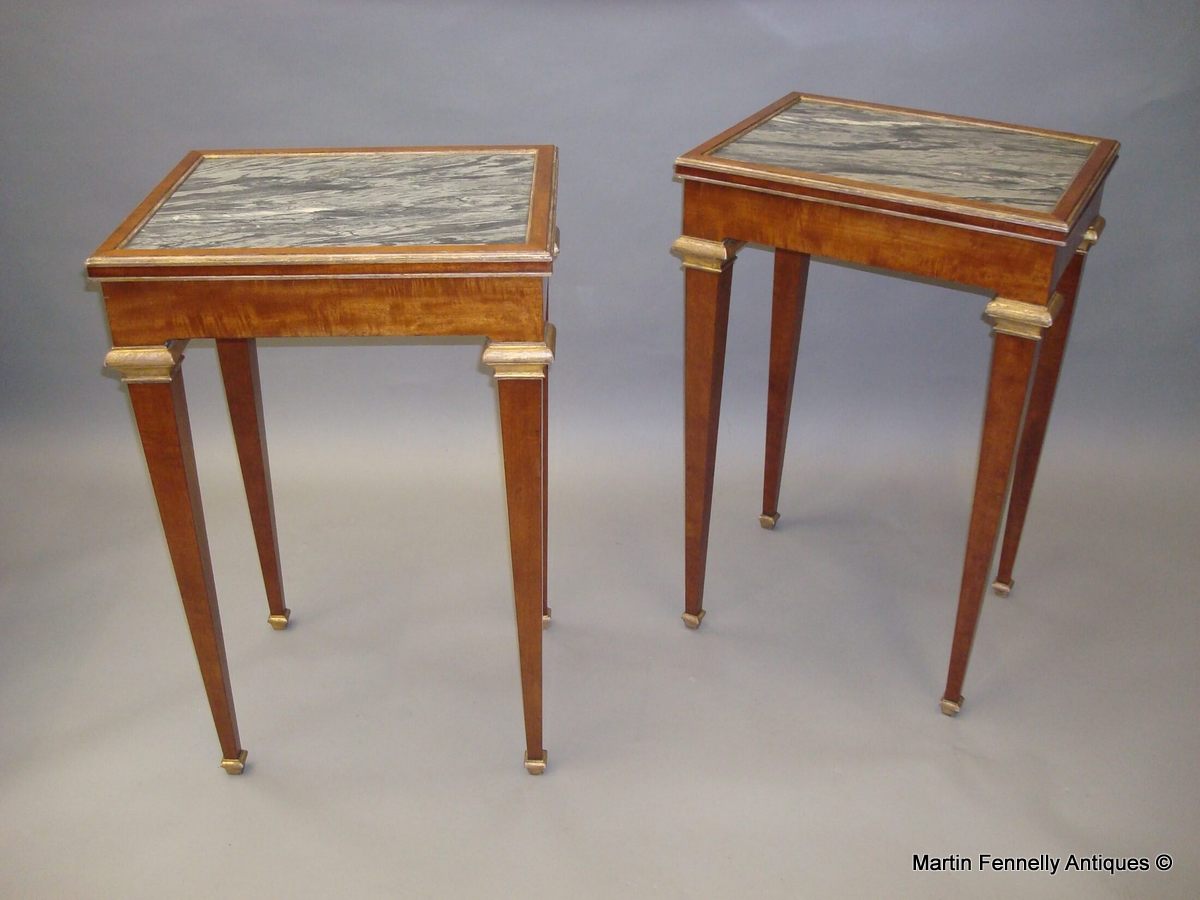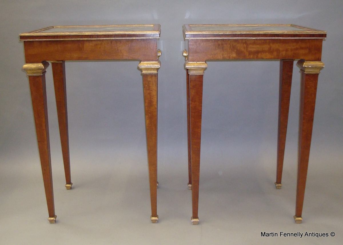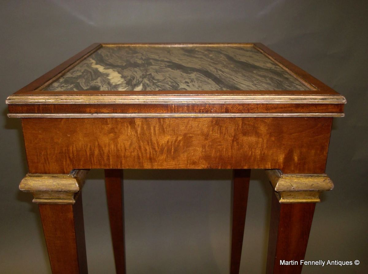 These are a Stylish 19th century Pair of Mahogany End Tables with Blue Tigre marble tops inset in a fiddleback Mahogany crossbanded frame, with narrow giltwood mouldings. The simple frieze also in fiddleback mahogany raised on square tapering legs headed with parcel gilt ogee shaped capitals and terminating in similar feet. The are a wonderfully designed pair of tables which are of a useful size and with rare detail. The design although from the late 19th Century fits very well with the current design vogue.