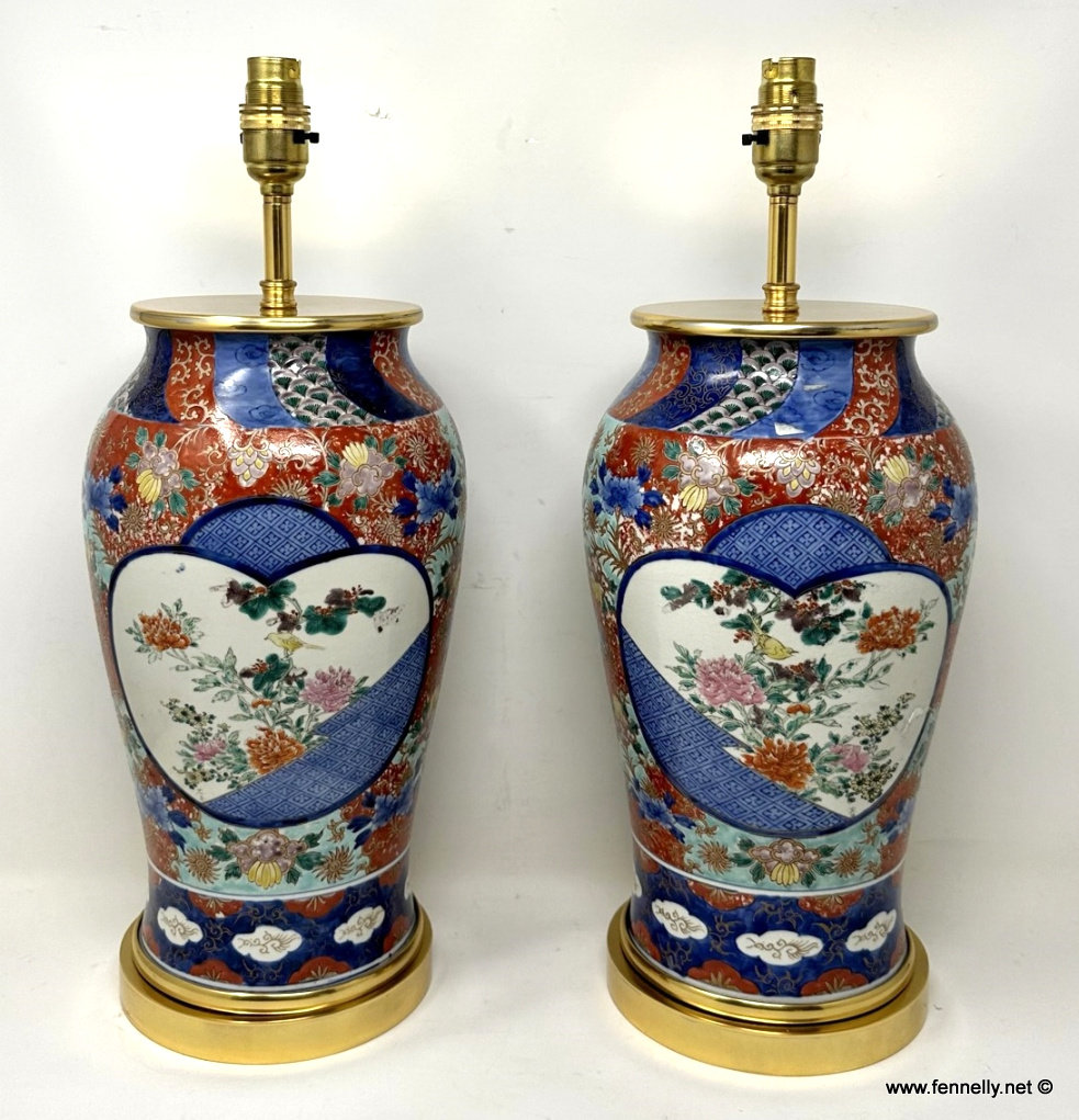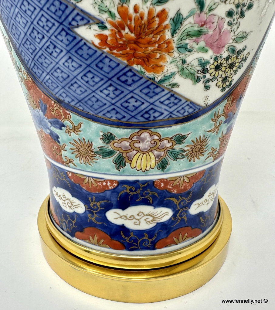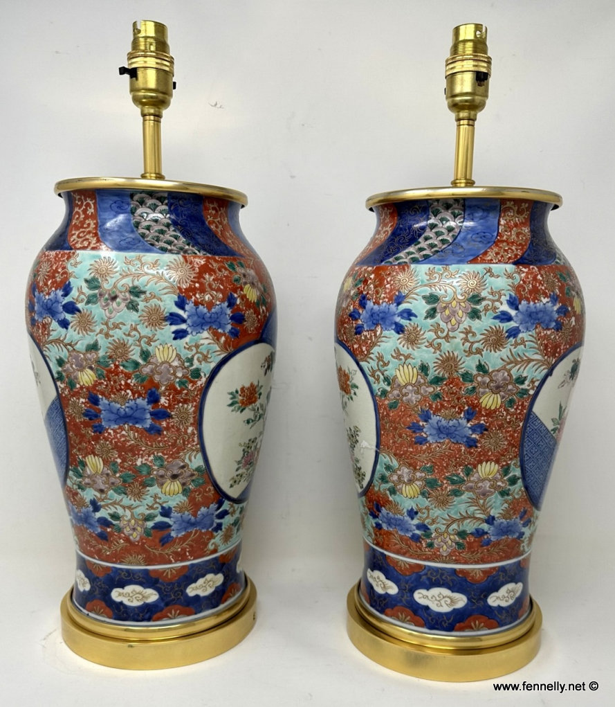 Pair Traditional Japanese Imari Bulbous Form Porcelain Vases of medium to large proportions, now converted to a pair of electric Table Lamps, complete with ormolu stepped circular bases and later ormolu mounts. Second half of the Nineteenth Century.