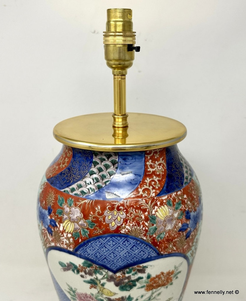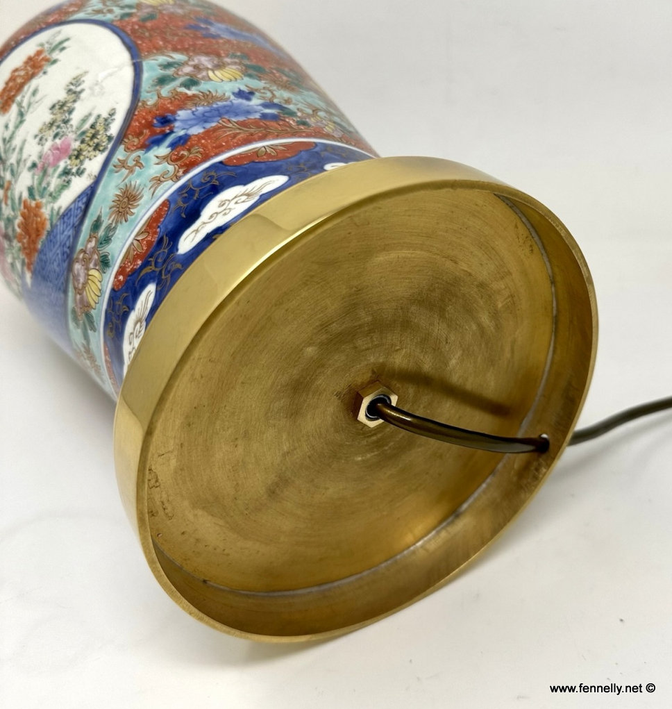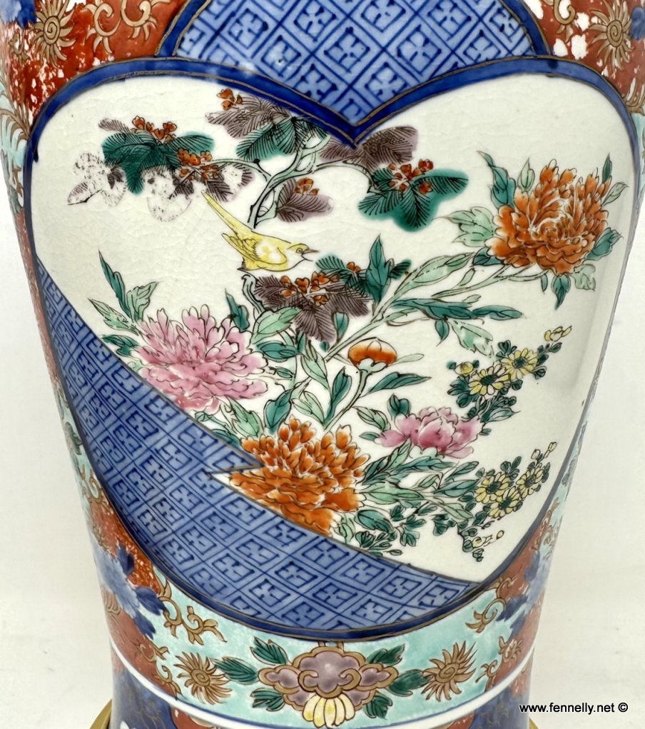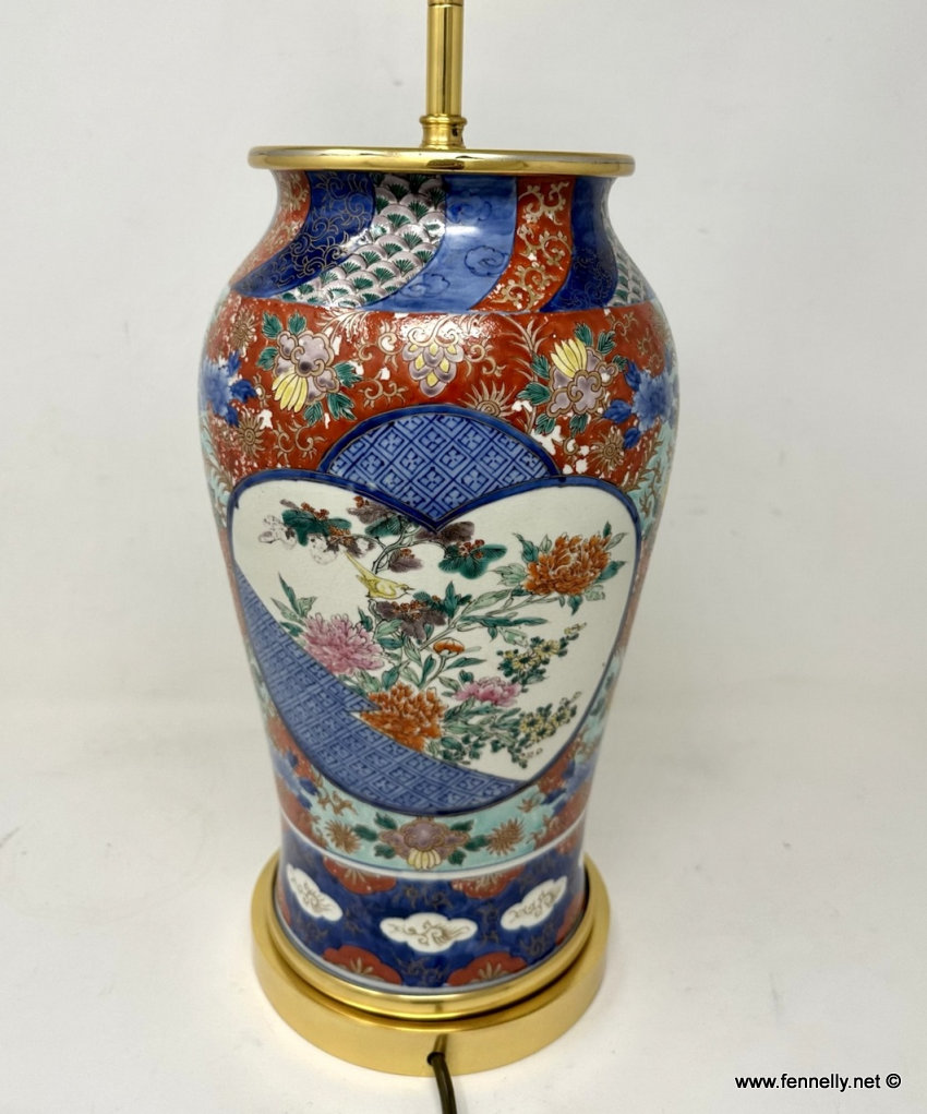 Pair Traditional Japanese Imari Bulbous Form Porcelain Vases of medium to large proportions, now converted to a pair of electric Table Lamps, complete with ormolu stepped circular bases and later ormolu mounts. Second half of the Nineteenth Century.