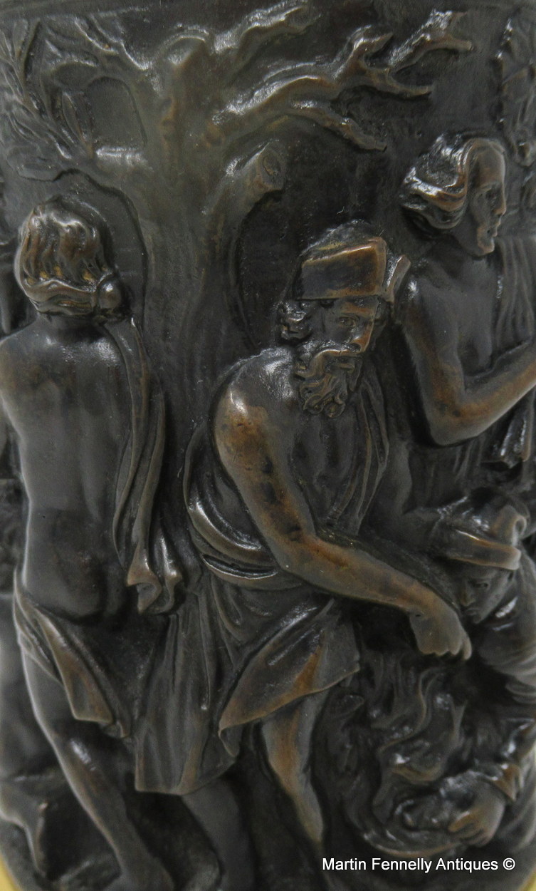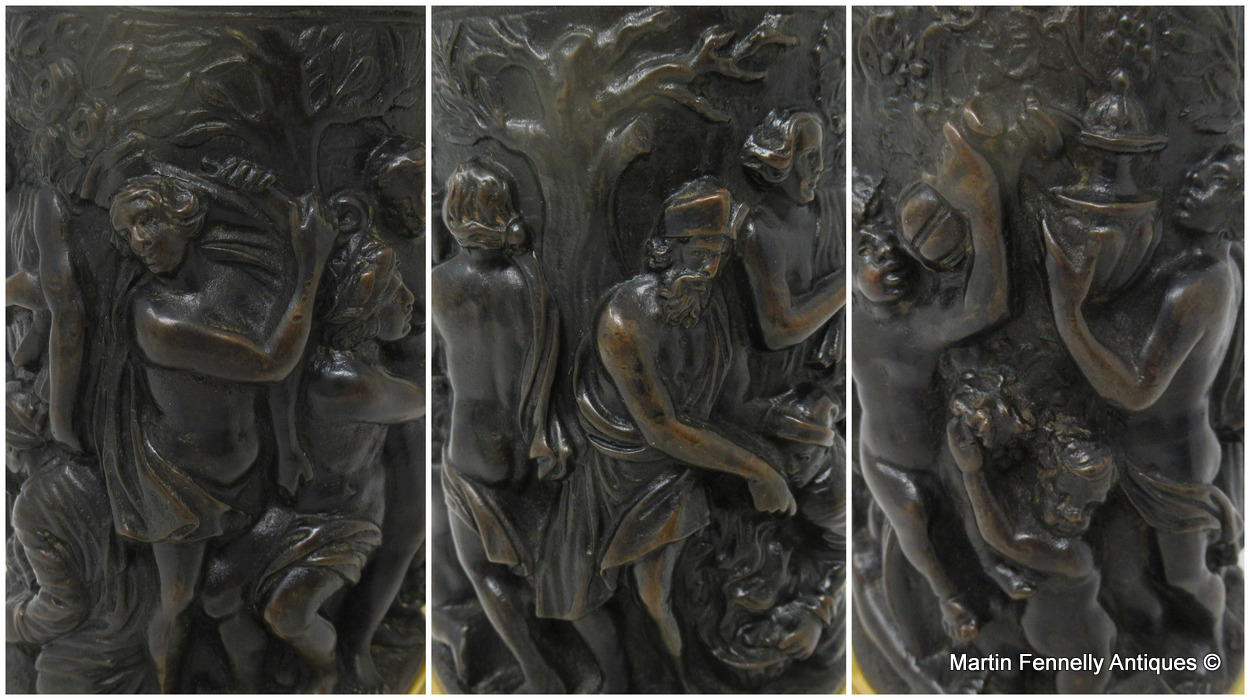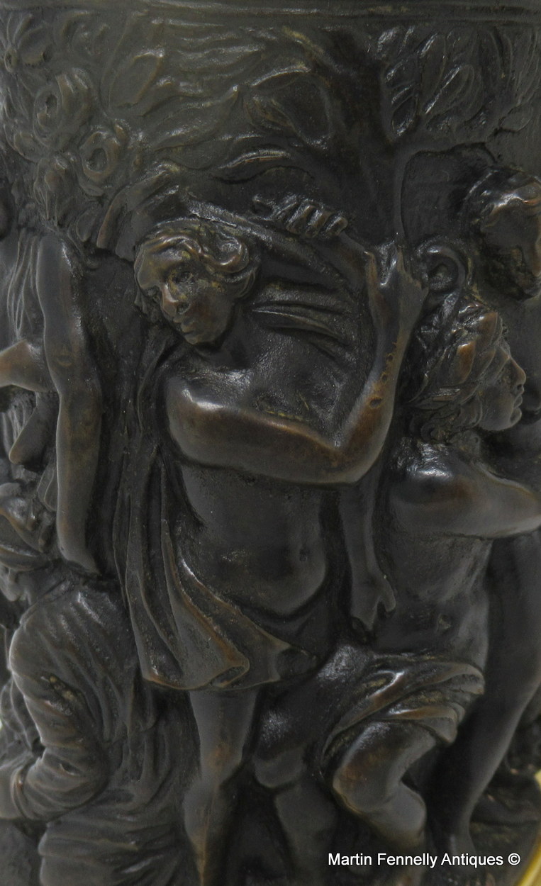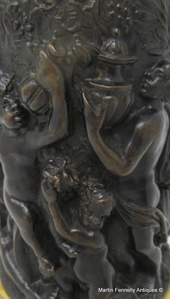 The hinged dome shaped cover with acorn capped finial above a cylindrical body which is cast in high relief depicting a continuous decorative scene of a Bacchanalian Revel Banquet, attended by a Cherub holding grapes, ending on a reeded ormolu spreading base. The “S” scroll handle mounted with a Caryatid figure of a female.
